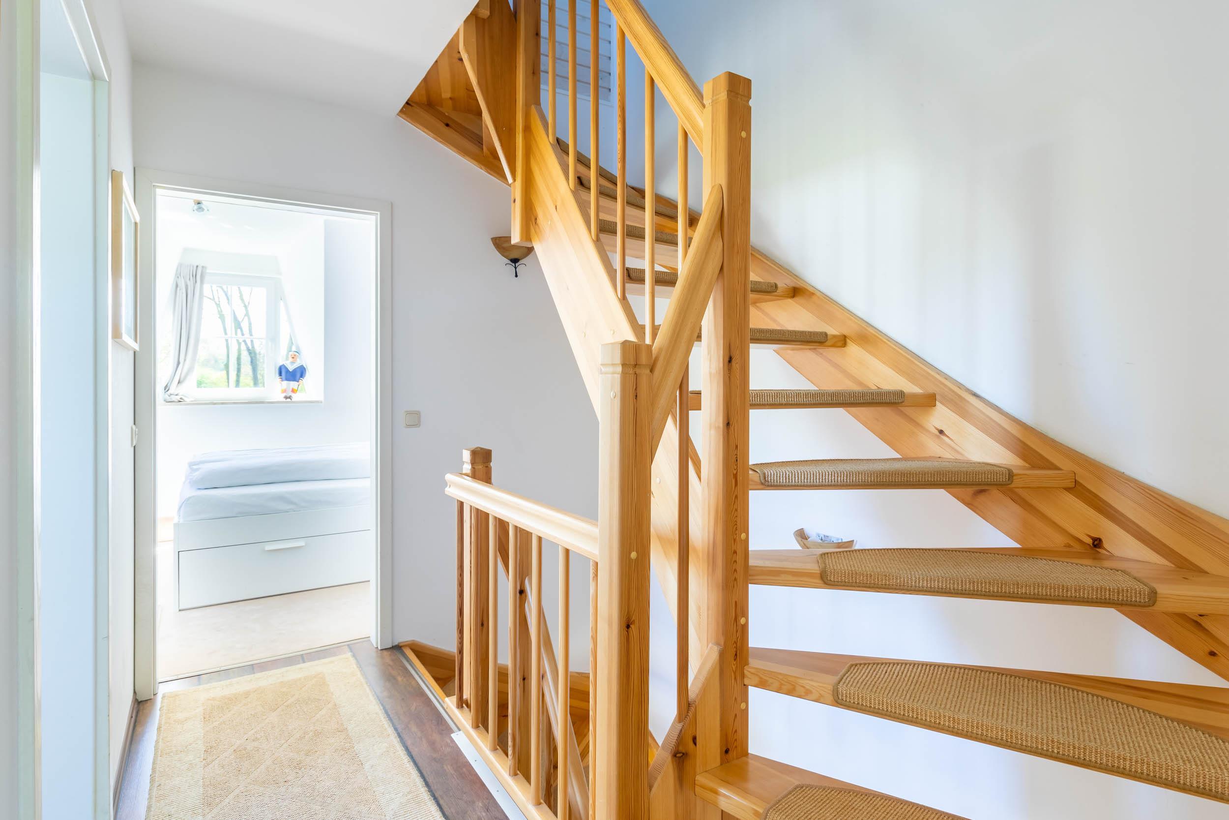 Die Fenster vom Wohnbereich und Schlafzimmer im EG sind mit Außenrollos ausgestattet. Auch die oberen Schlafmöglichkeiten lassen sich gut mit Vorhängen u.ä. abdunkeln. Für unsere kleinsten Gäste steht ein Hochstuhl kostenlos im Haus zur Verfügung. Wenn Sie sich ein Reisebettchen mitbringen oder bei uns eines gegen Gebühr ausleihen, können Sie dieses in sämtlichen Räumen im Haus aufstellen, da überall ausreichend Platz dafür ist.