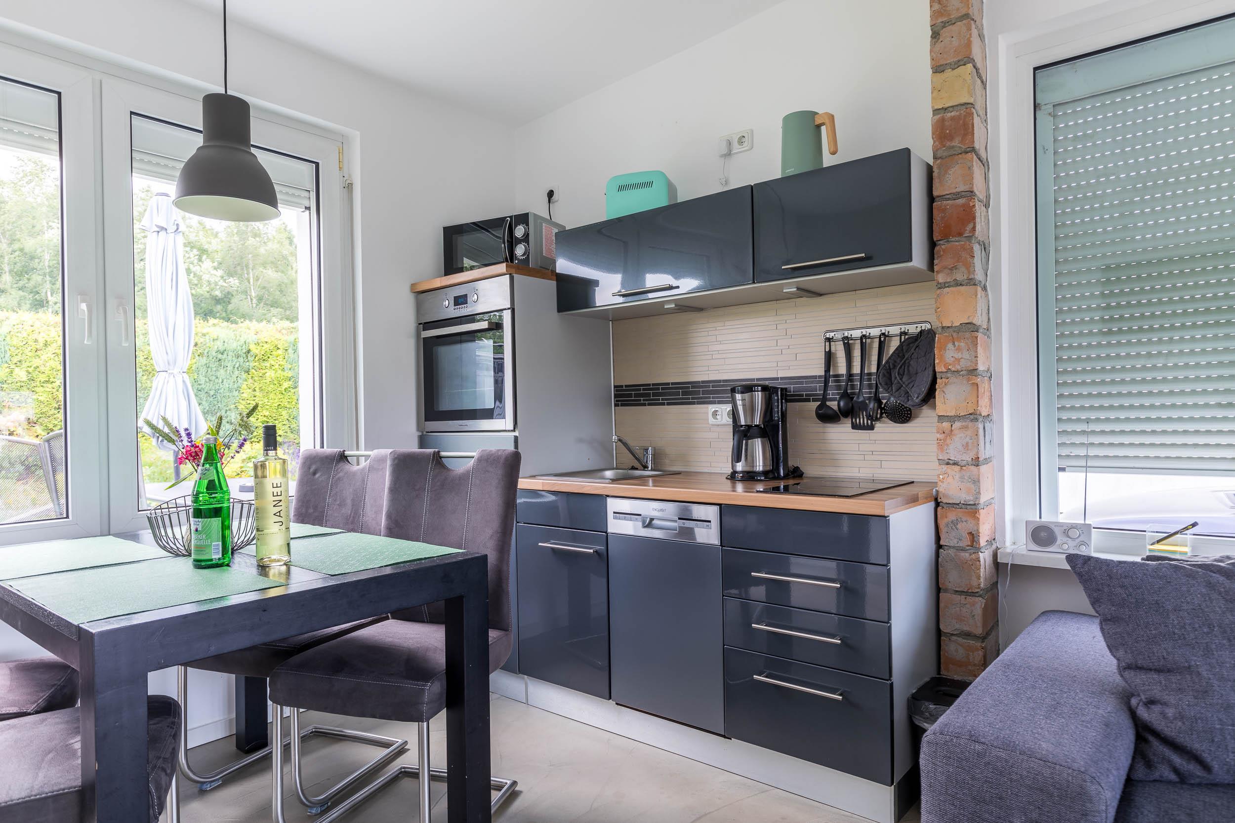 Starten Sie mit einem guten Frühstück in den Tag, die Küchenzeile ist mit allem ausgestattet, was Sie für eine Selbstverpflegung benötigen. Am vorhandenen Esstisch können Sie Ihre Mahlzeiten einnehmen.