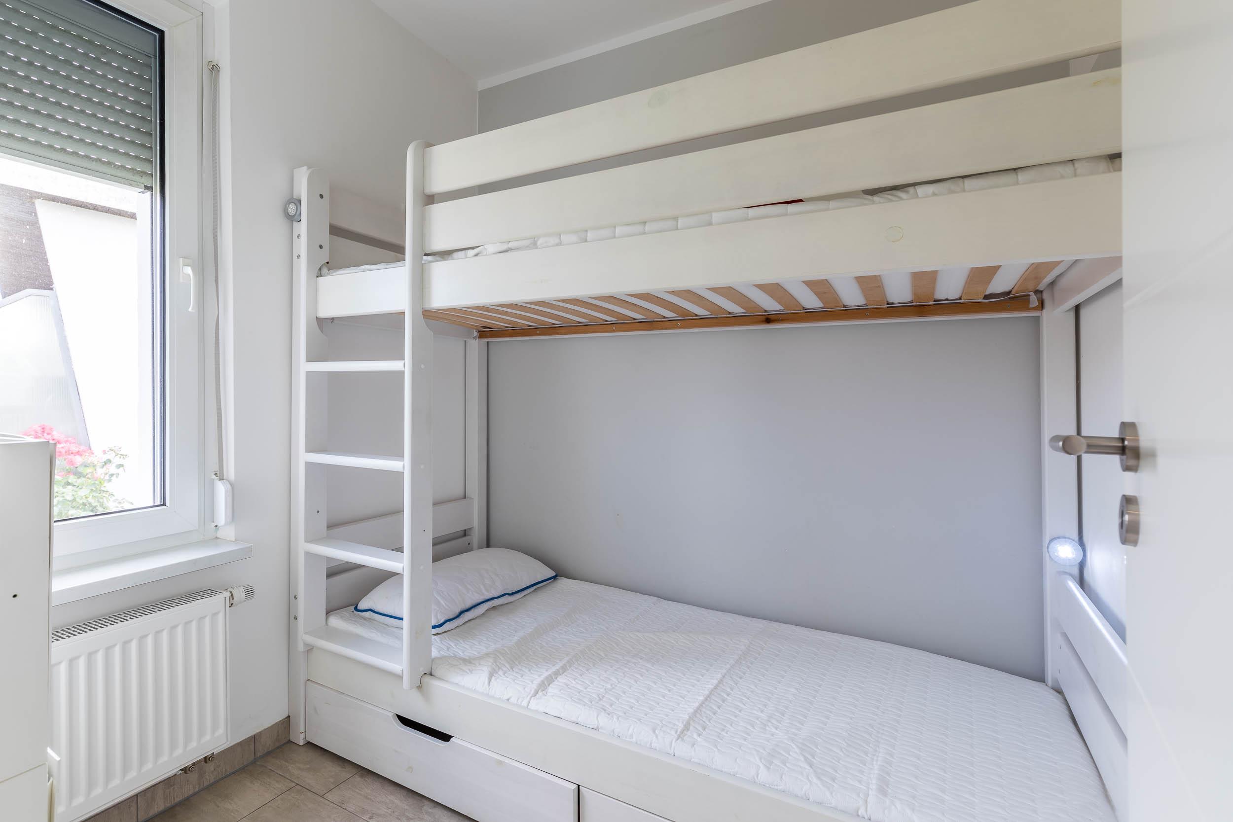 In den zwei separaten Schlafzimmern sorgen bequeme Betten für erholsame Nächte. Das größere Schlafzimmer bietet ein Doppelbett mit Kommoden, im Kinderzimmer finden Sie ein tolles Etagenbett.