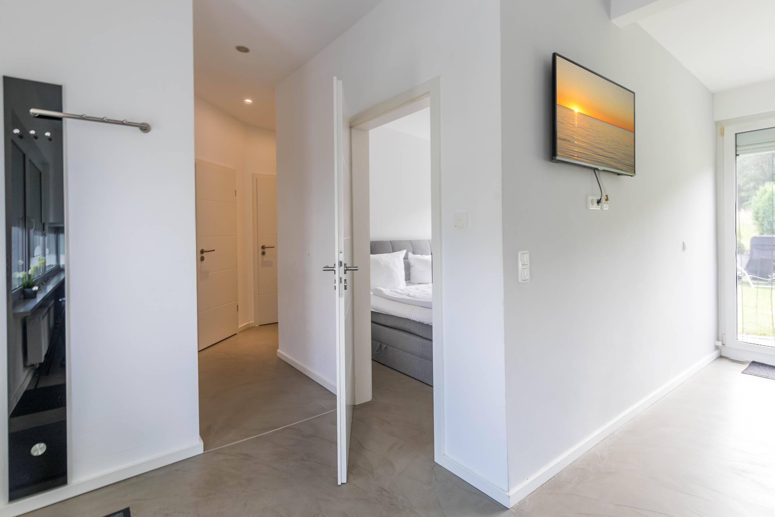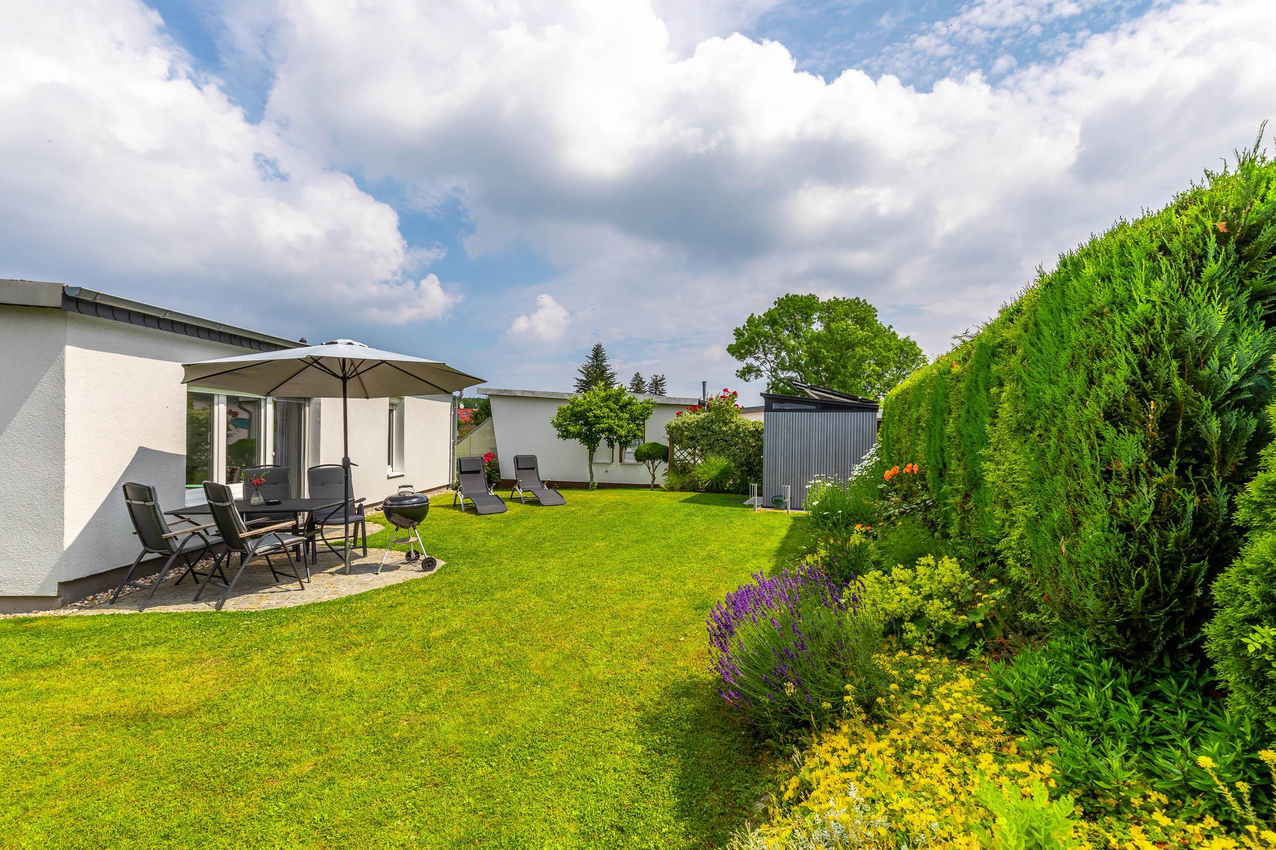 Eine optimale Raumaufteilung und die modere Einrichtung sorgen für Urlaubsfeeling. Der helle Wohnbereich mit TV und der direkte Zugang zum großen Garten schaffen Wohlfühlatmosphäre. Machen Sie es sich auf der Couch gemütlich und genießen die Ruhe.