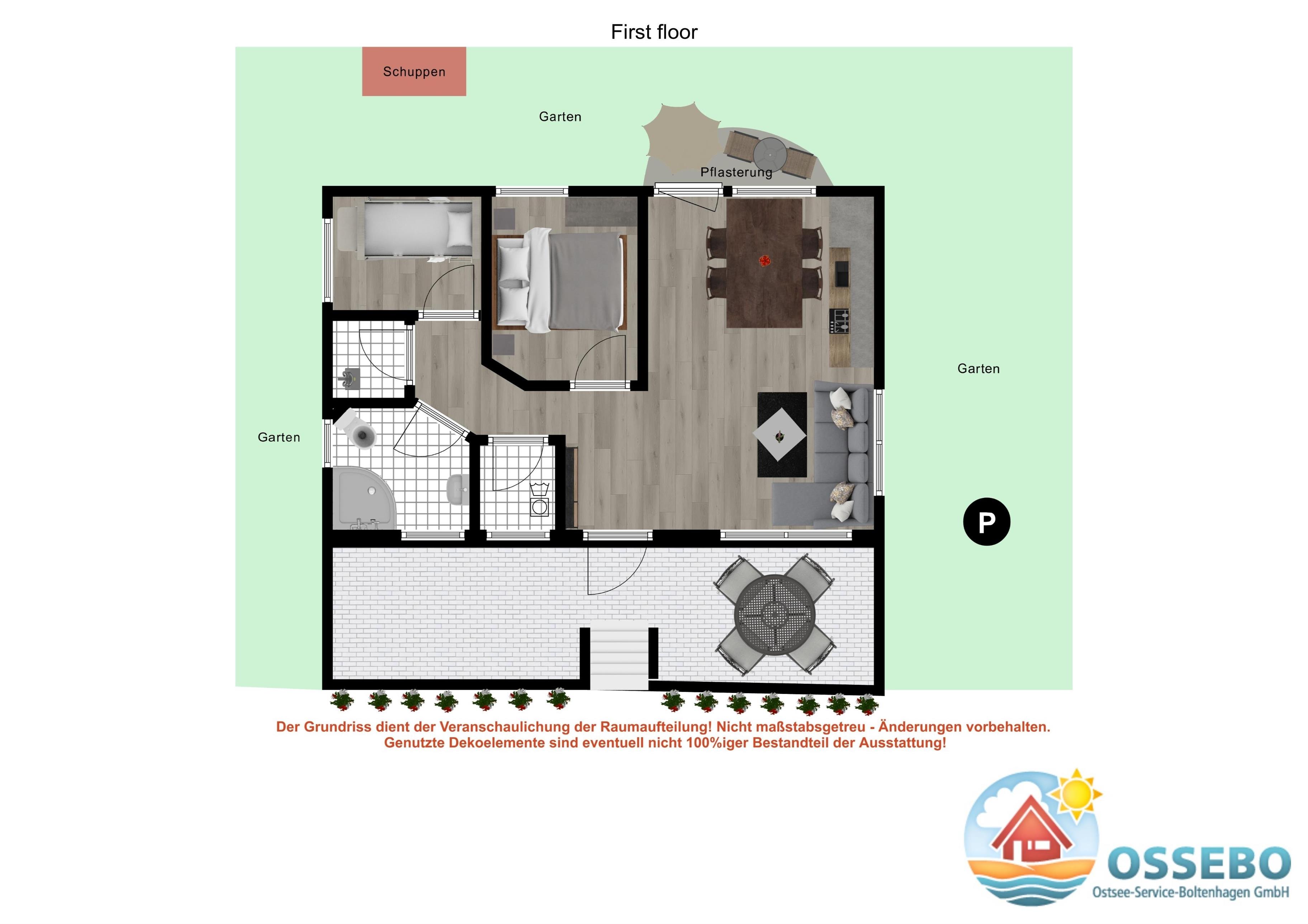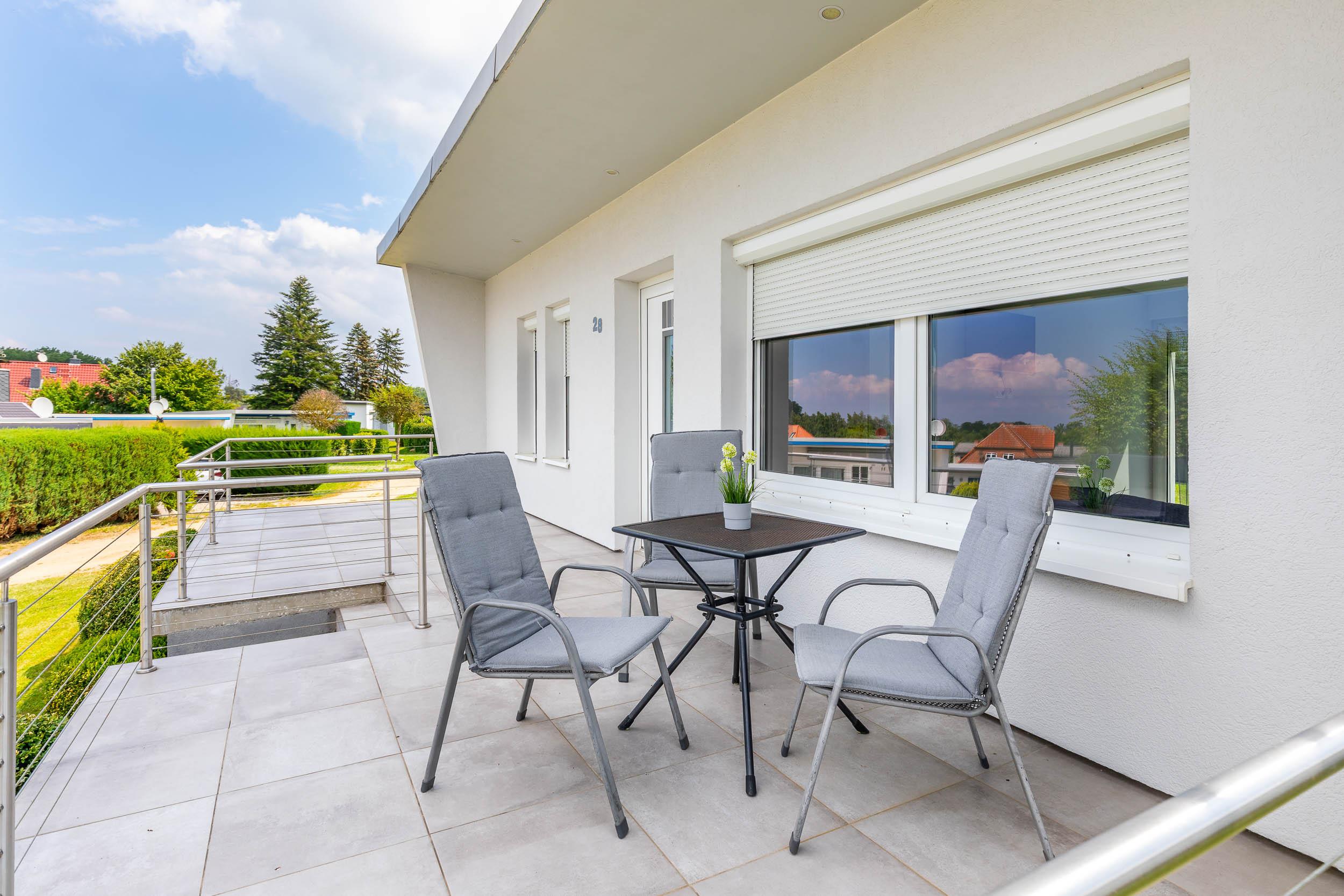 Auf den beiden möblierten Terrassen mit Gartenmöbeln können Sie die herrlich frische Ostseeluft genießen. Die größere Terrasse am Eingang geht Richtung Norden, die kleinere Terrasse mit dem angrenzenden Grundstück und Sonnenliegen ist nach Süden ausgerichtet.