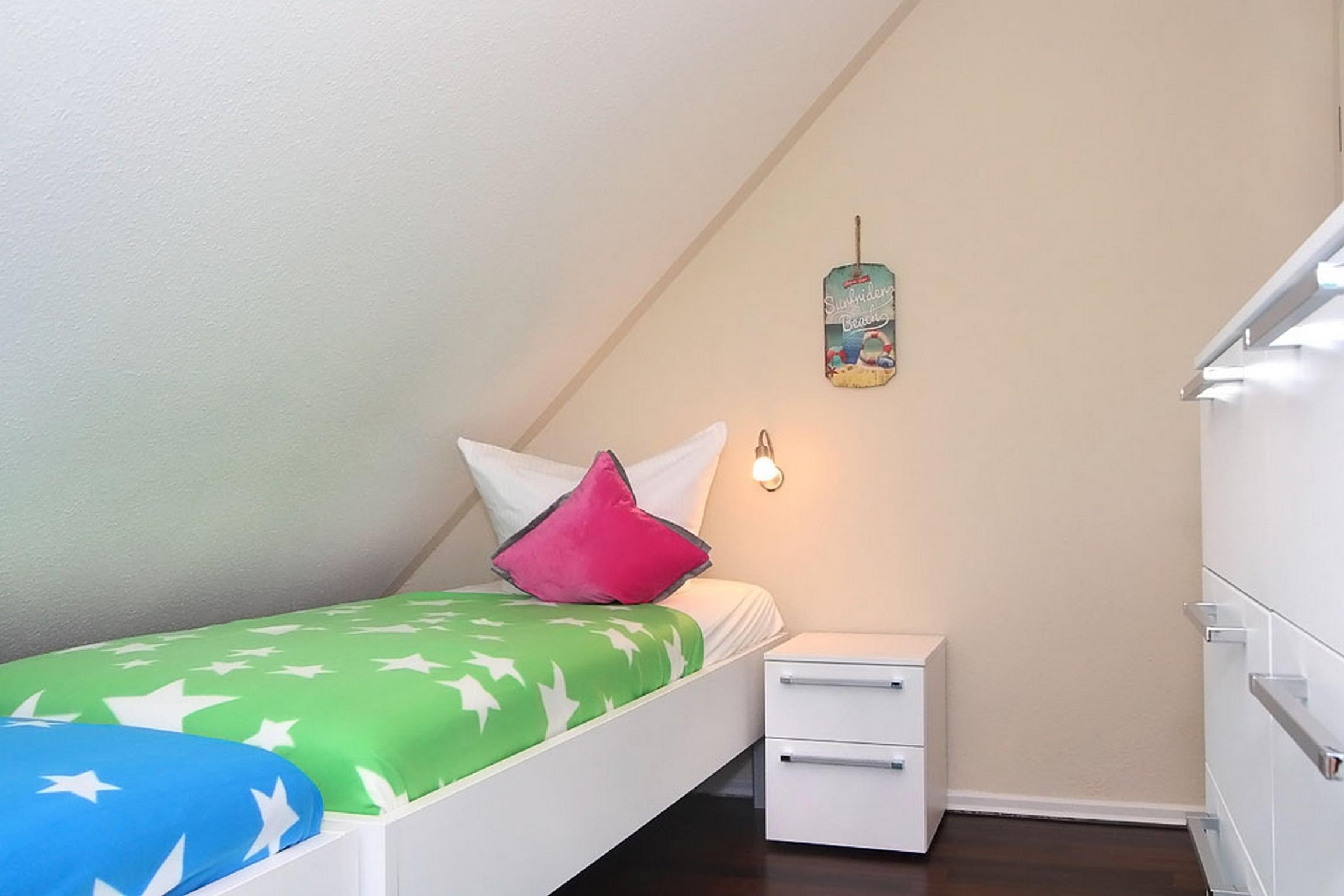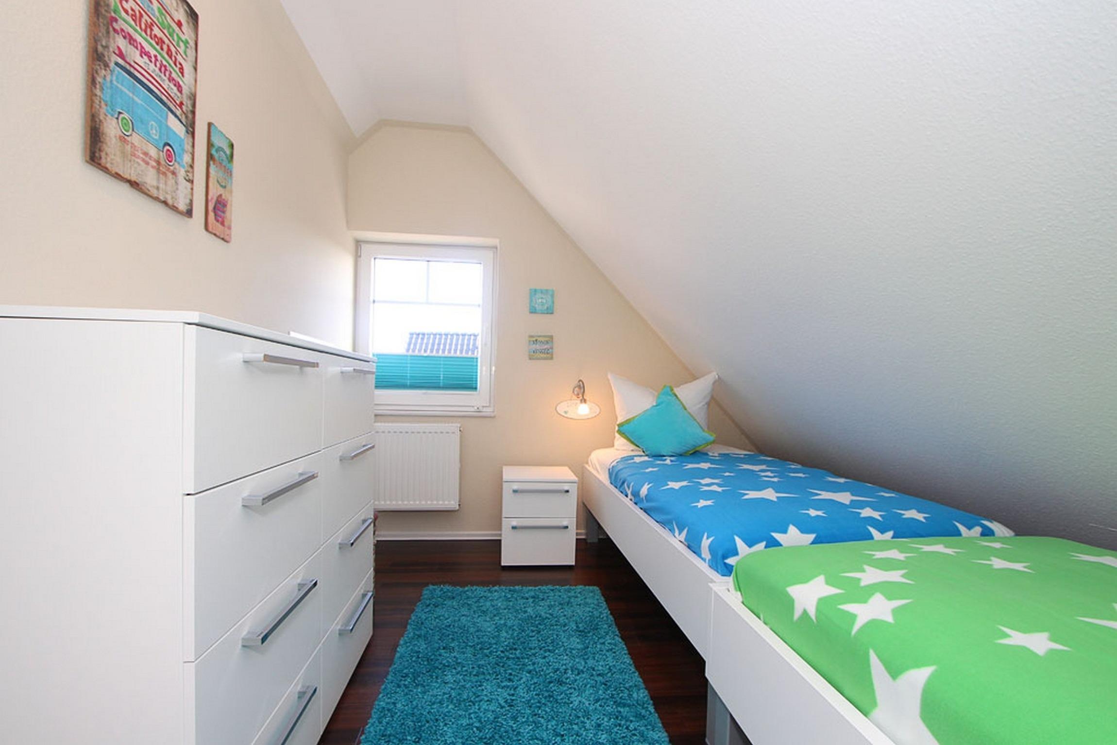 In der dritten Ebene (im DG), welche Sie über eine offene Holztreppe mit Treppenschutzgitter (oben) erreichen, befindet sich das Gäste-/ Kinderzimmer, das über zwei Einzelbetten (je 90x200cm) verfügt. Ein Reisebettchen könnte hier bei Bedarf auch aufgestellt werden. In der kleinen separaten Leseecke im Dachgeschoss können Sie gern mit einem schönen Buch entspannen.