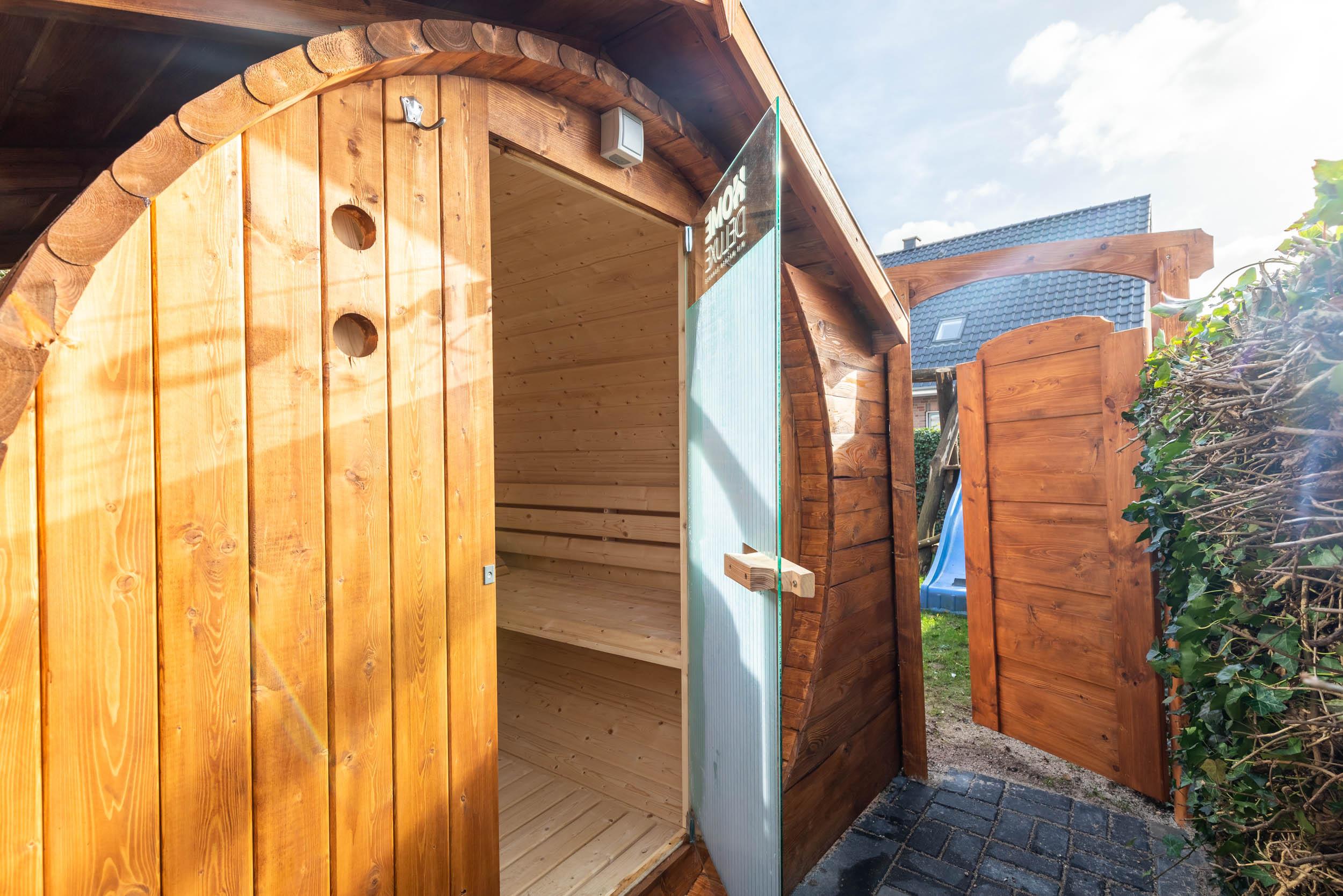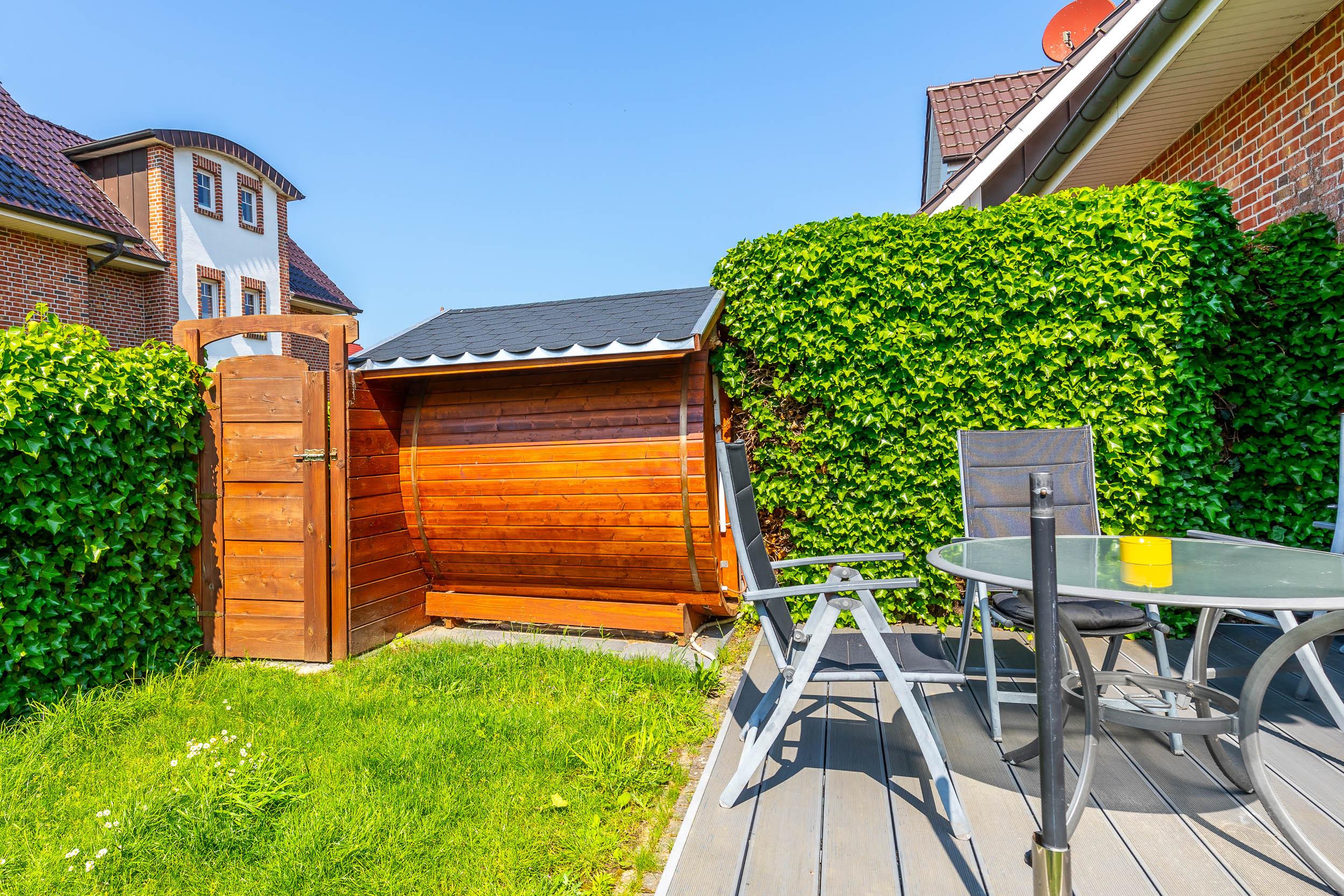 Die Fass-Sauna, welche sich auf dem hauseigenen Grundstück zwischen Haus 1 und 1a befindet, kann sowohl von den Gästen von Haus 1 als auch von den Gäste von Haus 1A kostenfrei genutzt werden. Gleichzeitig trennt die Sauna beide Grundstücke voneinander.