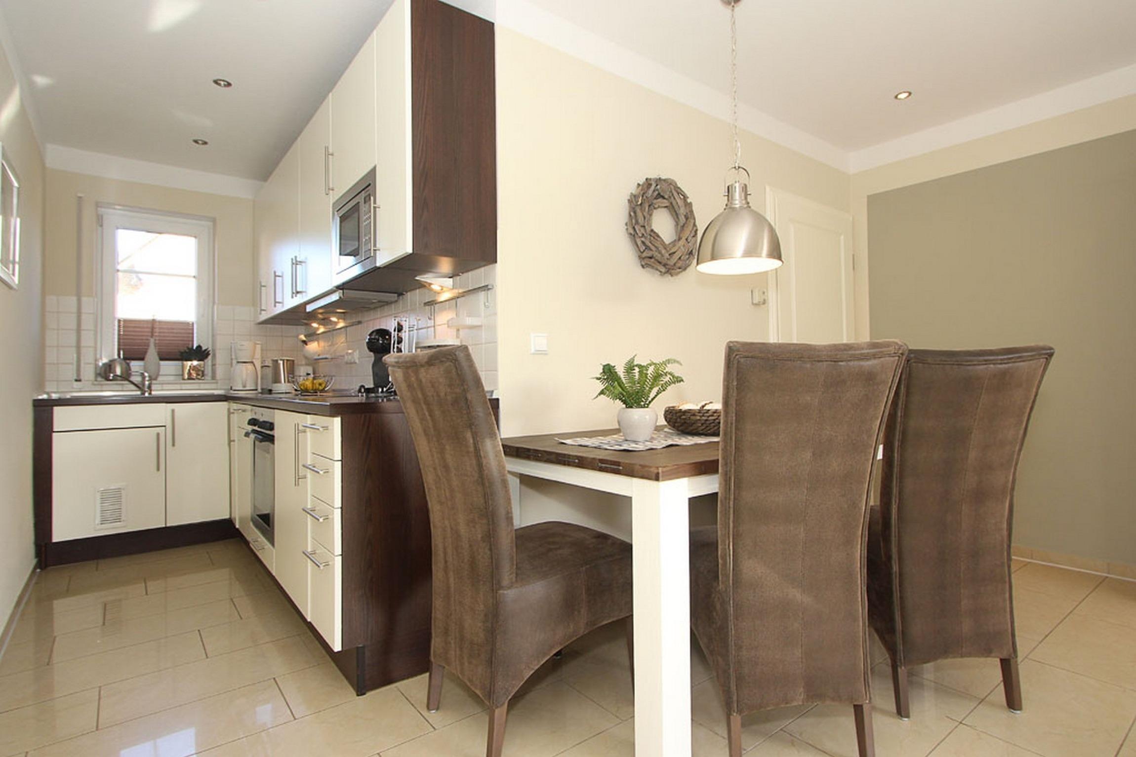 Im Erdgeschoss verfügt die Unterkunft über einen offenen Wohn- und Essbereich mit einer modern ausgestatteten offenen Küchenzeile mit Spülmaschine und Mikrowelle .