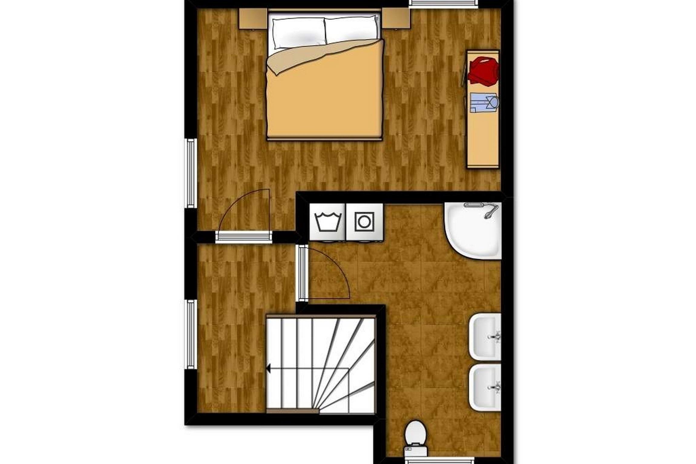 Auf der zweiten Ebene (im 1.OG), welche Sie über eine geflieste Treppe erreichen, befindet sich ein Schlafzimmer mit Doppelbett (180x200cm) und geräumigem Kleiderschrank sowie SAT-TV.
