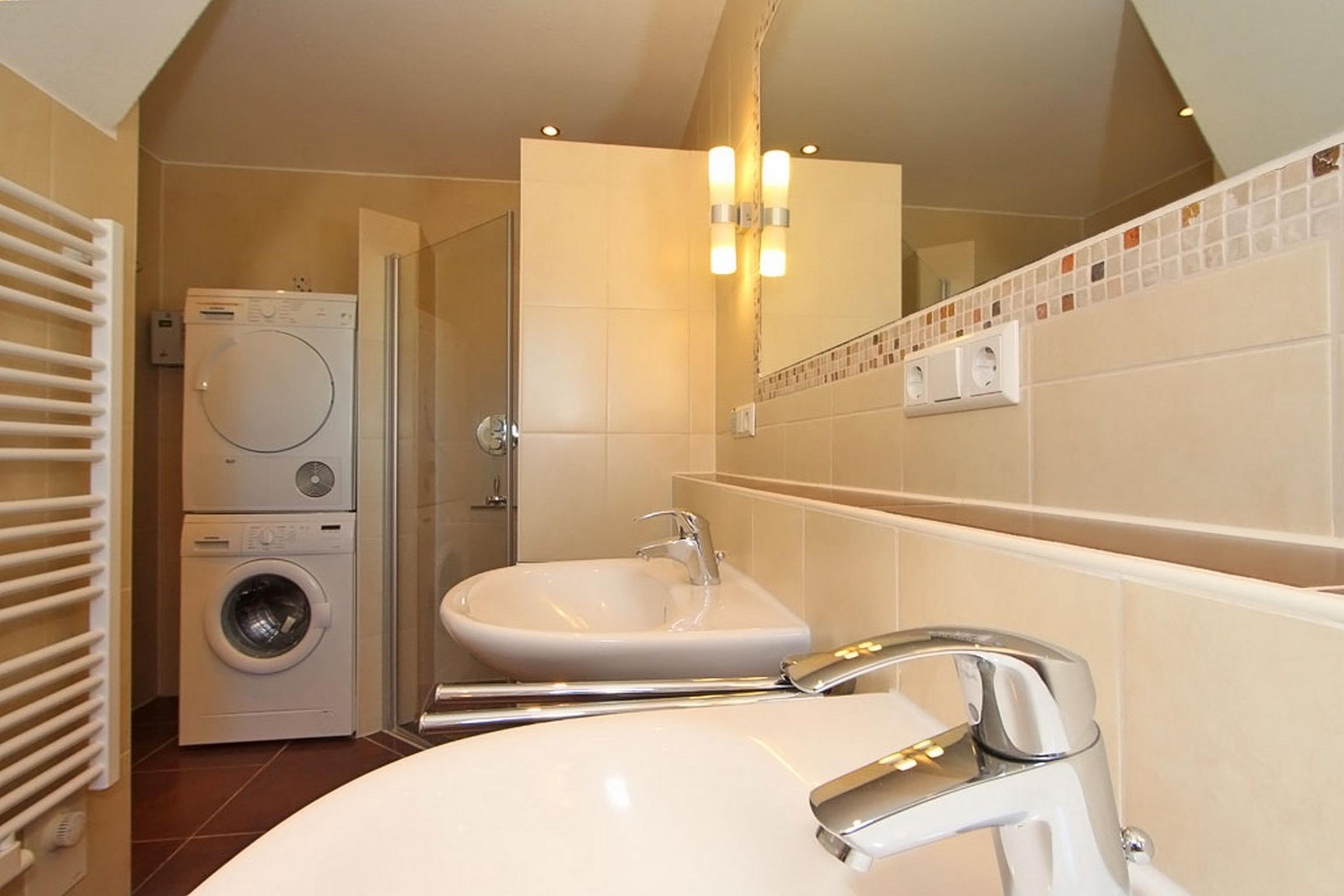Das familienfreundliche Duschbad auf dieser Etage ist mit zwei Waschbecken sowie mit Waschmaschine und Trockner (beides gegen Münze nutzbar) ausgestattet, die Sie gerne nutzen können. Das Fenster spendet Tageslicht und erleichtert das Lüften, z.B. nach dem Duschen.