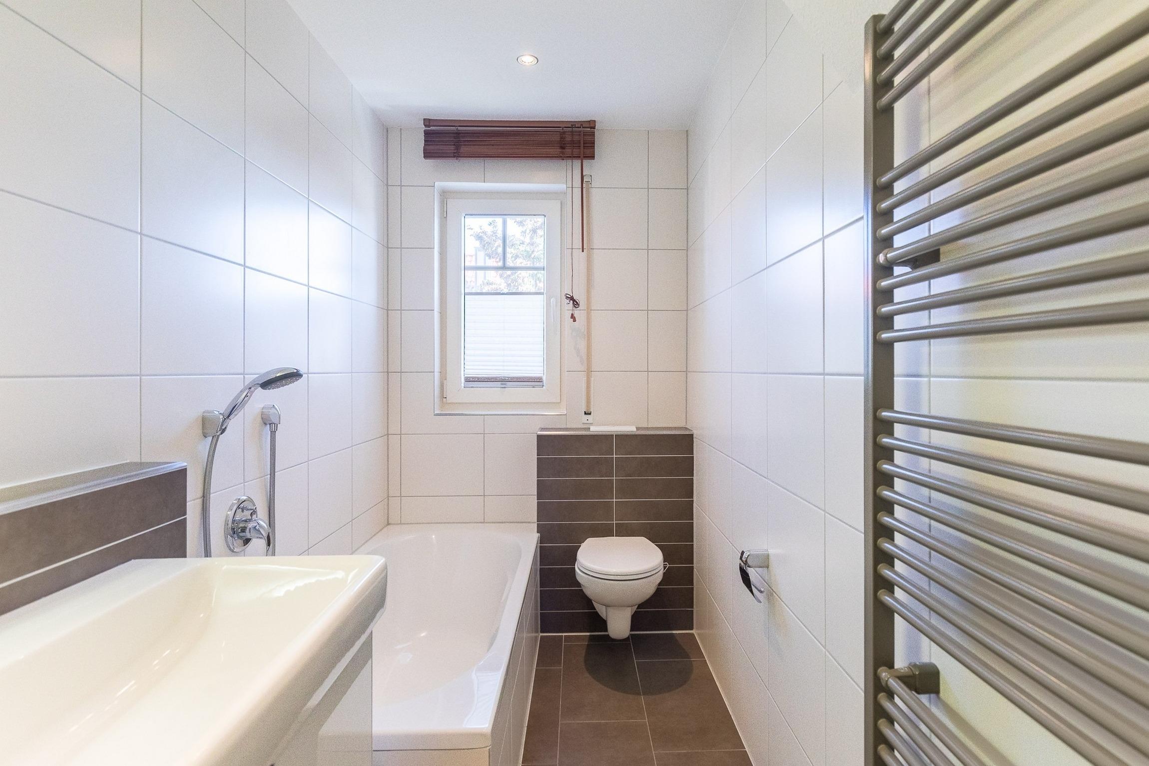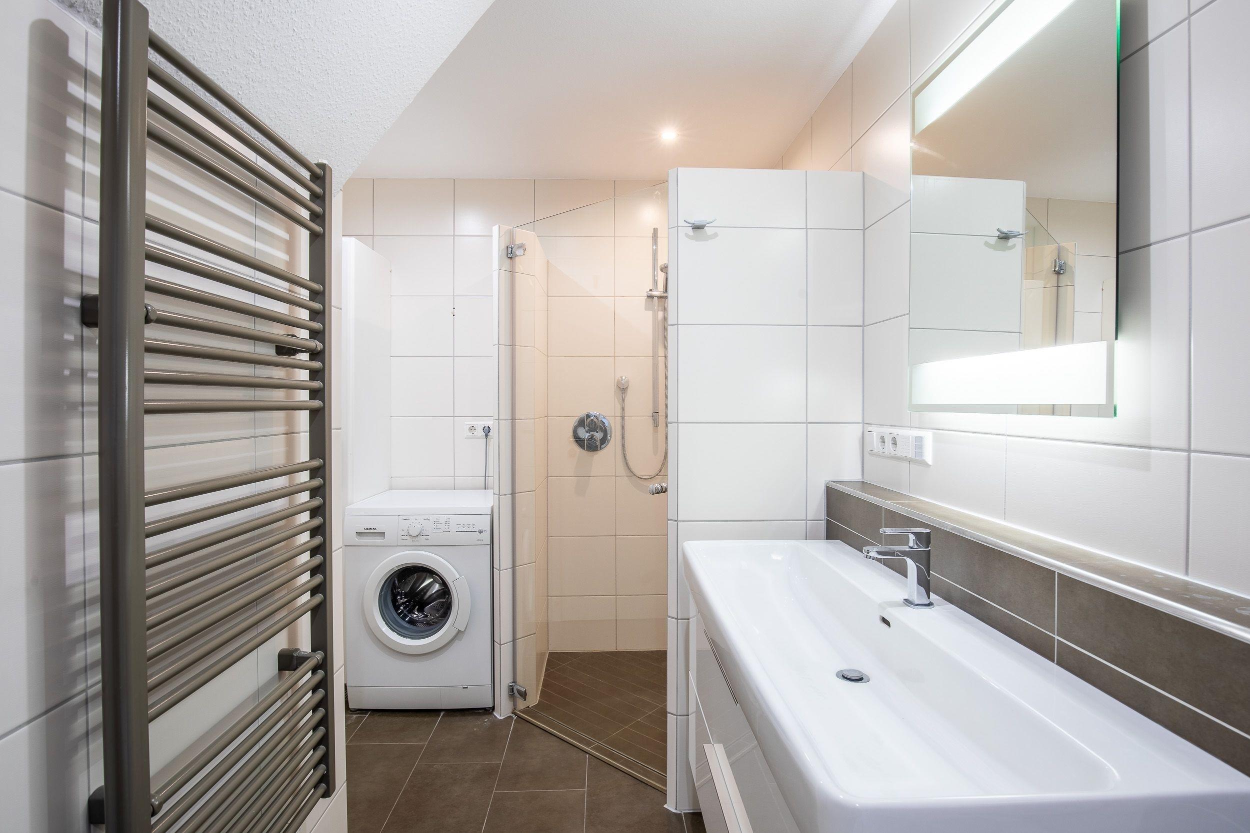 Das familienfreundliche Badezimmer auf dieser Etage ist mit einer ebenerdigen Dusche (1cm Höhe), Badewanne und WC ausgestattet. Die Waschmaschine kann hier bei Bedarf kostenfrei genutzt werden. Das Fenster spendet Tageslicht und erleichtert das Lüften, z.B. nach dem Duschen oder Baden.
