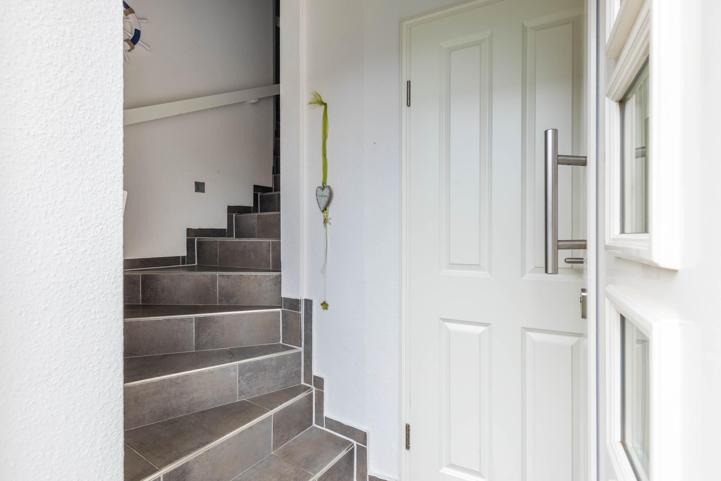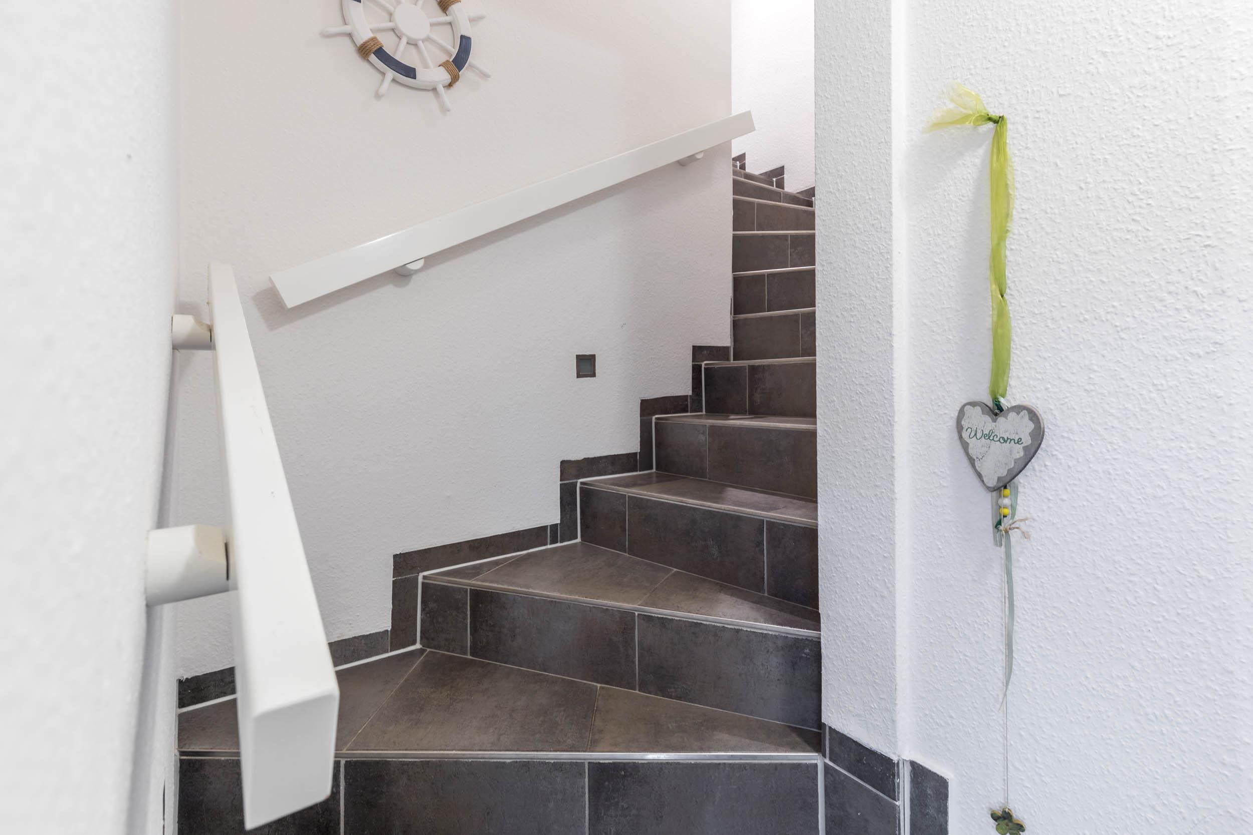 Eine geflieste Treppe führt Sie ins Dachgeschoss (2. Wohnebene):
