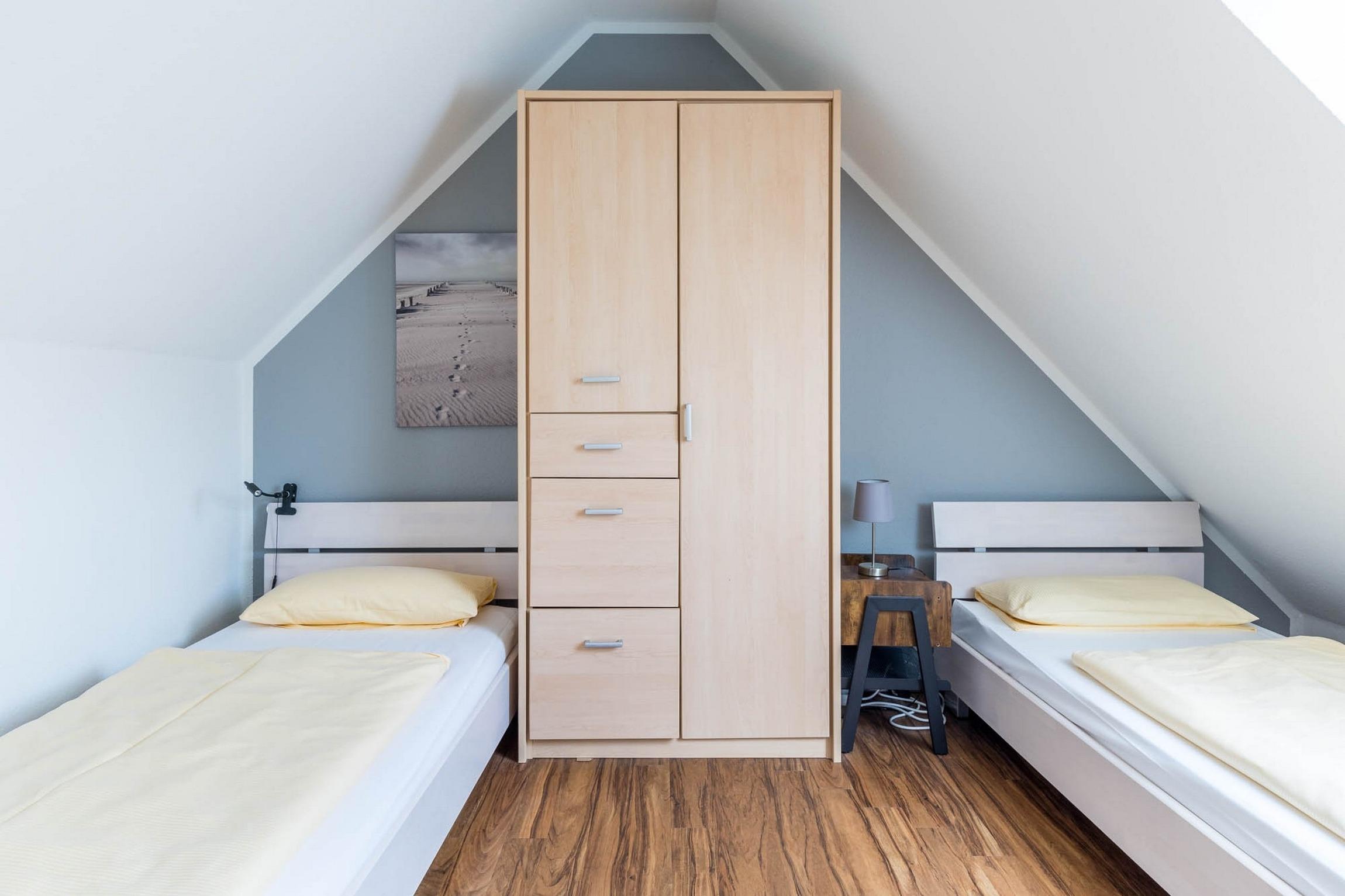 Auf dieser Etage sind zwei weitere Schlafräume - eins mit zwei Einzelbetten (je 80x200cm) und einem Doppelbett (160x200cm) eingerichtet. In beiden Schlafräumen könnten Sie bei Bedarf auch ein Reisebettchen aufstellen.