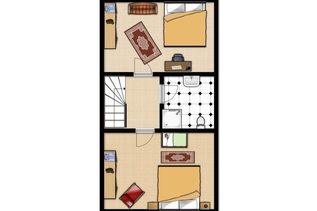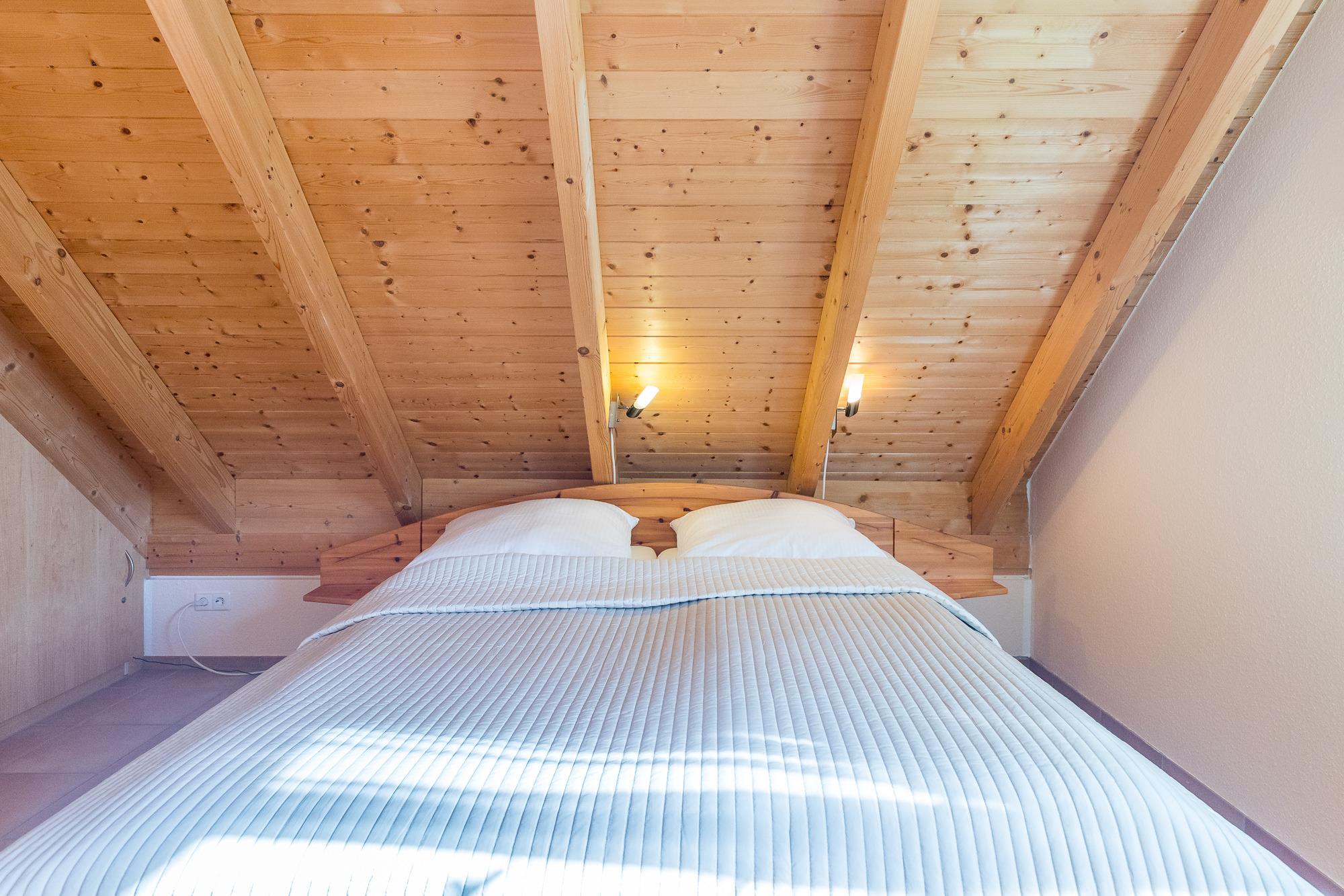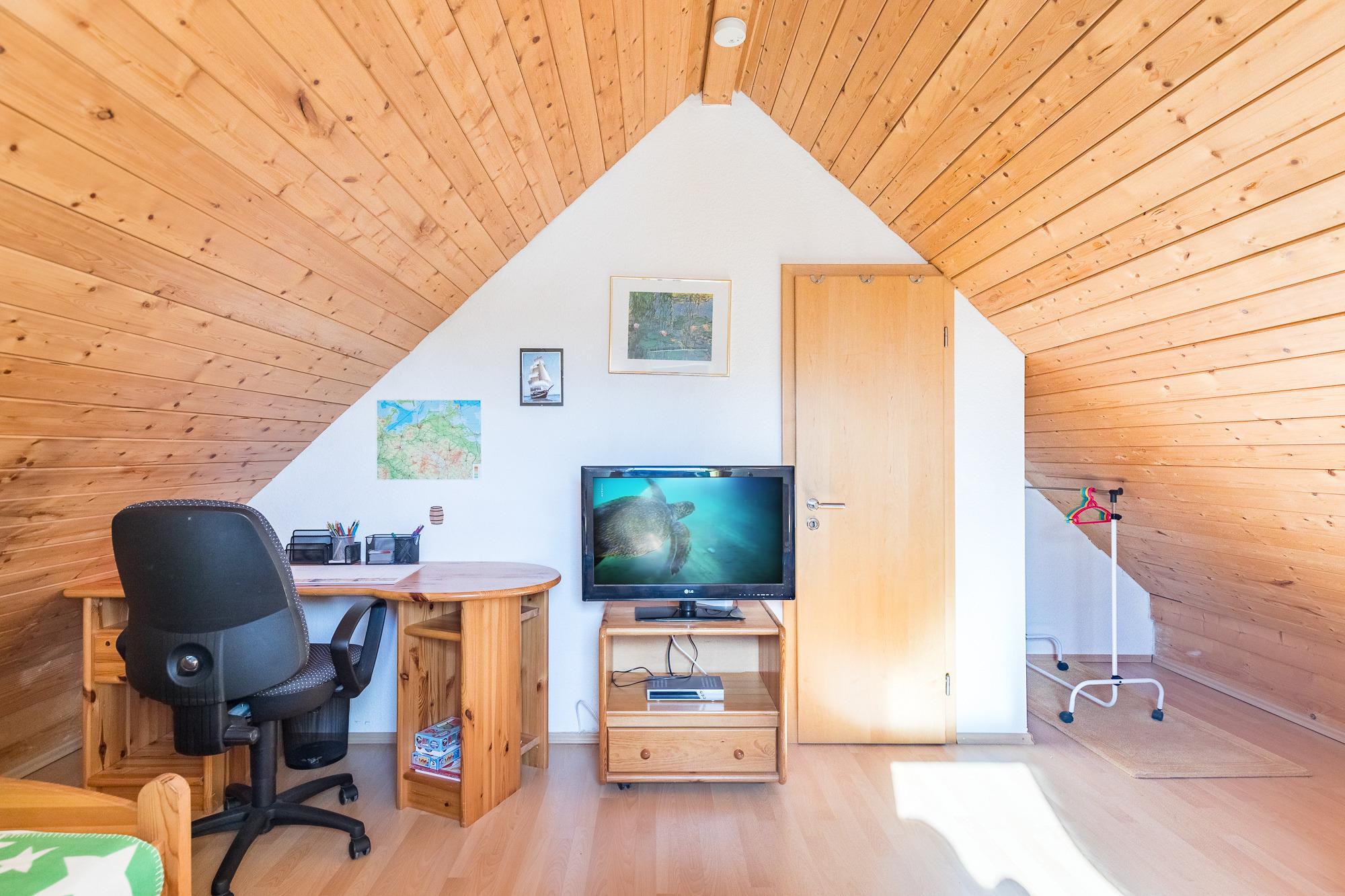 Ins Dachgeschoss als 3. Ebene gelangen Sie wieder über die Treppe vom Flur aus. Auf dieser Etage befindet sich das Gäste-/ Kinderzimmer mit 2 Einzelbetten. Auch dieses Zimmer bietet einen Flatscreen-TV, zudem einen Schreibtisch und auch eine kleine Sitzecke. Auf der Kleiderstange können einige Kleidungsstücke aufgehängt werden.
