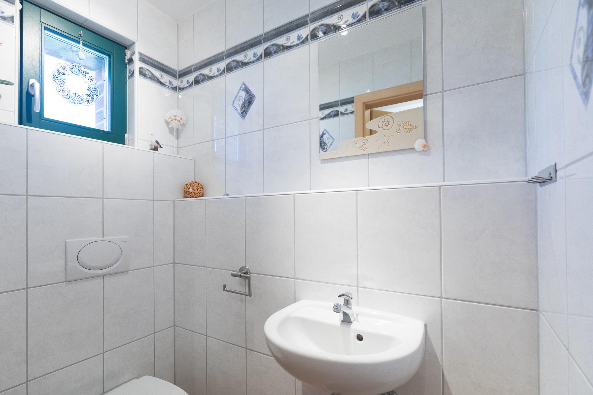 Ebenso befinden sich im Erdgeschoss auch ein Gäste-WC mit kleinem Fenster sowie ein Hauswirtschaftsraum mit Waschmaschine und Trockner.
