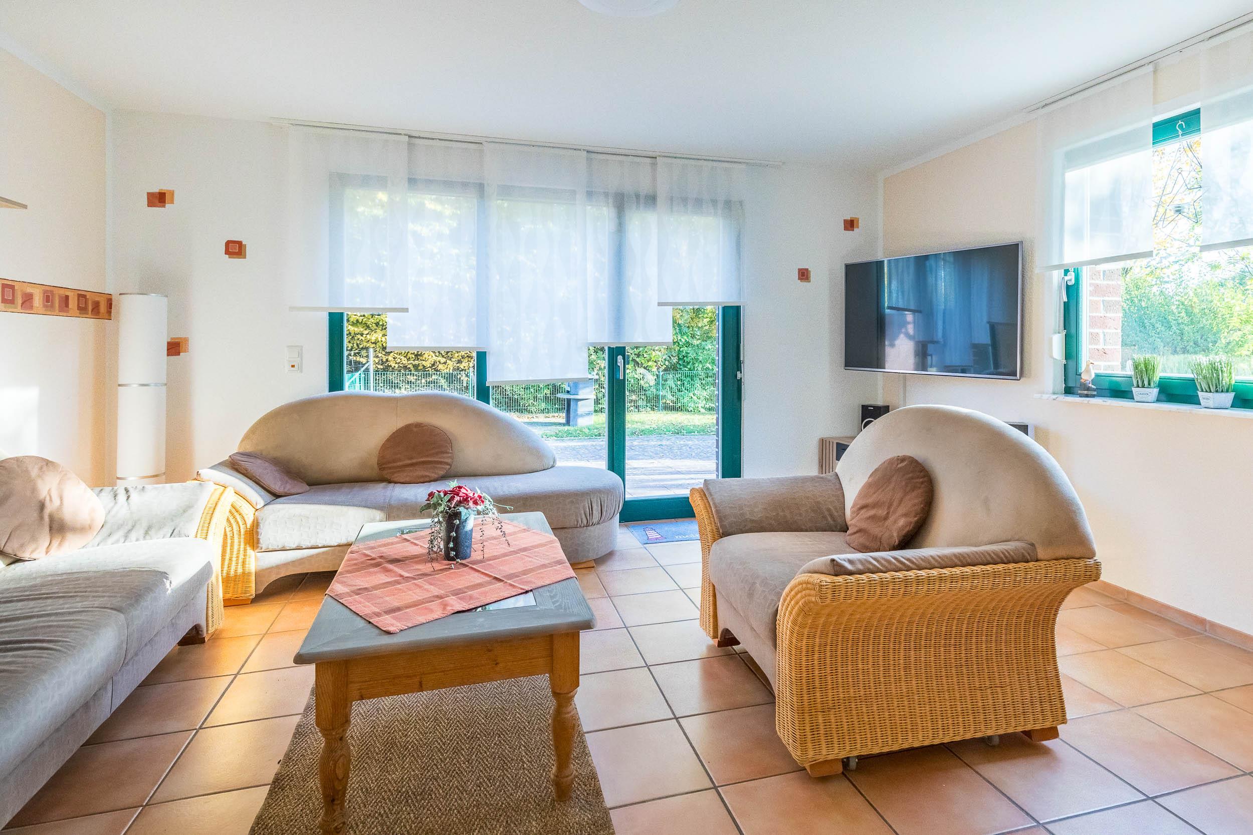 Die große Couchgarnitur und der Flatscreen-TV im Wohnzimmer laden zum gemütlichen Beisammensein ein. Von hier aus gelangen Sie auch auf die möblierte Südost-Terrasse mit eingezäuntem Grundstück herum.