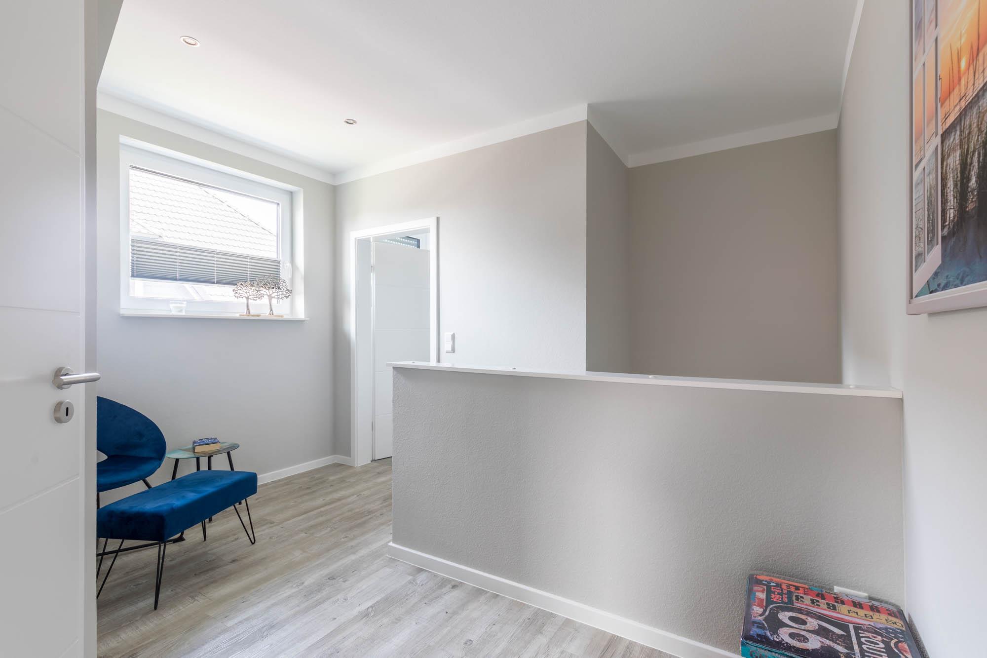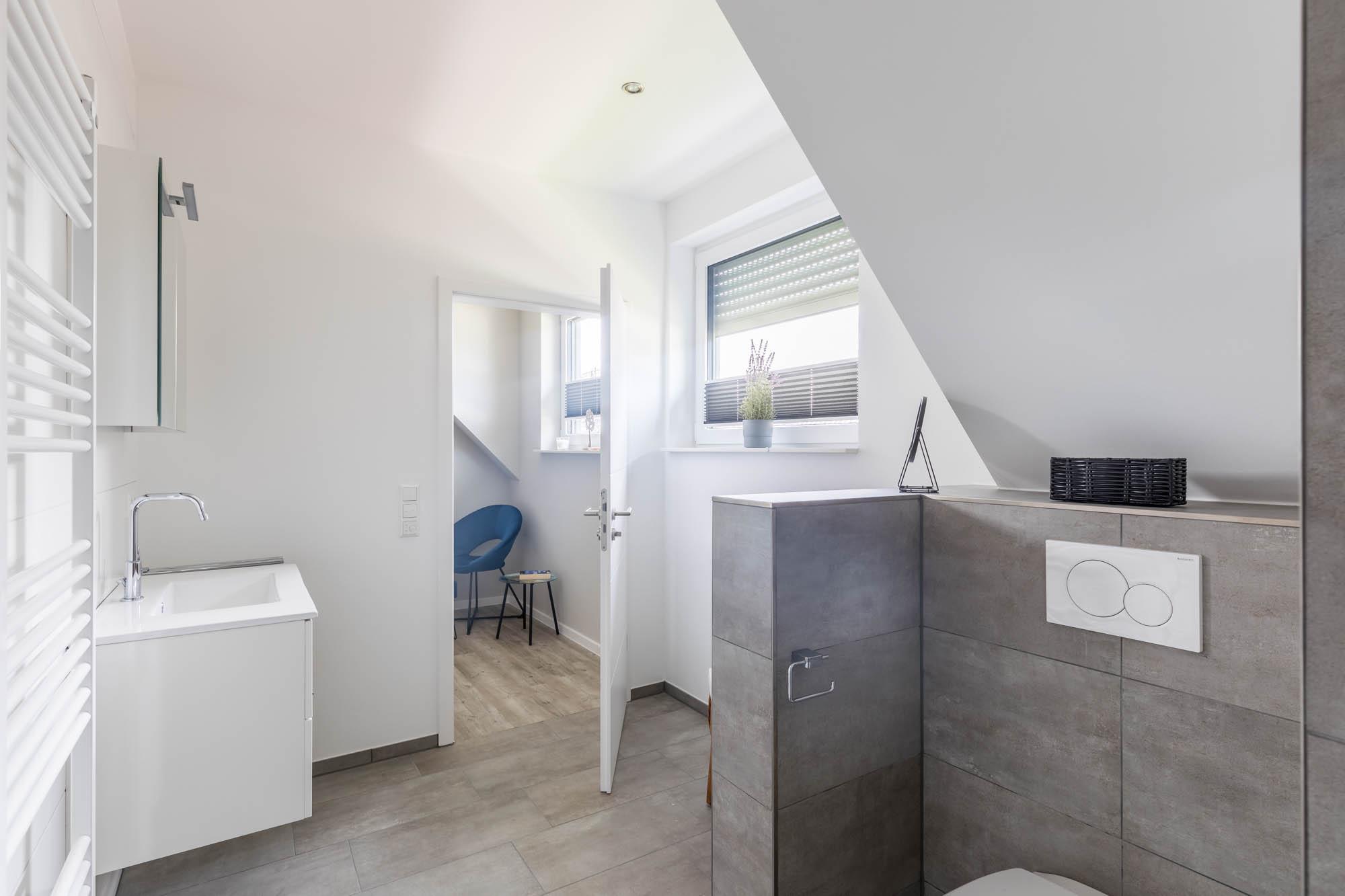 Auf dieser Wohnebene finden Sie ein zweites modernes Bad, welches ebenfalls mit bodengleicher Dusche, WC und Fenster ausgestattet ist.