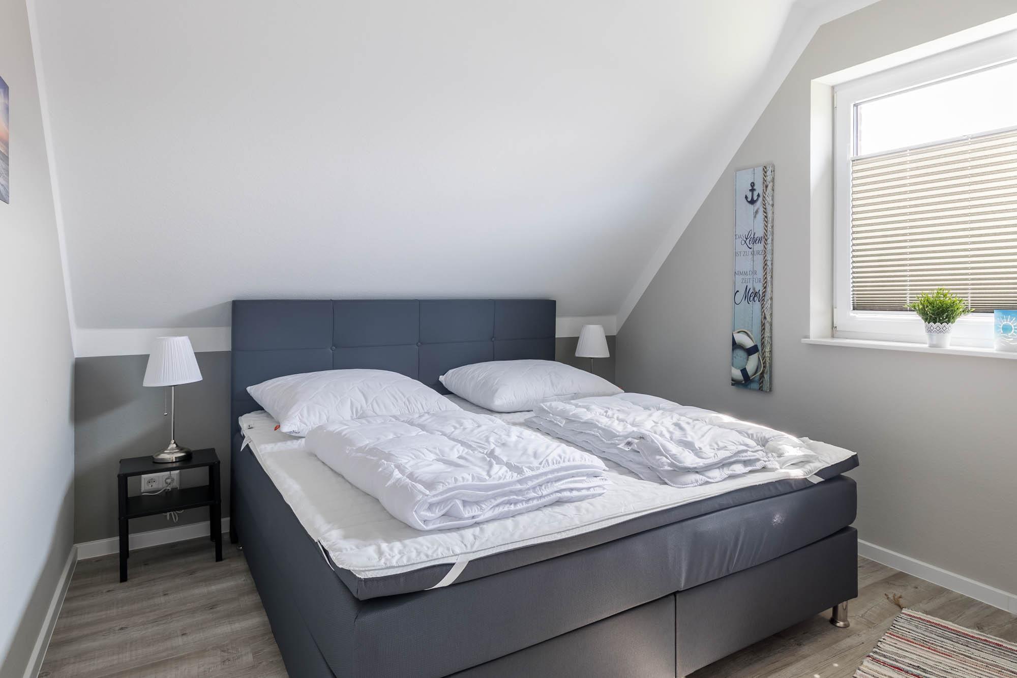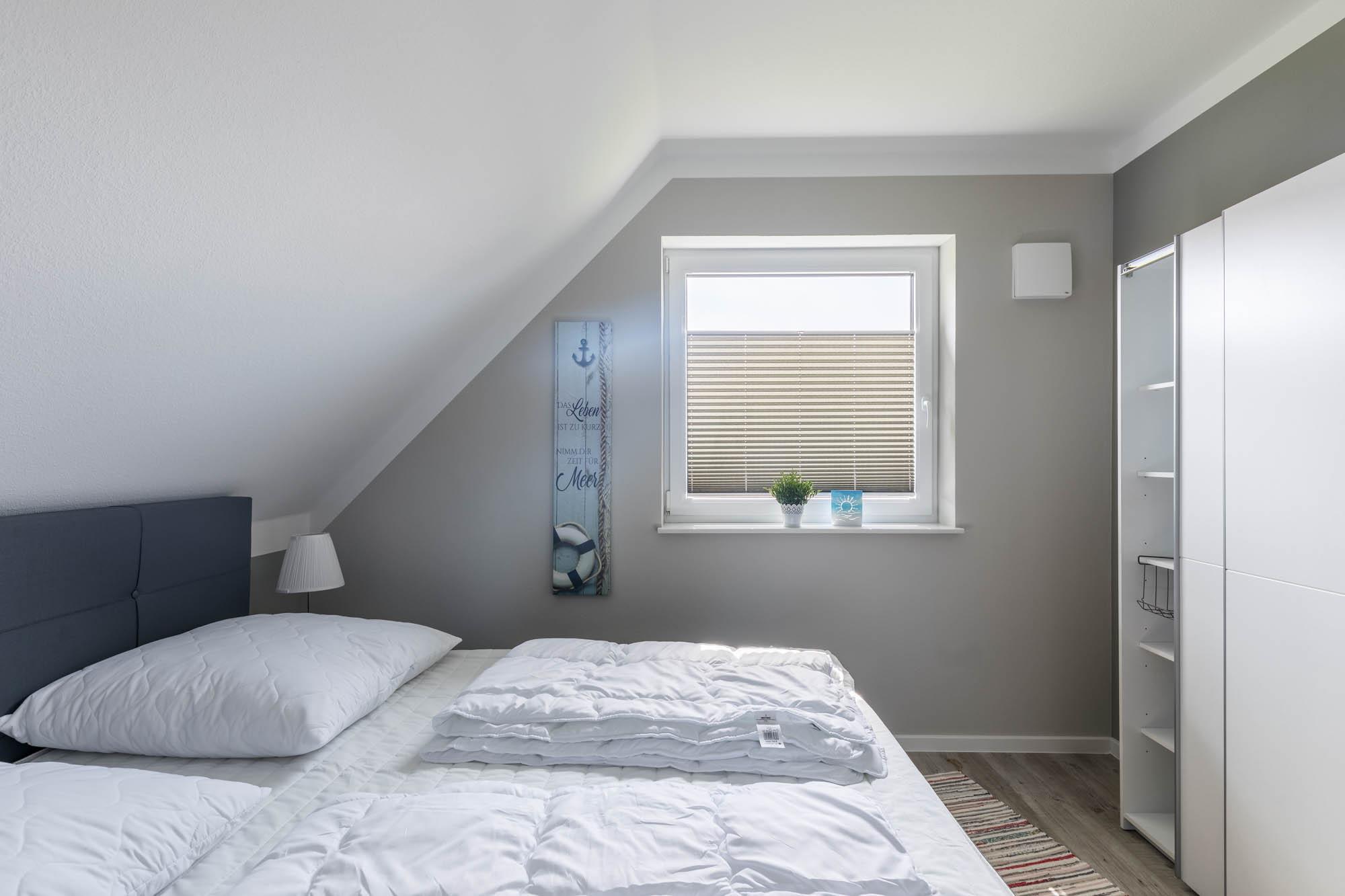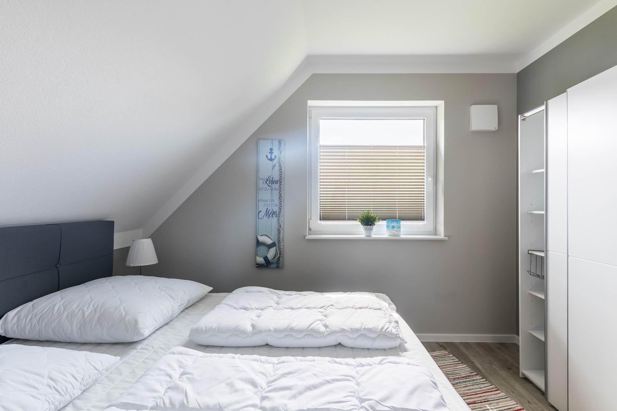 Eines der insgesamt drei Schlafzimmer finden Sie ebenfalls im Erdgeschoss, dieses ist mit einem Doppelbett (180x200cm) und einem Kleiderschrank ausgestattet. Ein Reisebettchen könnte in diesem Schlafzimmer auch noch mit aufgestellt werden.