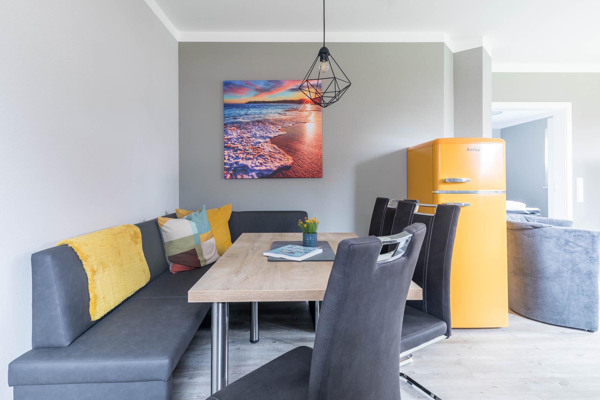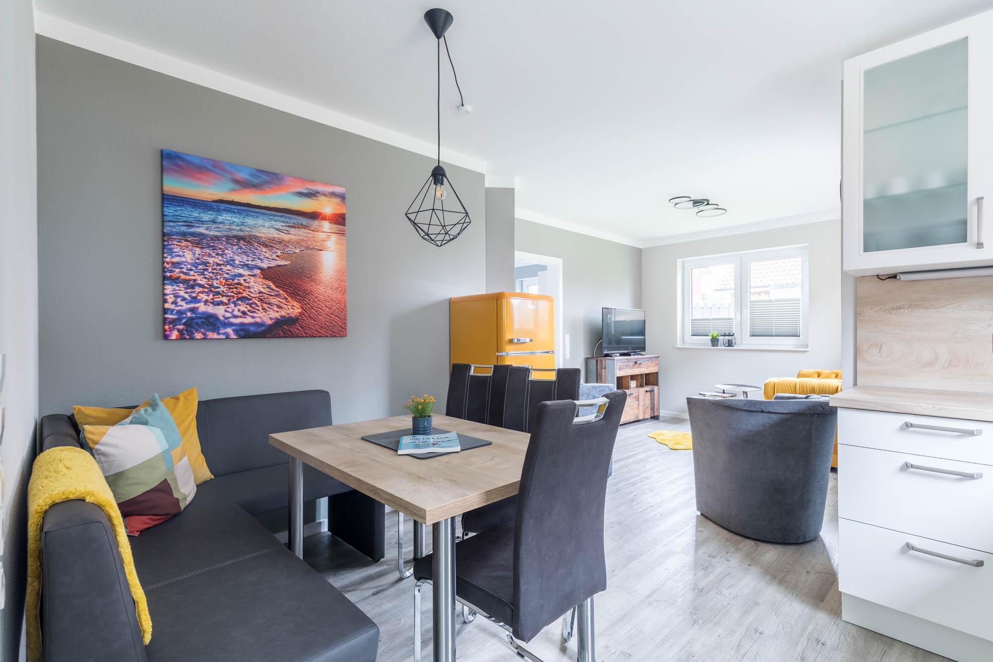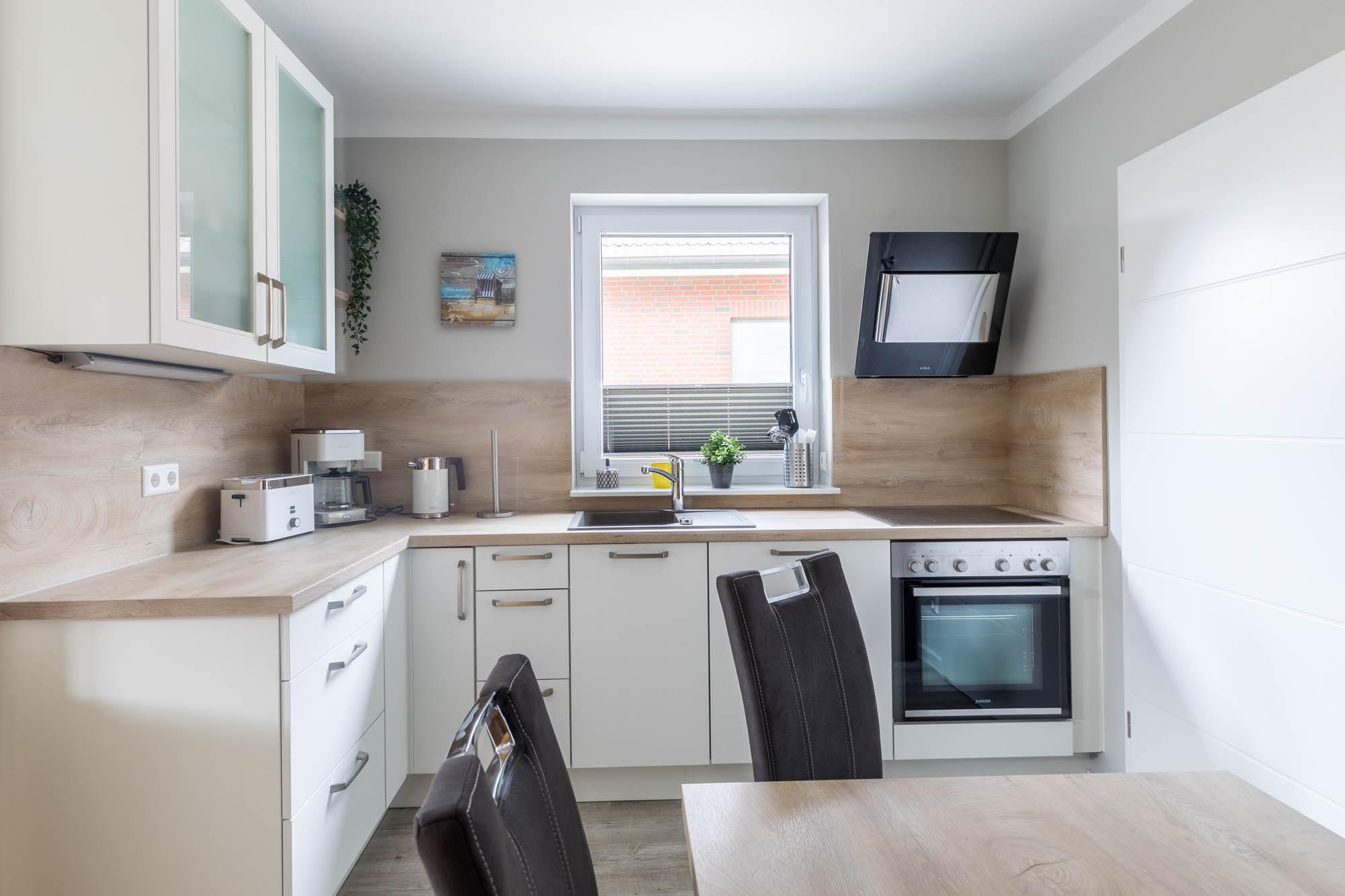 Die moderne Küche ist zum Wohnraum offen gestaltet und mit allen nötigen Küchengeräten wie Herd, Geschirrspüler, Kühlschrank mit Gefrierfach und Gläser und Geschirr ausgestattet. An der gemütlichen Essecke finden alle Gäste zum Gemeinsamen Essen ihren Platz.