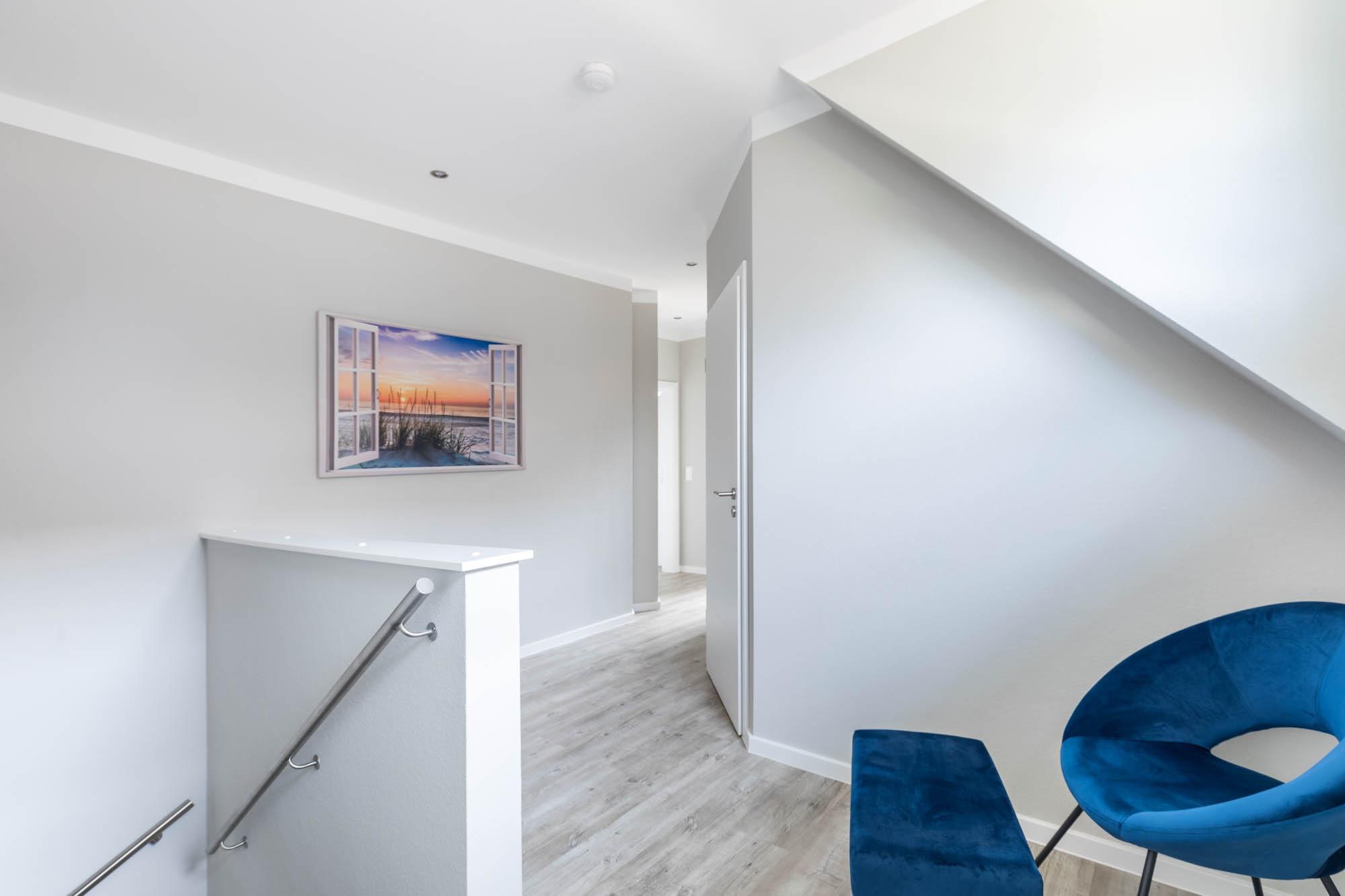 Vom Flur aus führt eine Treppe ins 1. Obergeschoss. Hier gelangen Sie zu den zwei weiteren Schlafzimmern, wovon eines mit einem Etagenbett (je 90x200cm), Kommode und eigenem SAT-TV und das andere mit einem Doppelbett (180x200cm) mit Kleiderschrank ausgestattet ist.