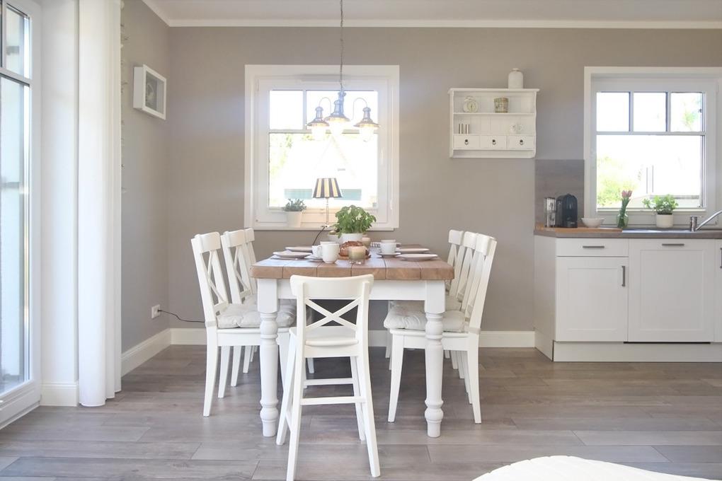 Die offene Küche mit angrenzendem Essbereich bietet zum Kochen die nötige Ausstattung und genügend Platz, um die zubereiteten Mahlzeiten bequem einzunehmen. Hochwertige Haushaltsgeräte und Küchenutensilien sorgen im gesamten Haus für Freude.