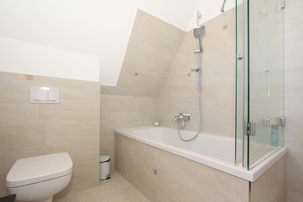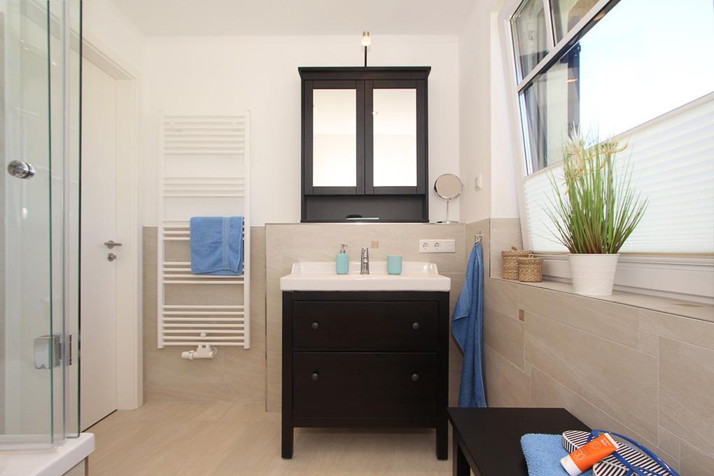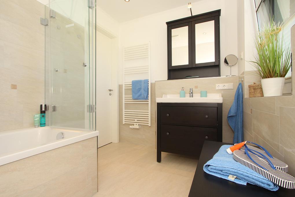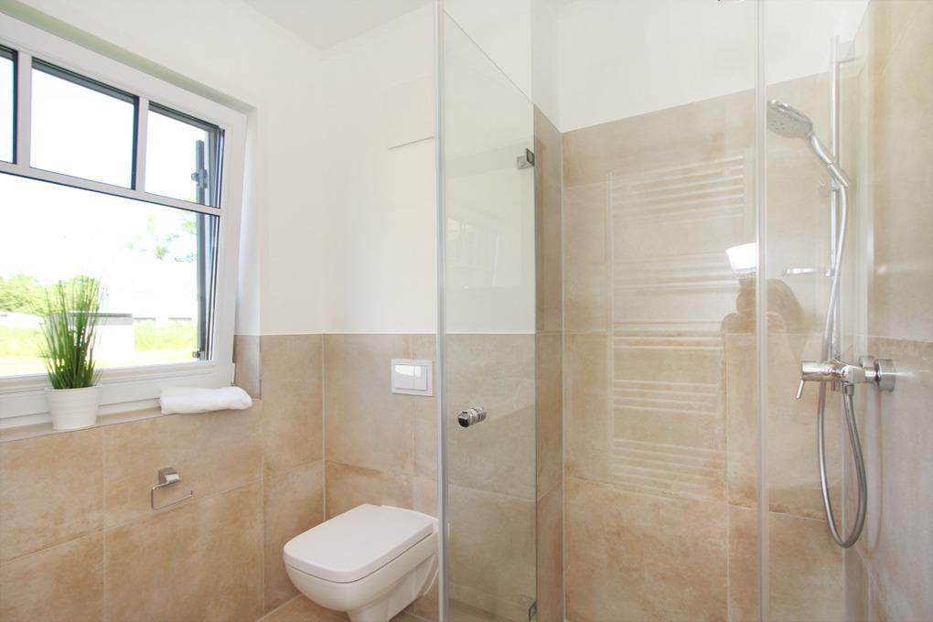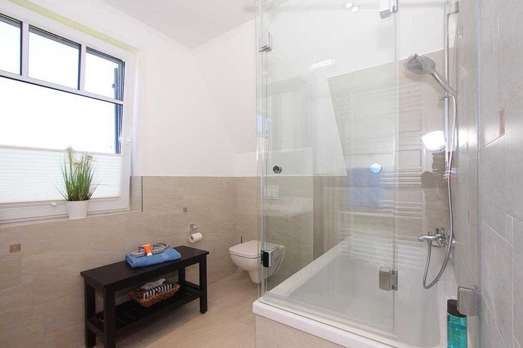 Das große und komfortabel eingerichtete Badezimmer mit Fenster auf dieser Etage lässt keine Wünsche offen. Nach einem wunderschönen Urlaubstag können Sie hier wahlweise ganz entspannt ein wohltuendes Bad nehmen oder einfach Duschen. Selbstverständlich ist auch hier ein WC integriert.