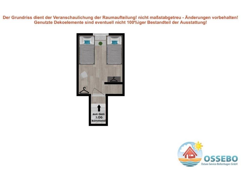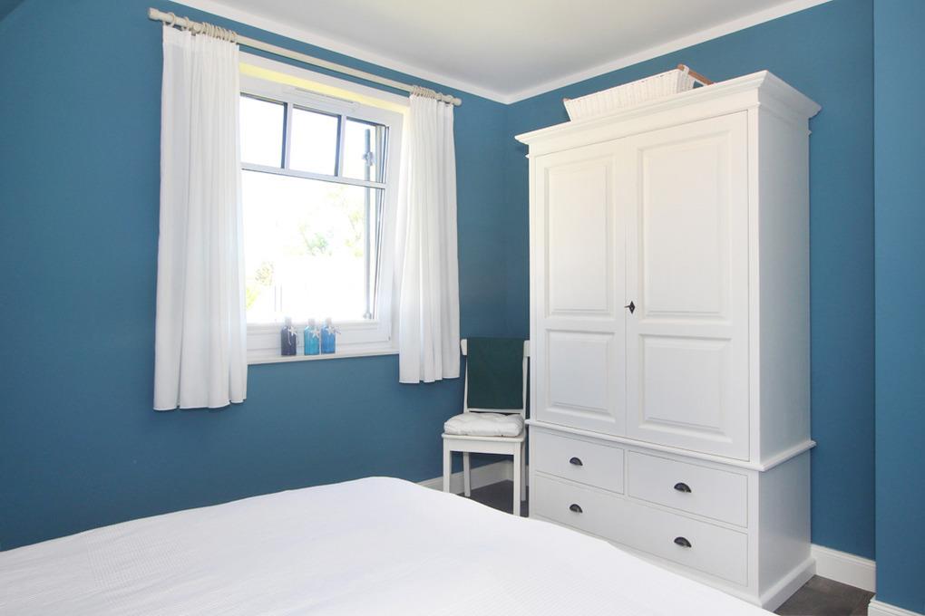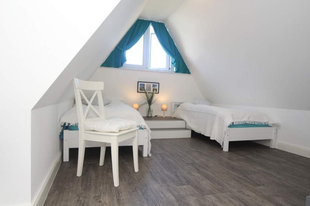 Im dritten Schlafzimmer, welches im Dachgeschoss des Hauses als Gäste-/ Kinderzimmer hergerichtet ist, befinden sich zwei Einzelbetten (90x200cm). Eine schöne Kommode sowie ein Stuhl können hier als Ablage genutzt werden. Auch das Dachgeschoss erreichen Sie über eine schöne Treppe im Flur.