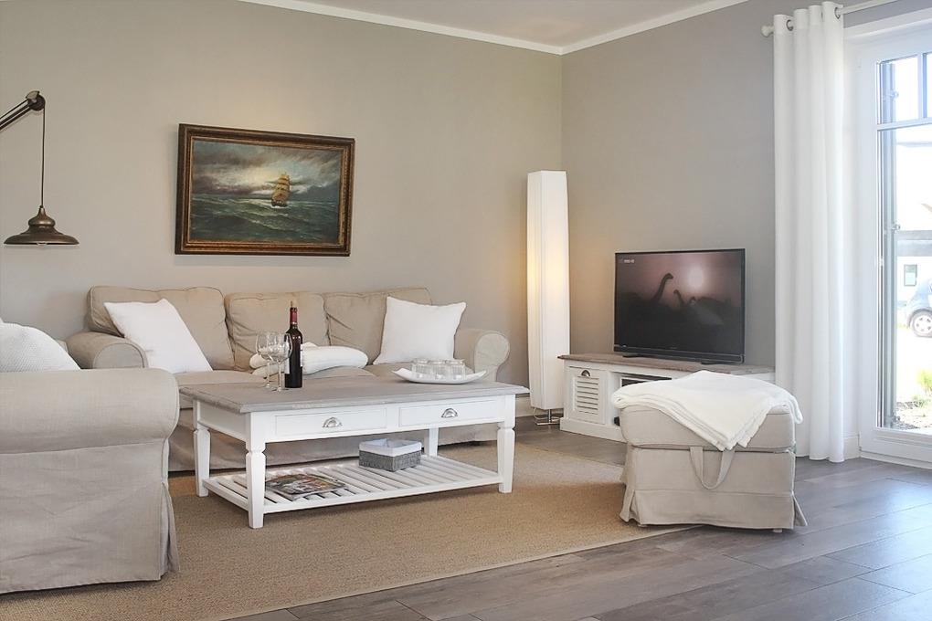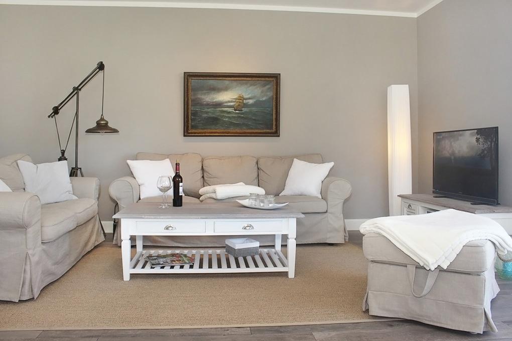 Das Zentrum im lichtdurchfluteten Wohn- und Essbereich im Erdgeschoss bildet der schöne große Esstisch. Der geschmackvoll eingerichtete Wohnbereich lädt mit seinem gemütlichen Sofa und der modernen Unterhaltungstechnik wie Flatscreen-TV (LCD-TV), CD-Player, Radio und BlueRay-Player zum Entspannen ein. Durch die großen Fenster haben Sie auch vom Wohnbereich aus eine herrliche Sicht auf die Westterrasse und in die Gartenanlage.