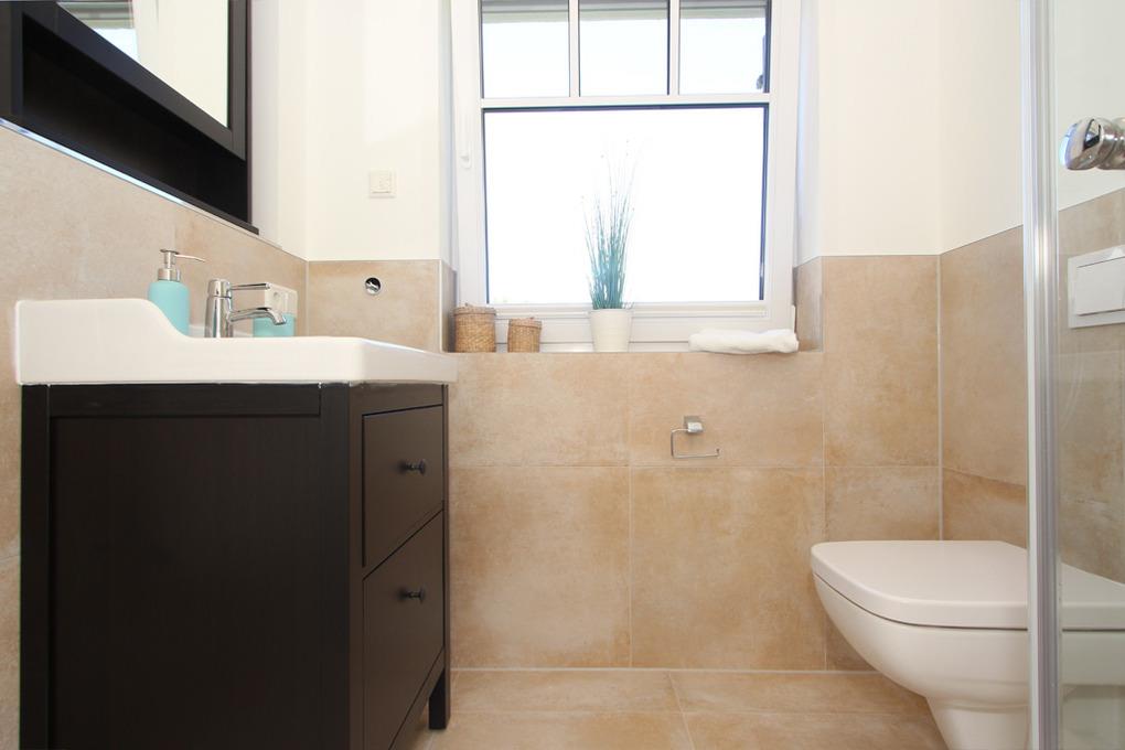 Weiterhin finden Sie eines der zwei modernen Badezimmer im Erdgeschoss, es bietet eine ebenerdige Dusche sowie ein WC. Ein Fenster spendet zusätzliches Tageslicht.