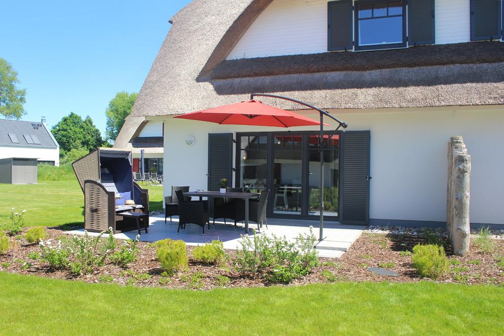 Auf Ihren zwei möblierten Terrassen (1x West, 1x Ost) mit einem eigenen Strandkorb haben Sie viel Platz zum Entspannen und Essen.