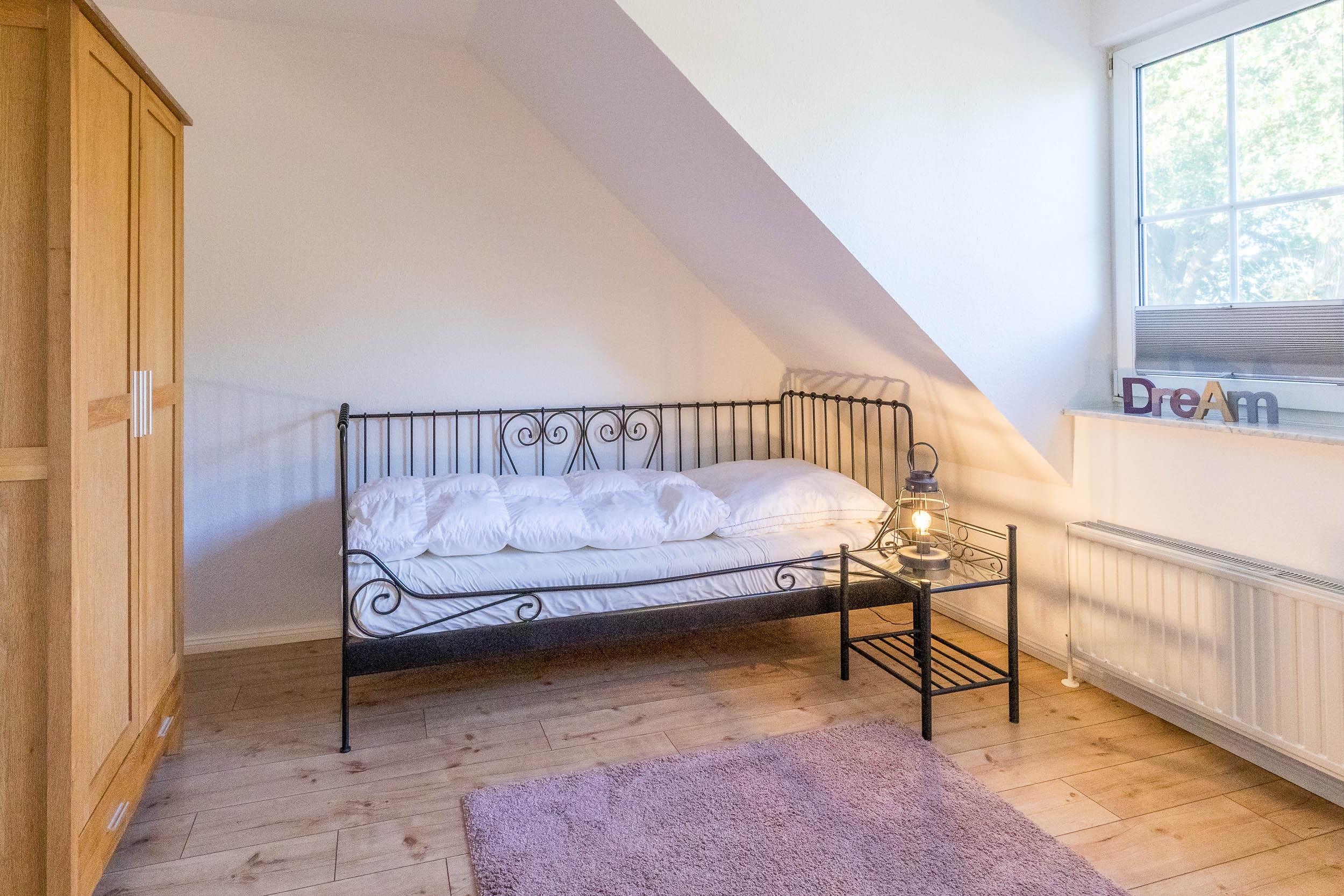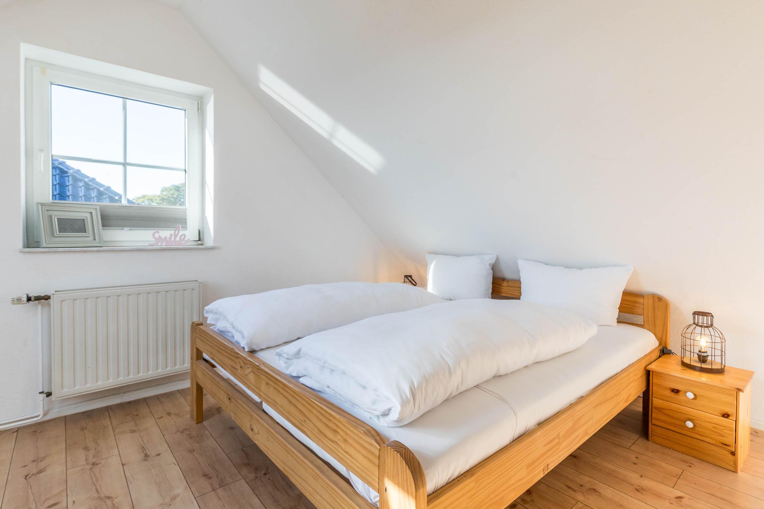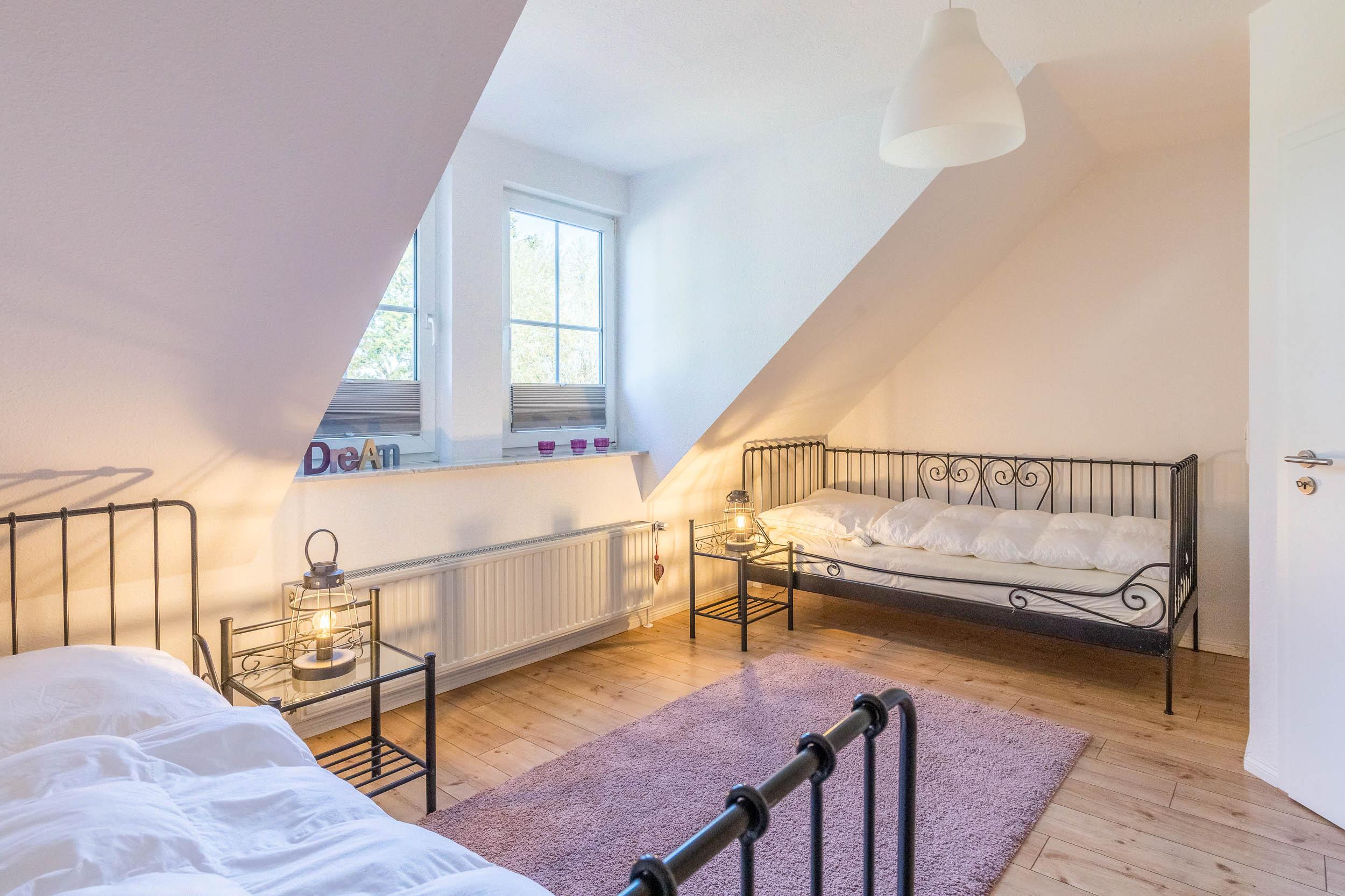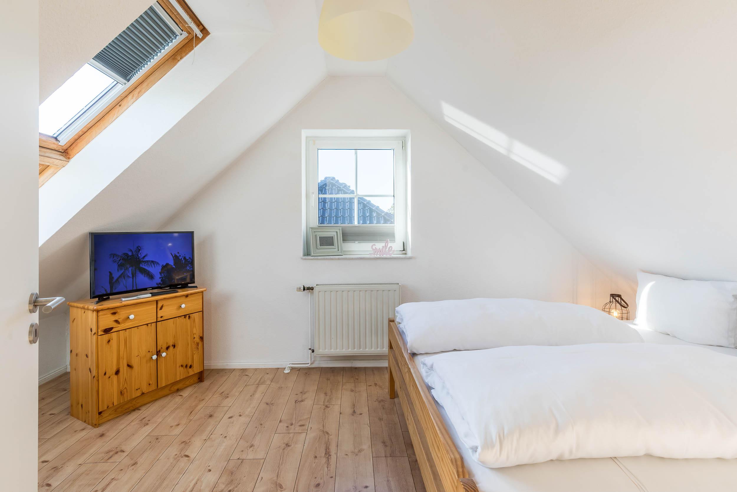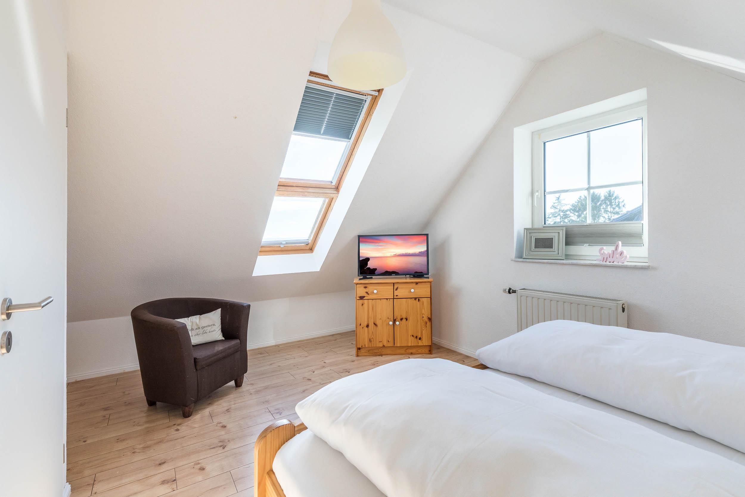 Vom Flur aus führt Sie die Treppe weiter hinauf ins Dachgeschoss, wo sich die dritte Schlafmöglichkeit befindet. Auch dieses Zimmer ist mit einem gemütlichen Doppelbett und einer kleinen Sitzecke ausgestattet.