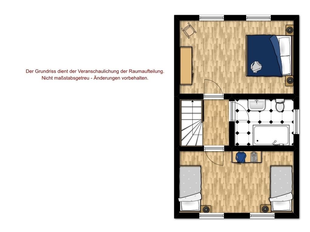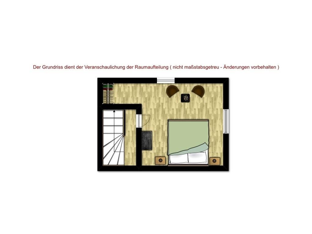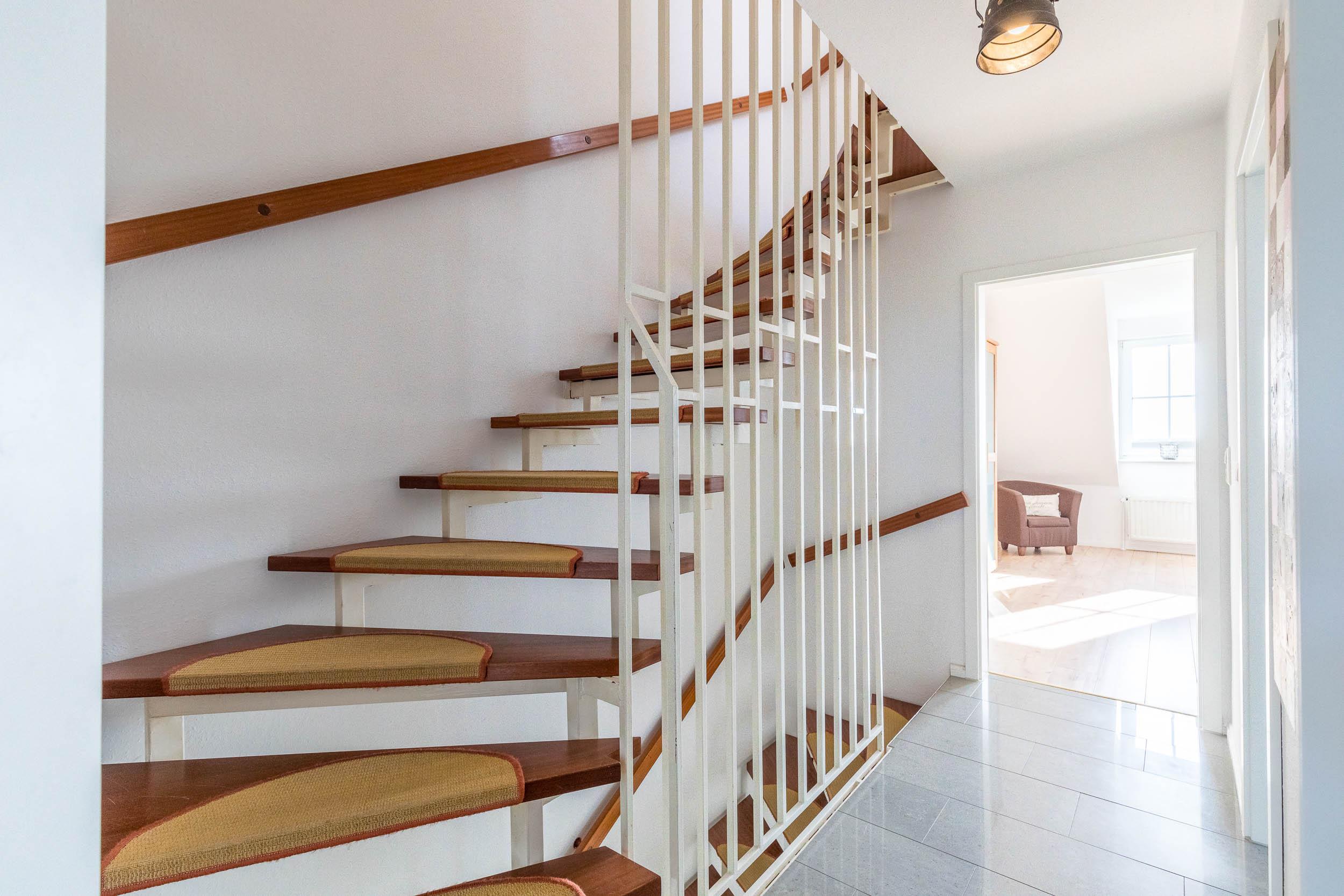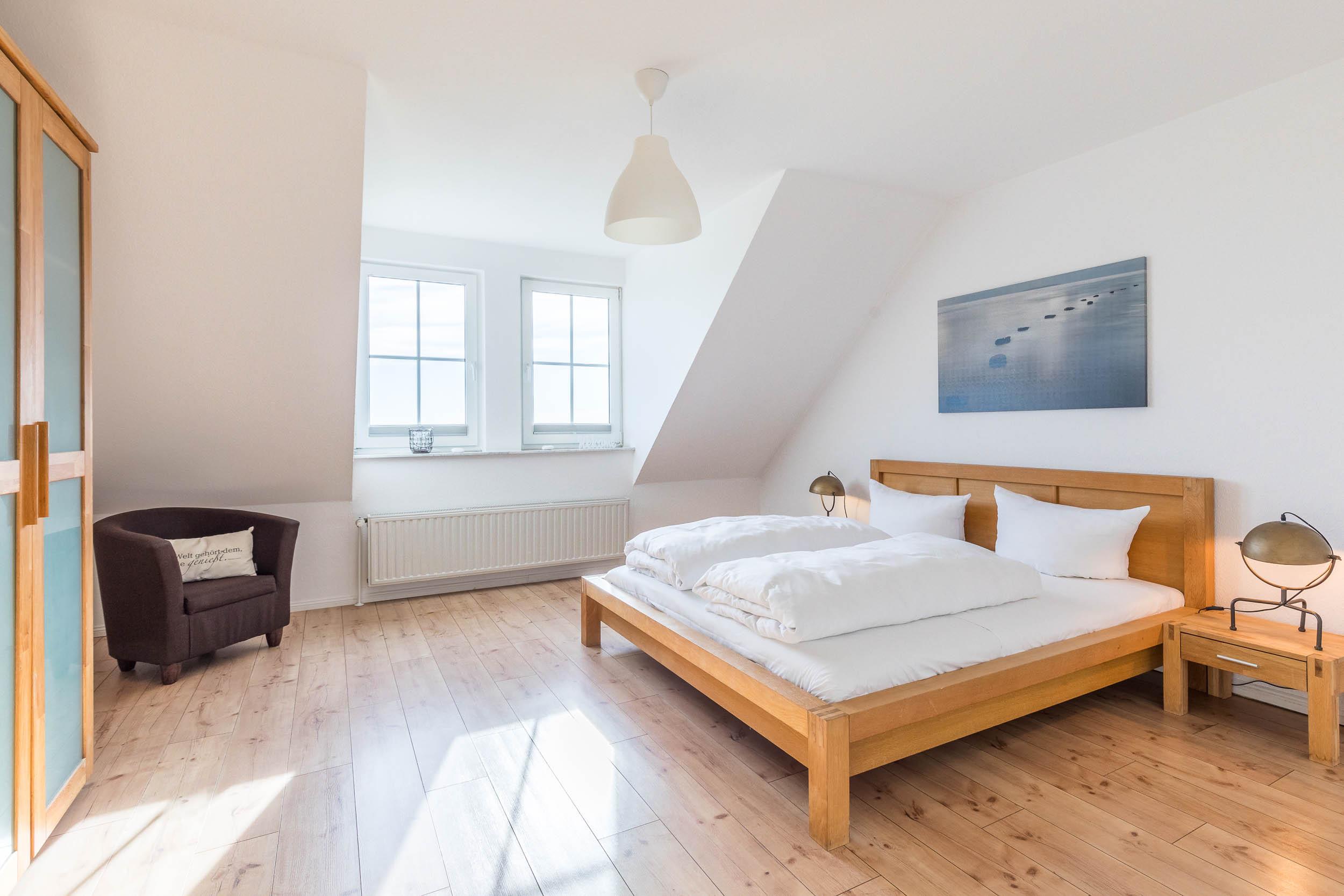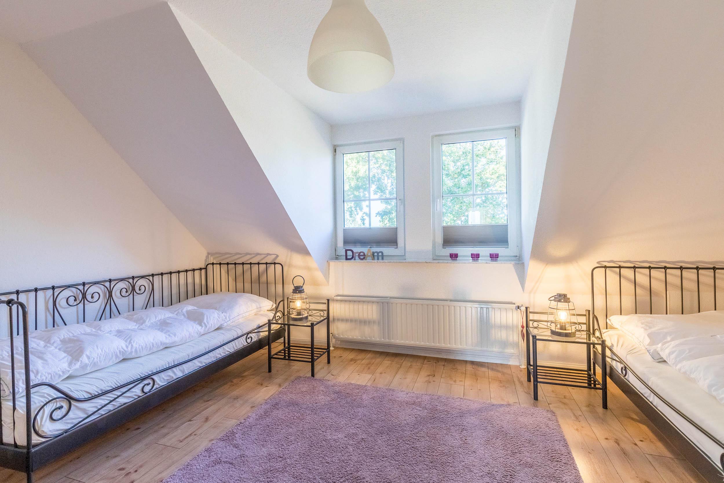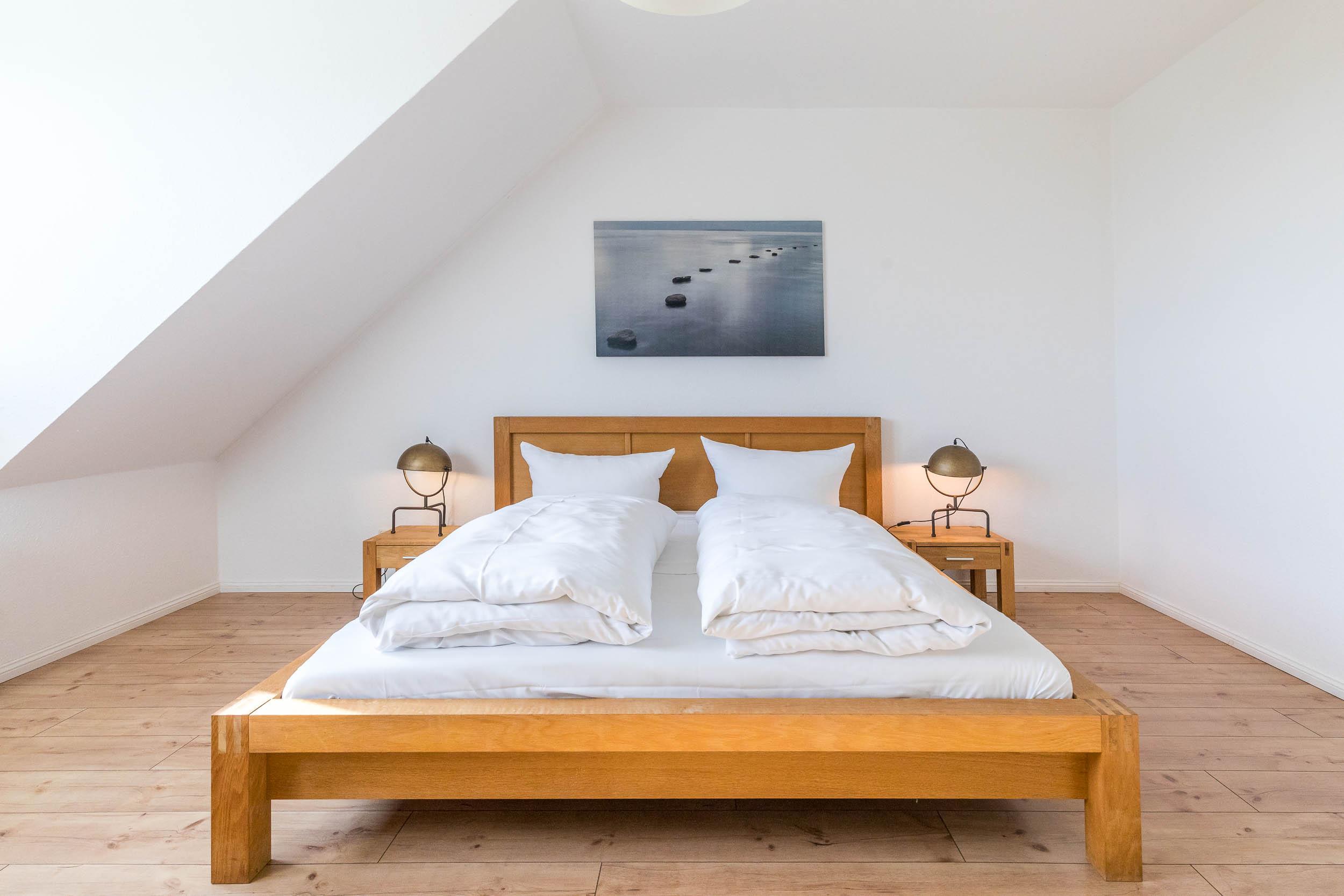 Vom Flur aus führt Sie die Treppe weiter hinauf ins Dachgeschoss, wo sich die dritte Schlafmöglichkeit befindet. Auch dieses Zimmer ist mit einem gemütlichen Doppelbett und einer kleinen Sitzecke ausgestattet.