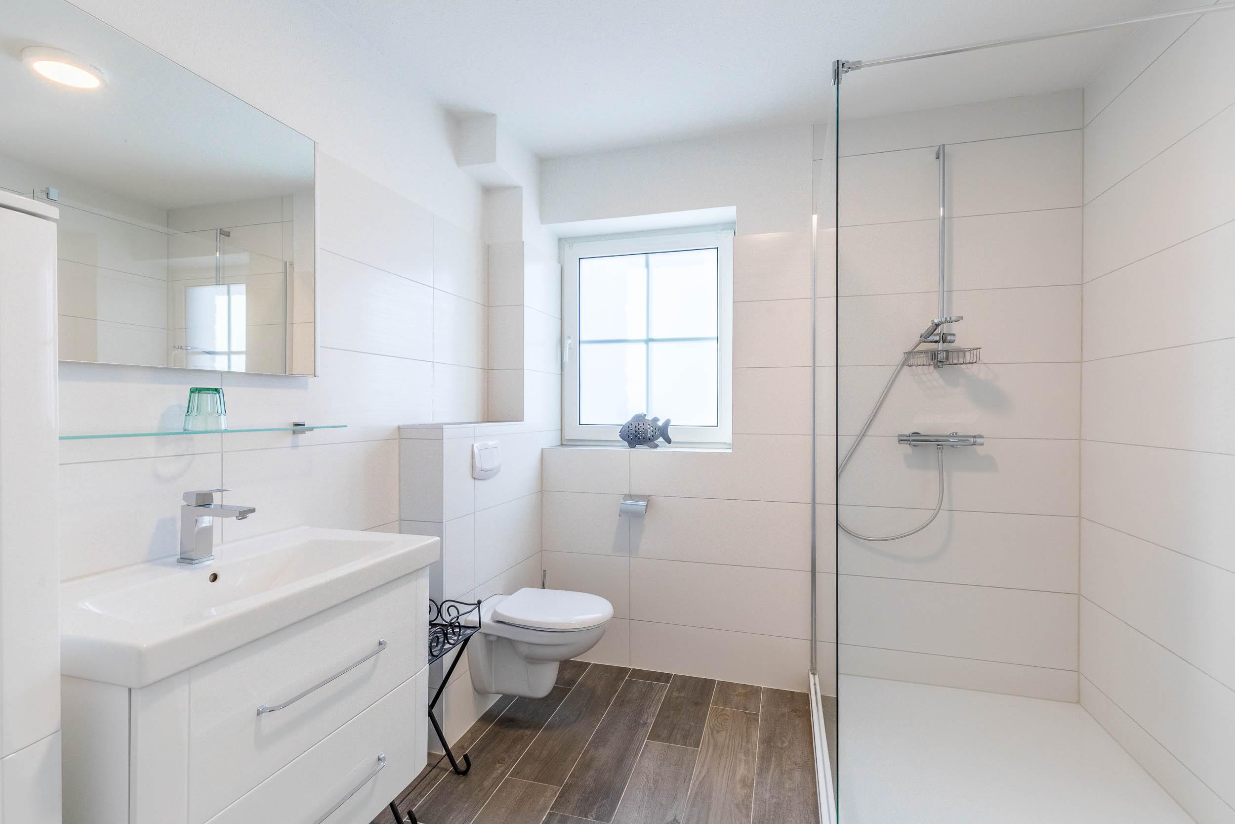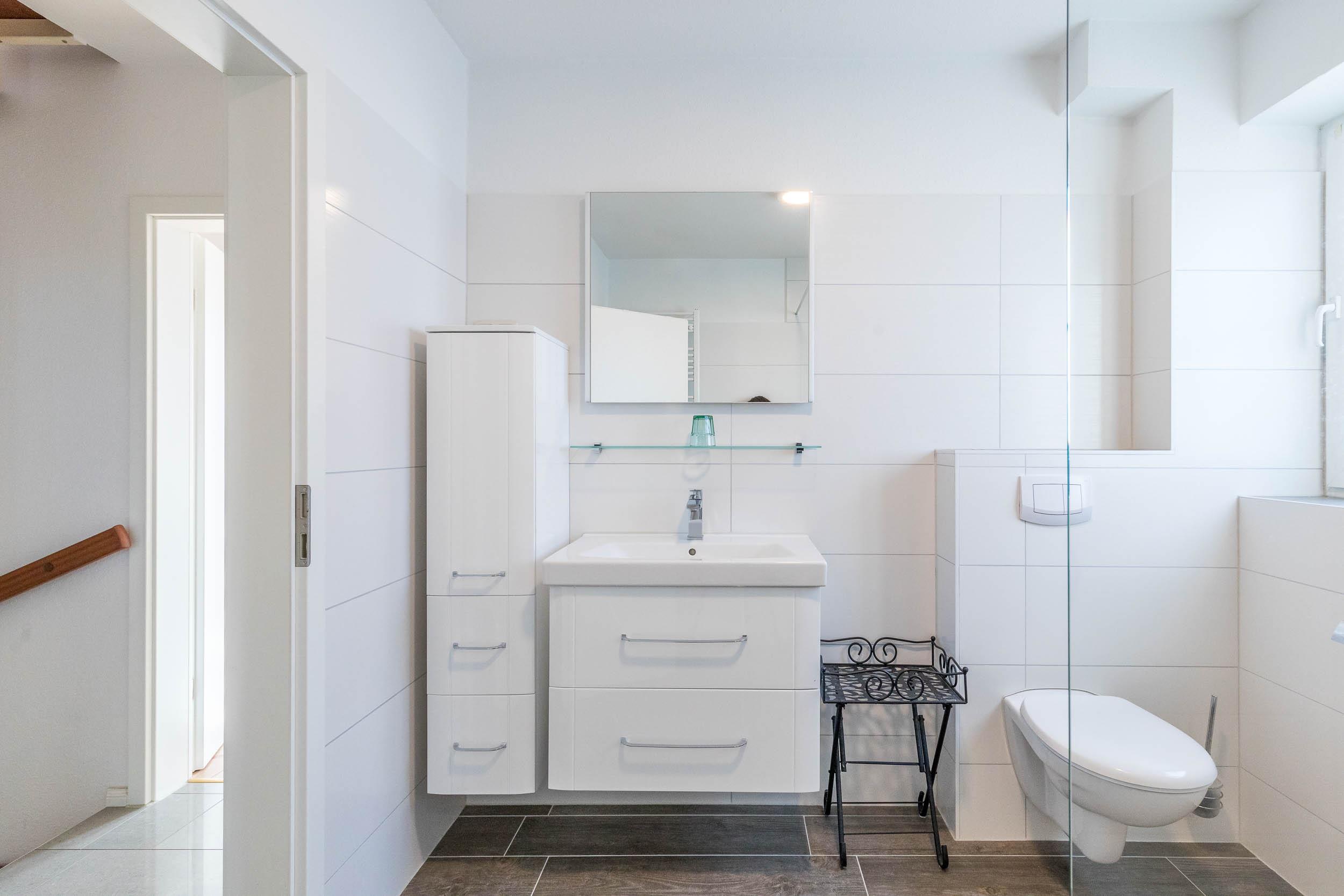 Das helle und moderne Badezimmer mit großer Dusche, Waschtisch und WC erwartet Sie im 1.Obergeschoss. Das Fenster spendet zusätzliches Tageslicht und erleichtert das Lüften nach dem Duschen.