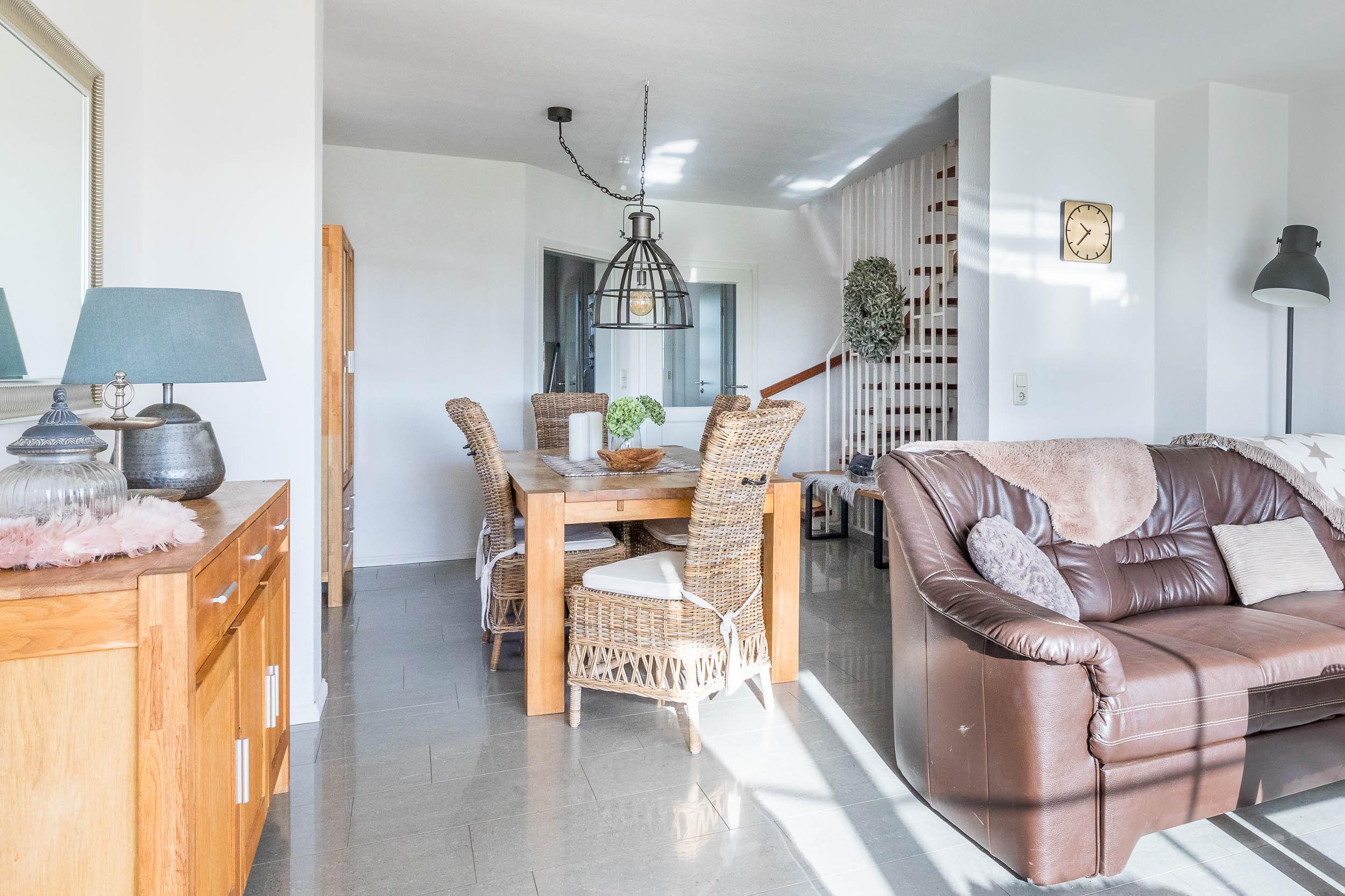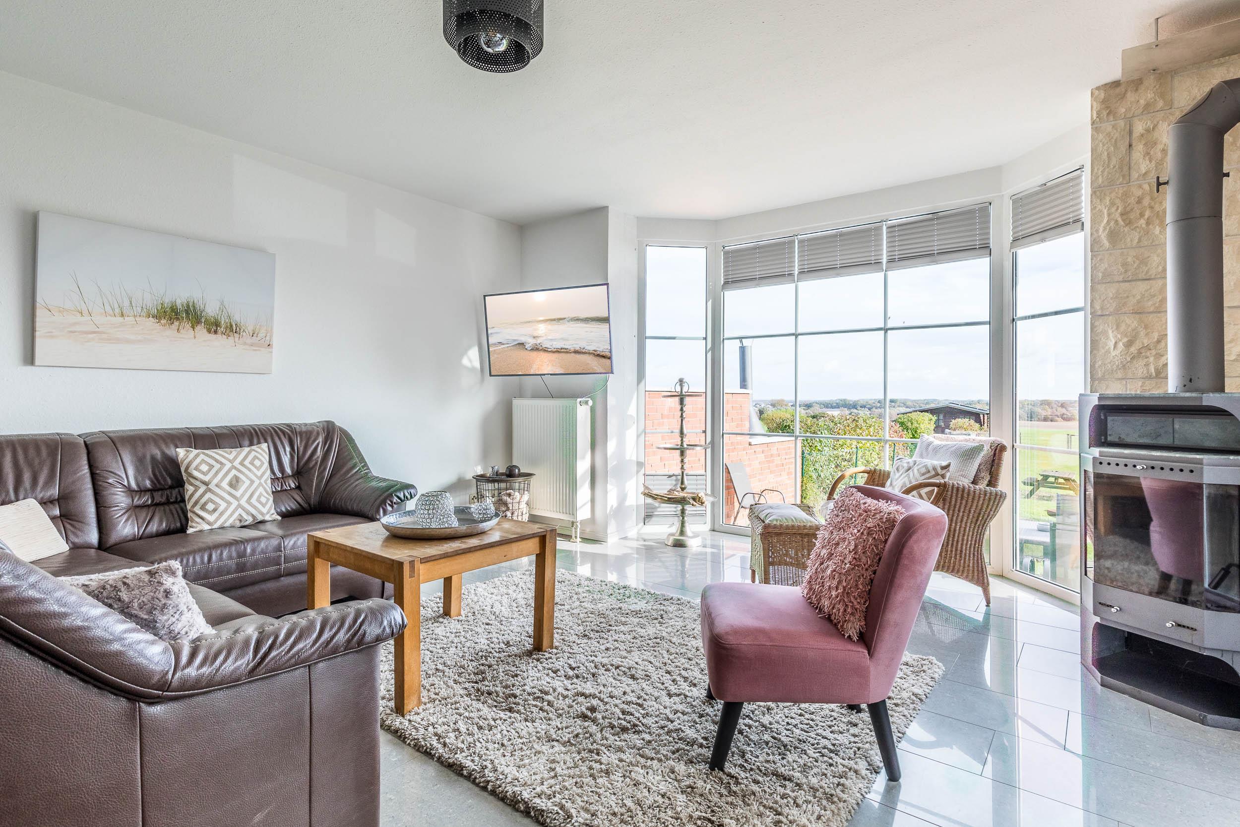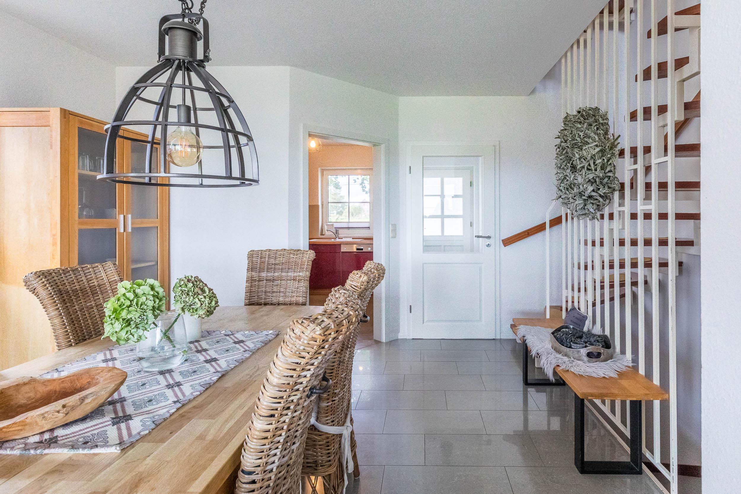 Ein großzügiger Wohn- und Essbereich befindet sich im Erdgeschoss und ist Mittelpunkt des Hauses. Das Panoramafenster mit Blick auf die Mecklenburgische Landschaft und die Boltenhagener Wiek ist eines von vielen Highlights. Ein Esstisch mit passenden Stühlen bietet ausreichend Platz für die Familie. Hier können alles sitzen, essen spielen und schnacken. Für die Multimediaunterhaltung sorgt der große TV mit Satelliten Fernsehen.