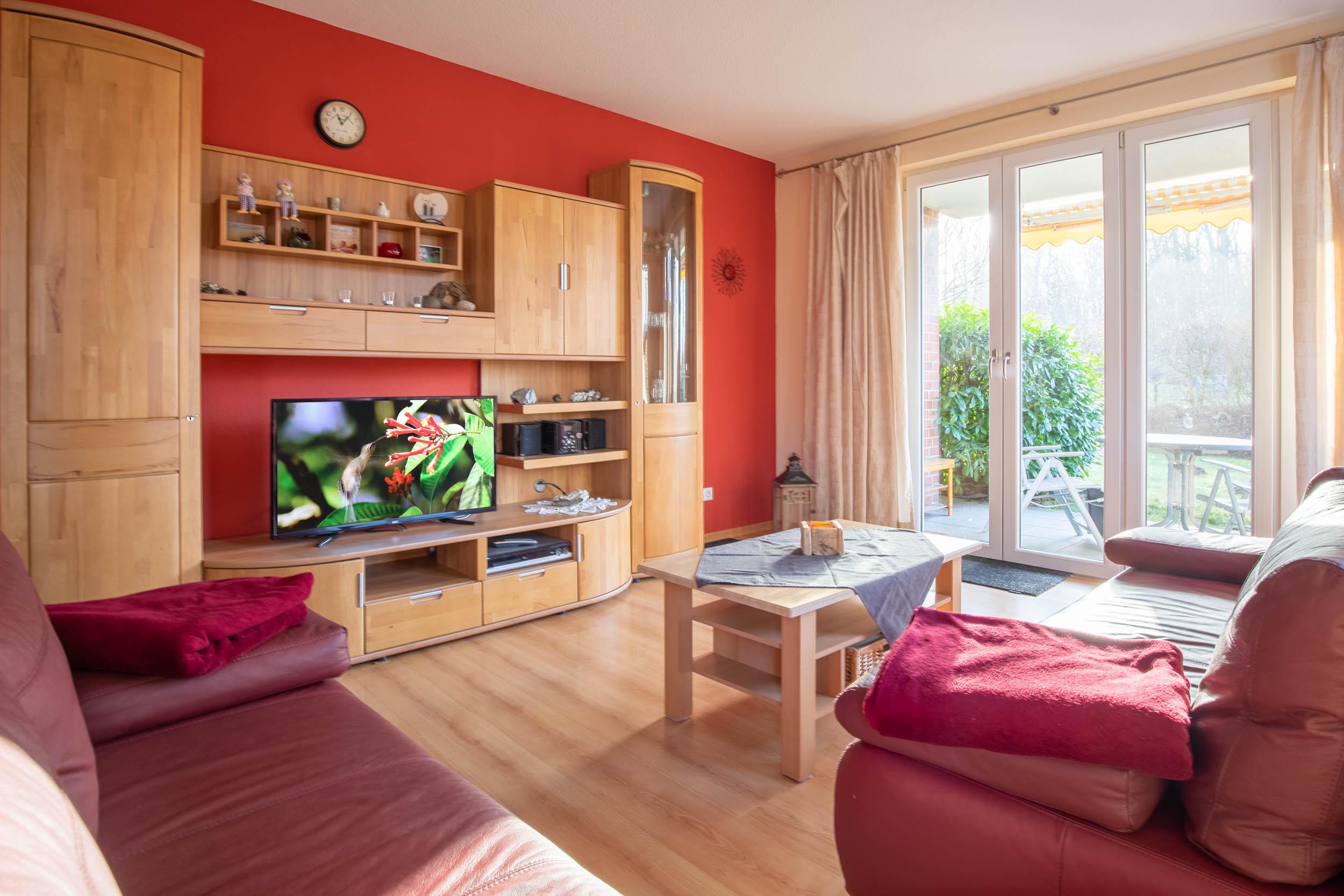 Im Wohnbereich gibt es unter anderem Fernseher, Microanlage und DVD-Player. Die zwei ausziehbaren Sofas im Wohnzimmer bieten zwei weitere Schlafmöglichkeiten.