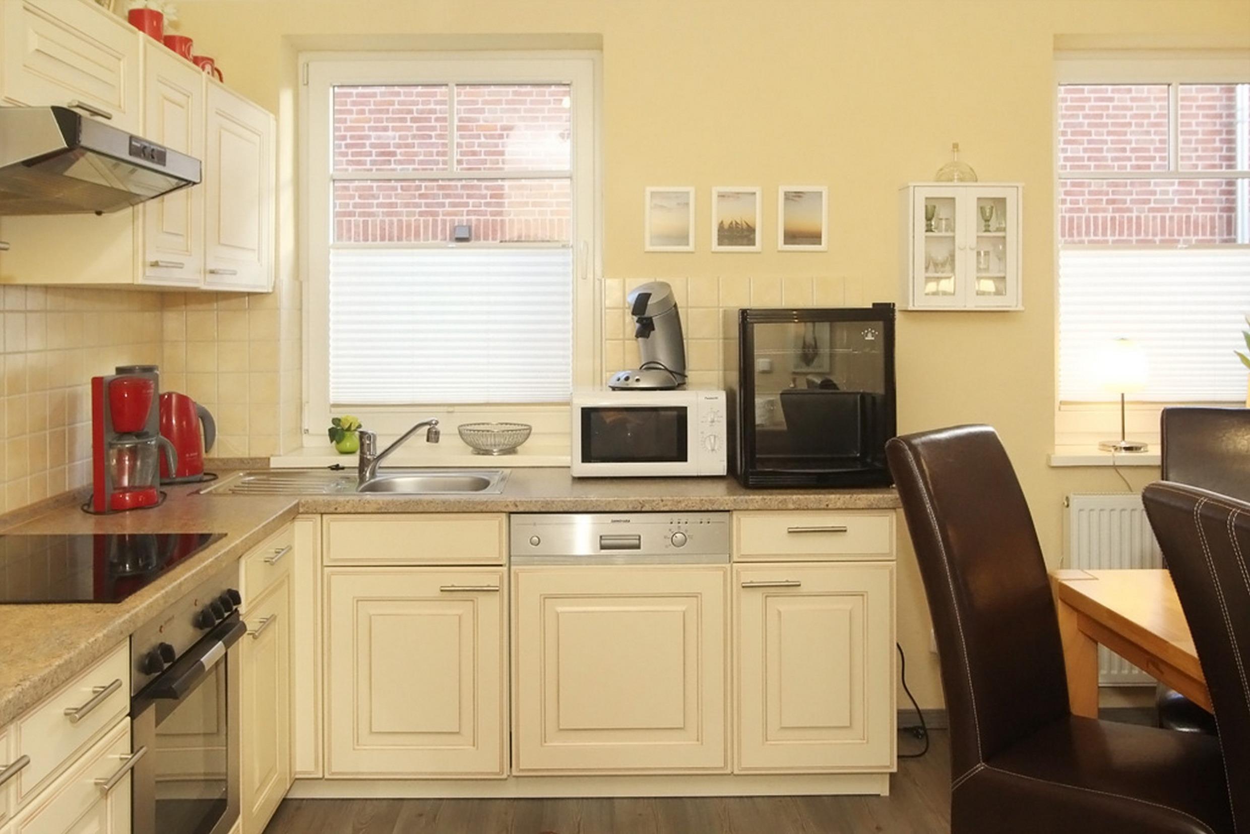 Die Küchenzeile ist großzügig ausgestattet, so dass das Kochen im Urlaub zum Vergnügen wird. In der Wohnküche befindet sich ein großer Esstisch mit ausreichend Sitzmöglichkeiten.