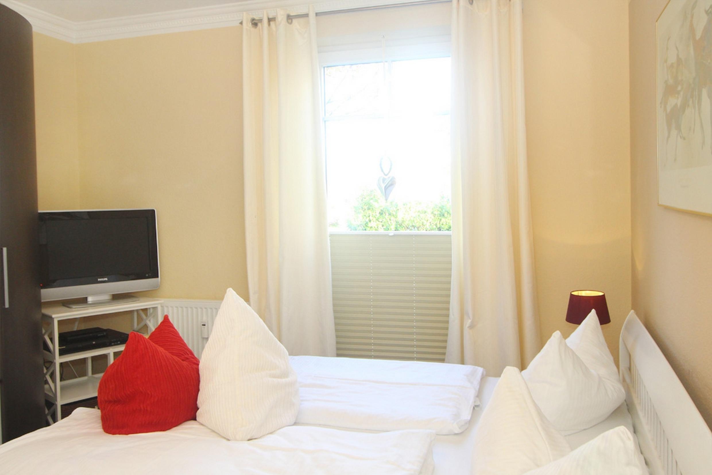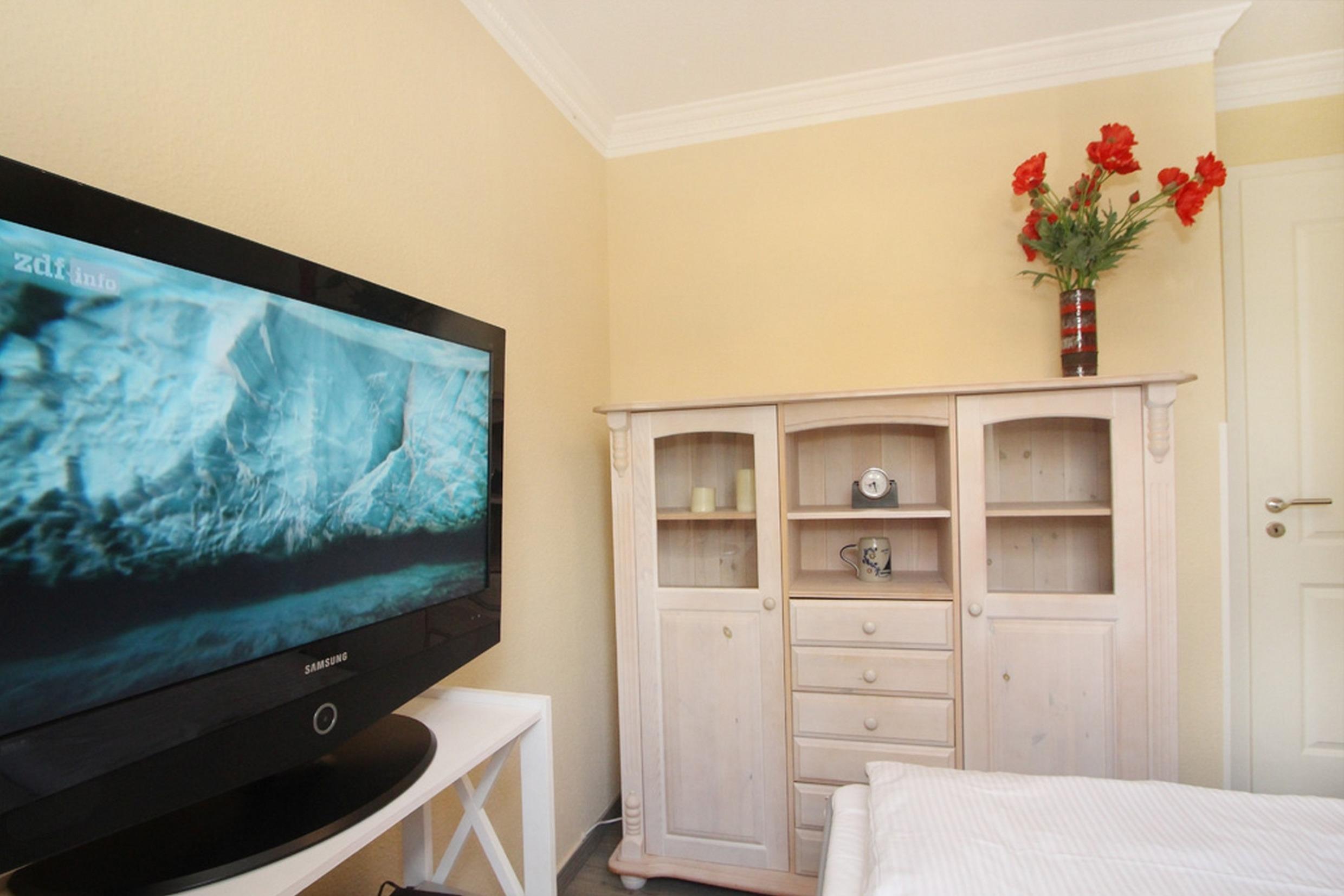 Ein Schlafzimmer bietet ein Doppelbett (180x190cm), SAT-TV (Flatscreen) + DVD-Player und einen großen Kleiderschrank für Ihre Urlaubsgarderobe. Im zweiten Schlafzimmer, in dem sich eine ausziehbare Schlafcouch für 1-2 Personen (ideal für 1 Erwachsenen oder 2 Kinder, Maße ausgezogen 140x200cm) befindet, bietet ebenfalls SAT-TV (Flatscreen) + DVD-Player und dazu eine Kommode als Ablage.