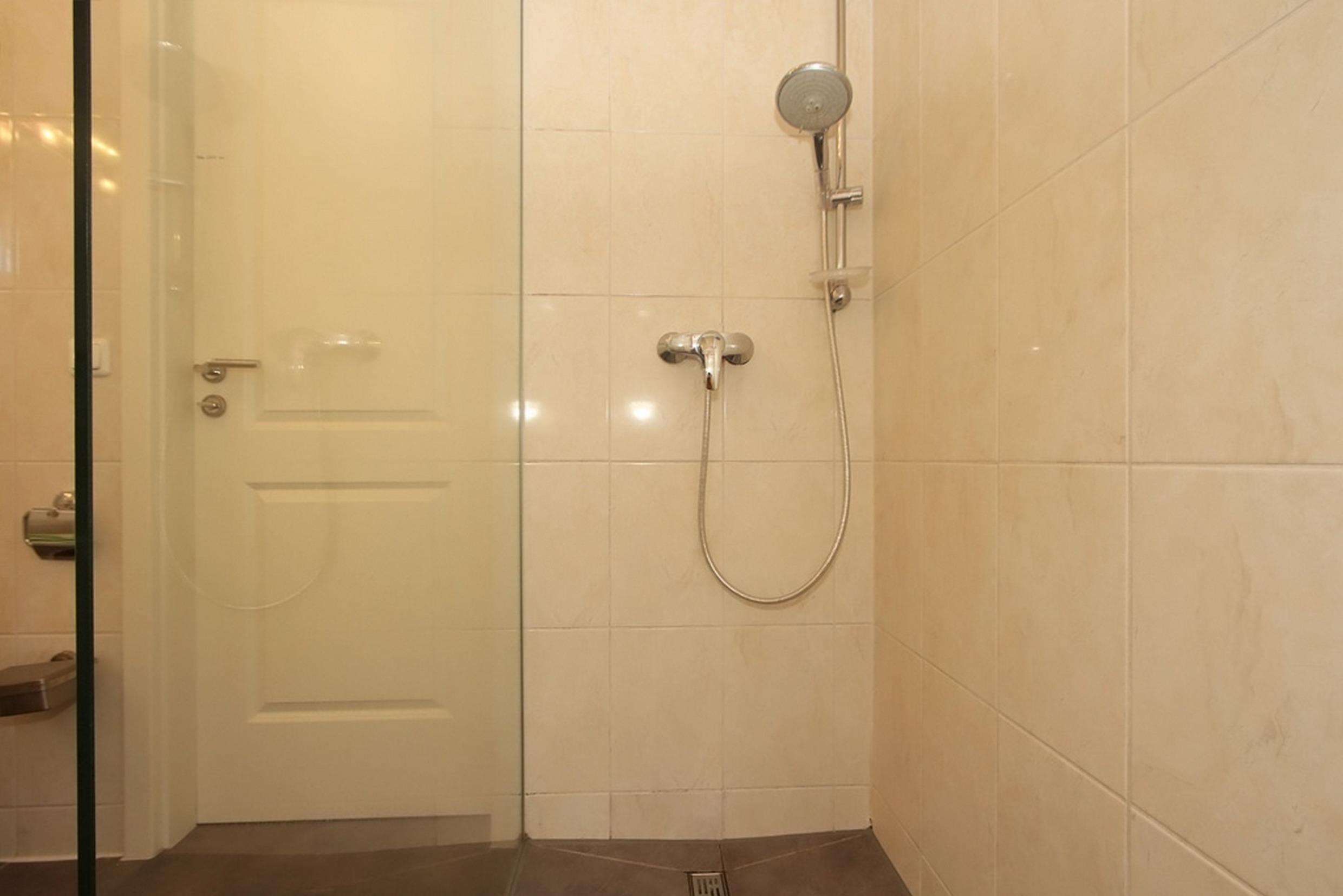 Das Badezimmer mit Fenster ist mit einer bodenebenen Dusche (ca. 1cm Höhe) und einem WC ausgestattet. Zusätzlich gibt es ein separates Gäste-WC.