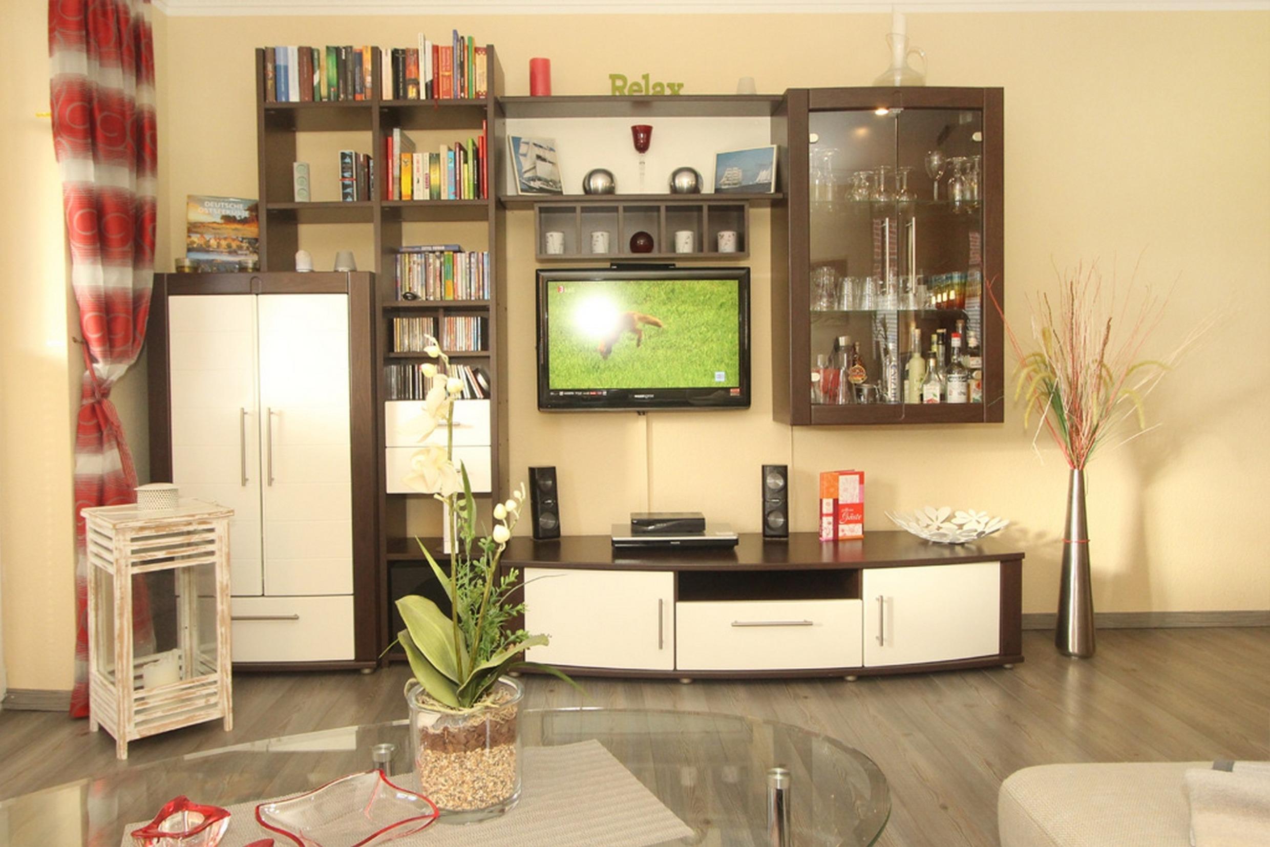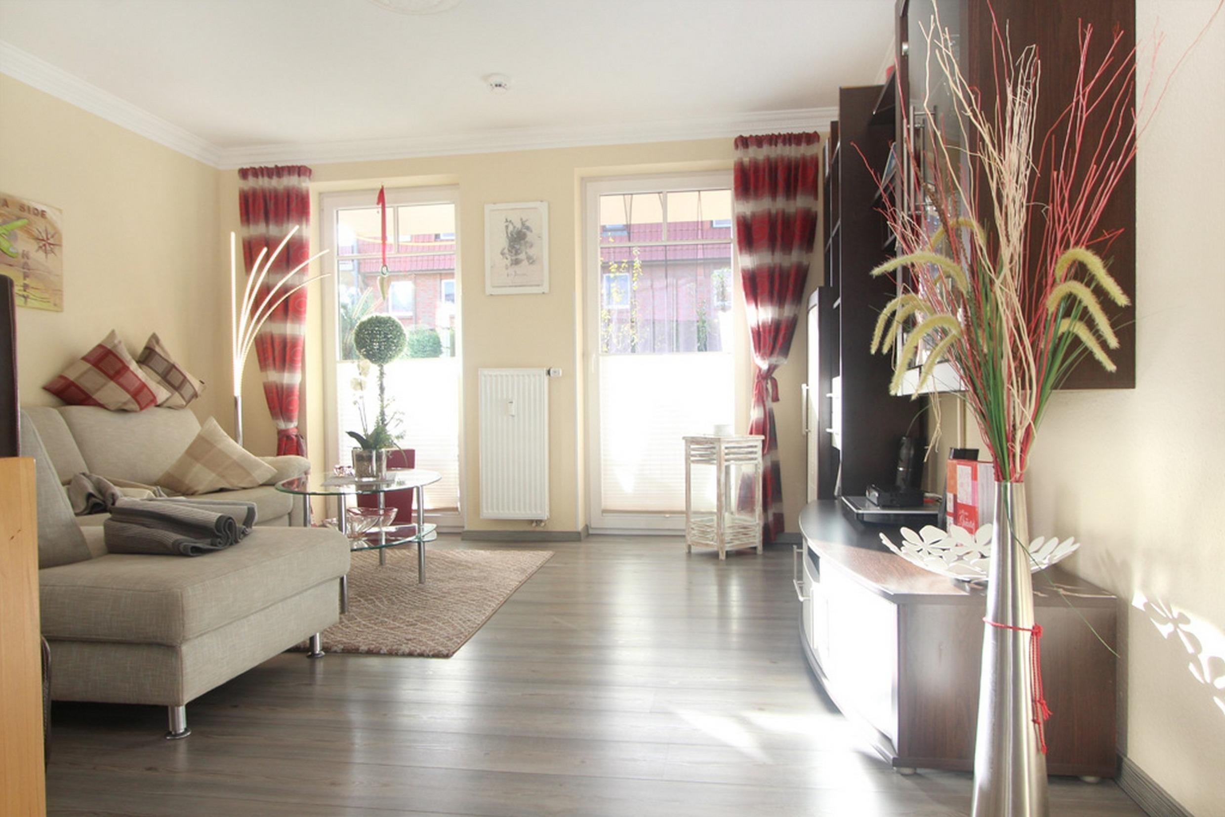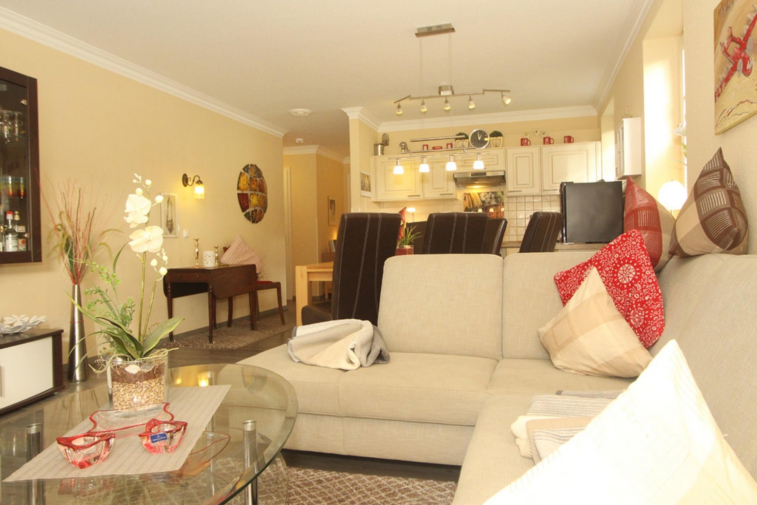 Der Wohnbereich verfügt über eine bequeme Sofalandschaft. Flatscreen-TV, DVD-Player/ BlueRay sowie eine größere Auswahl an CDs schaffen die Voraussetzungen für entspannende Urlaubsabende nach ereignisreichen Tagen an der Ostsee. Hier kann bei Bedarf auch ein Kinderreisebett aufgestellt werden.