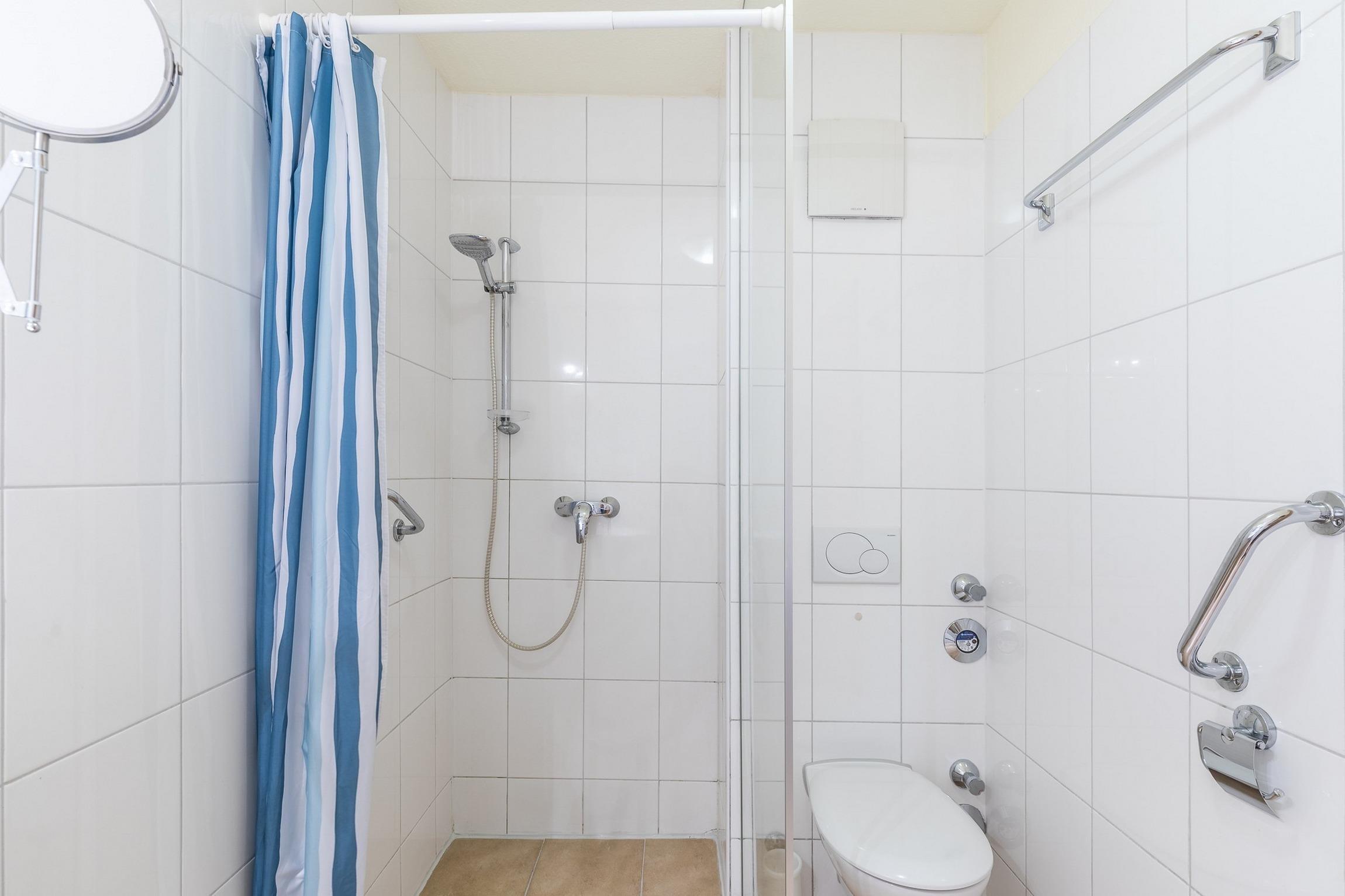 Im separaten Badezimmer befindet sich eine bodengleiche Dusche und das WC.