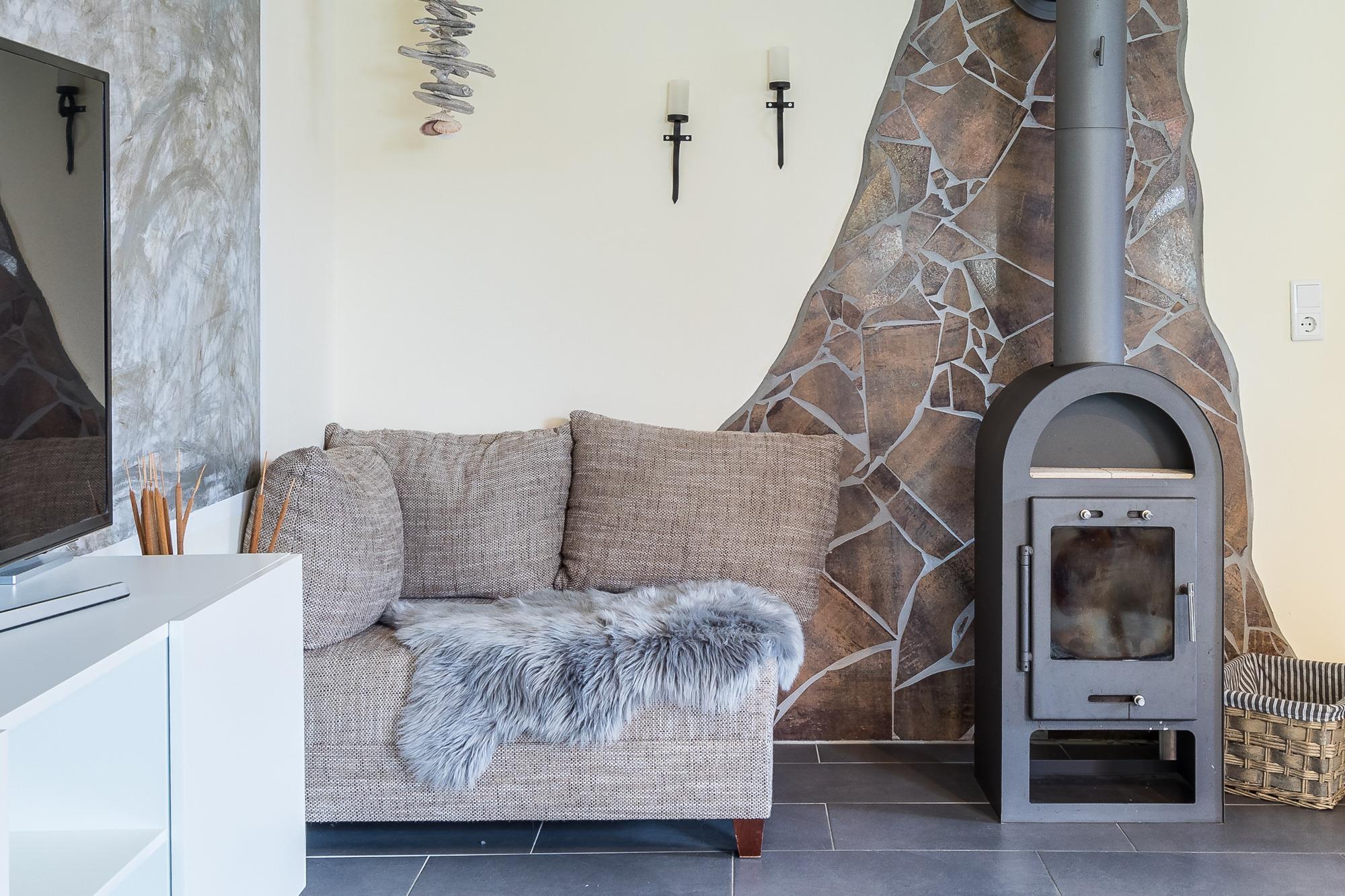 Im Wohnzimmer kann eines der Sitzmöbel in einen zusätzlichen Schlafplatz für zwei Gäste verwandelt werden. Ein Kamin sorgt bei Bedarf für wohlige Wärme. Flatscreen-TV und DVD-Player bieten hier ein wenig Unterhaltungsmöglichkeit.