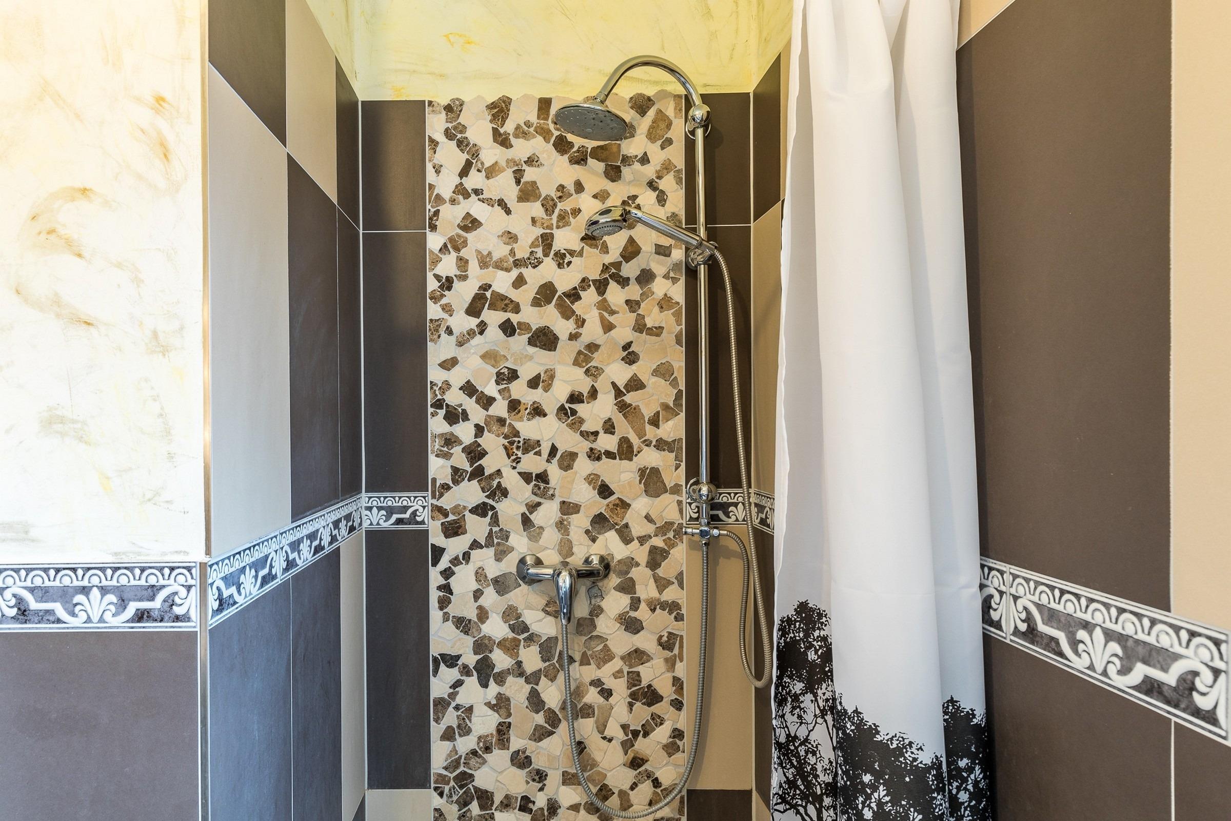 Im dekorativ gefliesten Badezimmer mit Dusche / WC genießen Sie die Vorzüge einer Fußbodenheizung und der Handtuchheizung. Das Fenster sorgt für angenehmes Tageslicht.