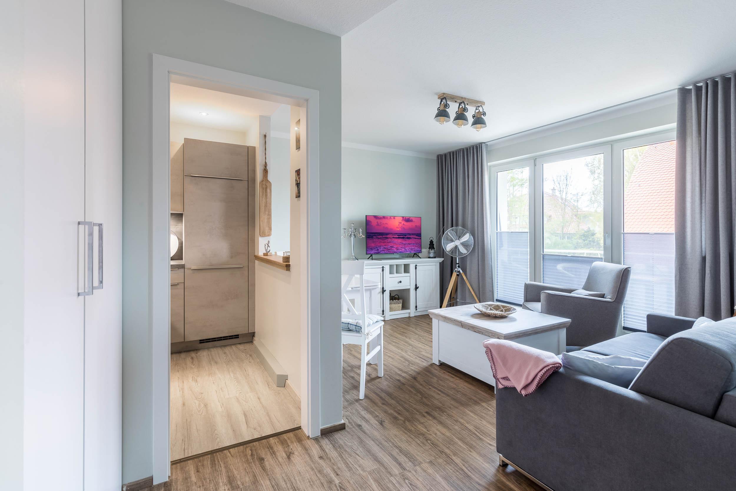Der kombinierte Wohn- und Essbereich mit integrierter Küche bietet ein bequemes Sofa, welches als zusätzliche Schlafmöglichkeit ausgezogen werden kann (Liegemaße ausgeklappt 140x190cm), Flatscreen-TV und eine kleine separate Essecke für 2 Personen.