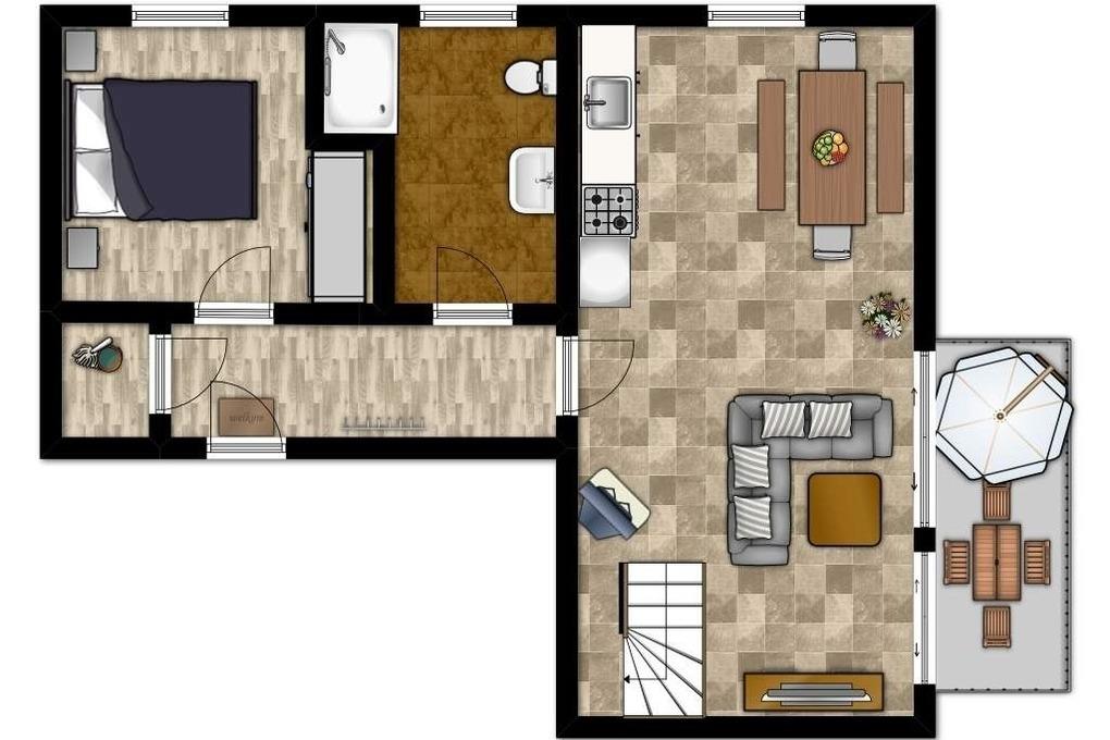 Die etwa 70qm große 3-Zimmer-Ferienwohnung im 1.OG verfügt auf 2 Etagen über eine moderne Ausstattung für bis zu 6 Gäste.