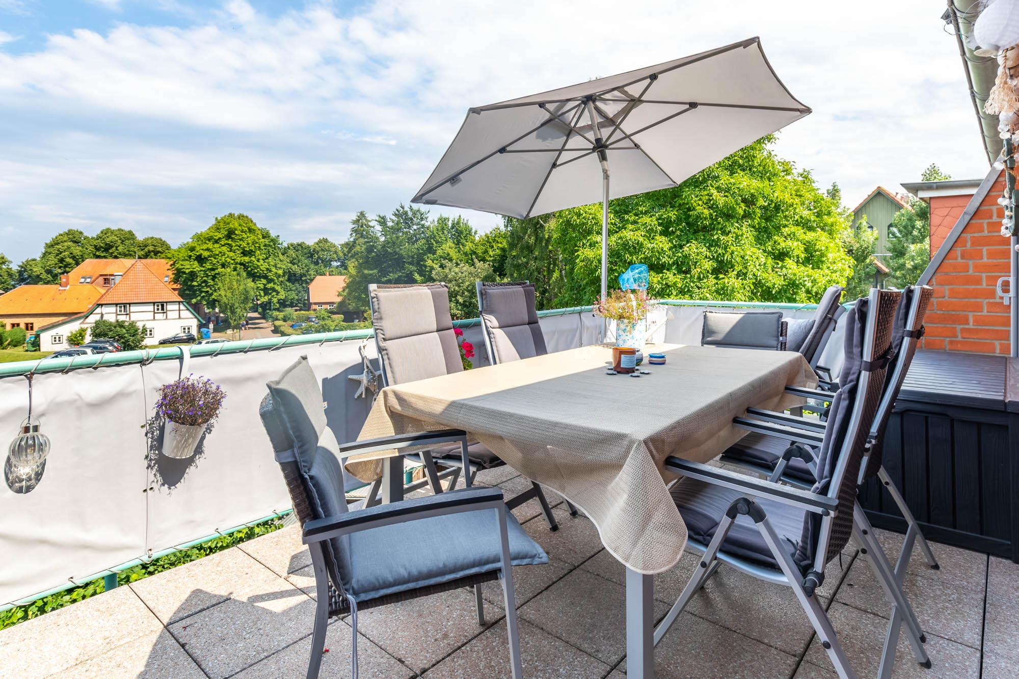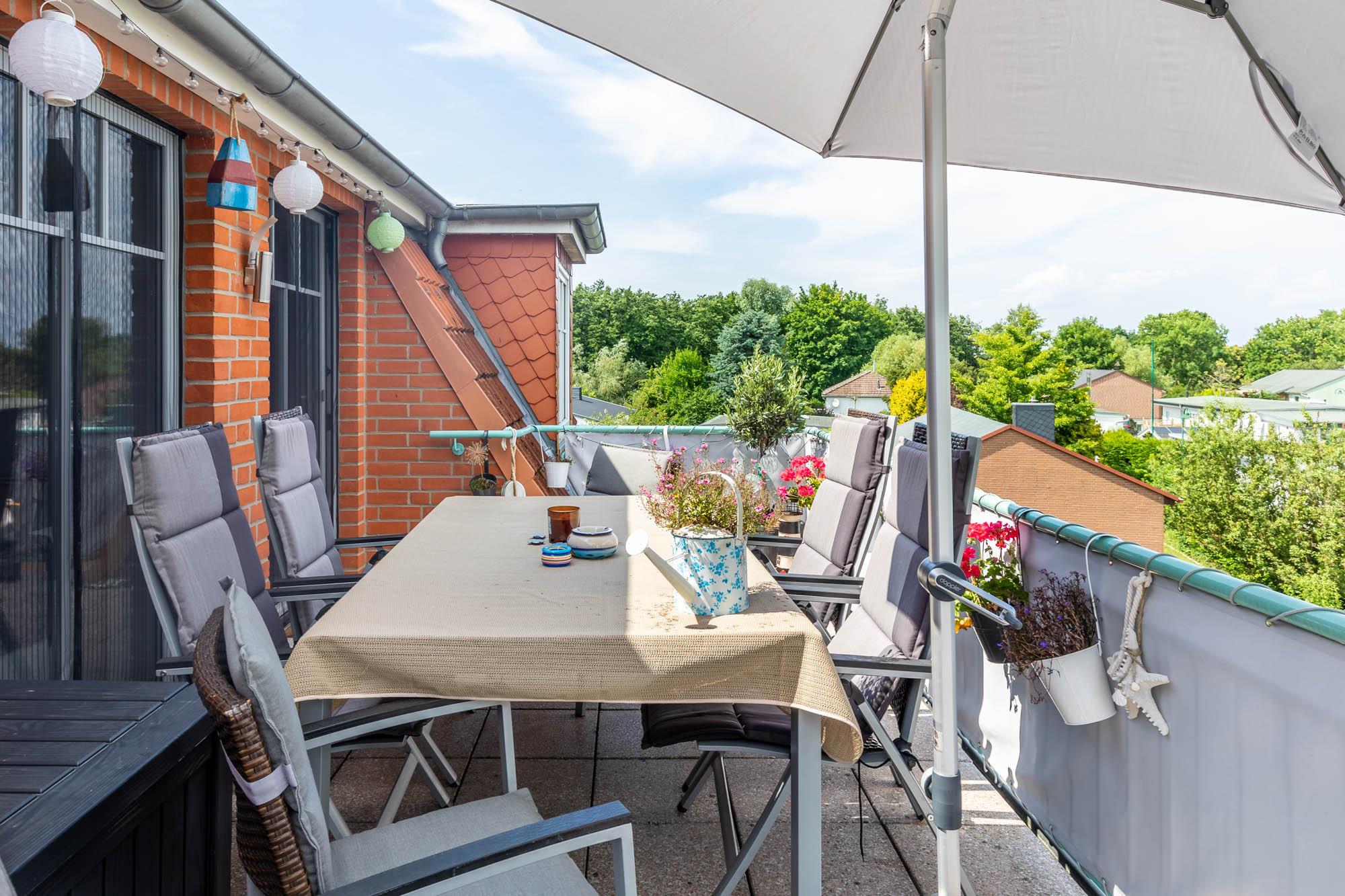 Der möblierte Nordost-Balkon ist direkt aus dem Wohnbereich begehbar. Sie können sogar ein bisschen das Meer von hier aus sehen...