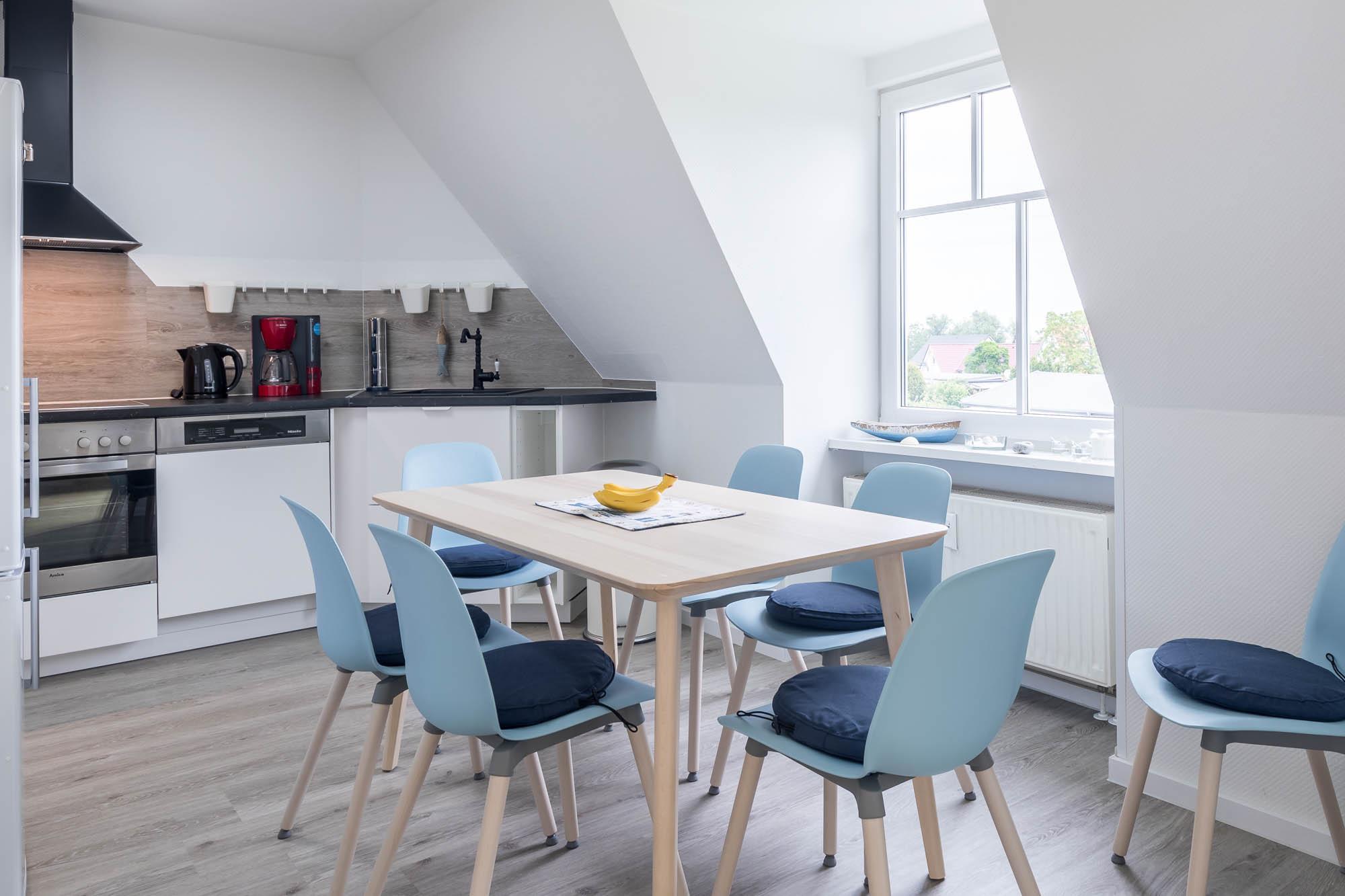 Das moderne helle Wohnzimmer bietet neben zwei bequemen Sofas und einem Schwingsessel auch Flatscreen-TV, eine kleine Bibliothek sowie eine hervorragend ausgestattete Wohnküche mit einer großzügigen Essecke für 6 Gäste.