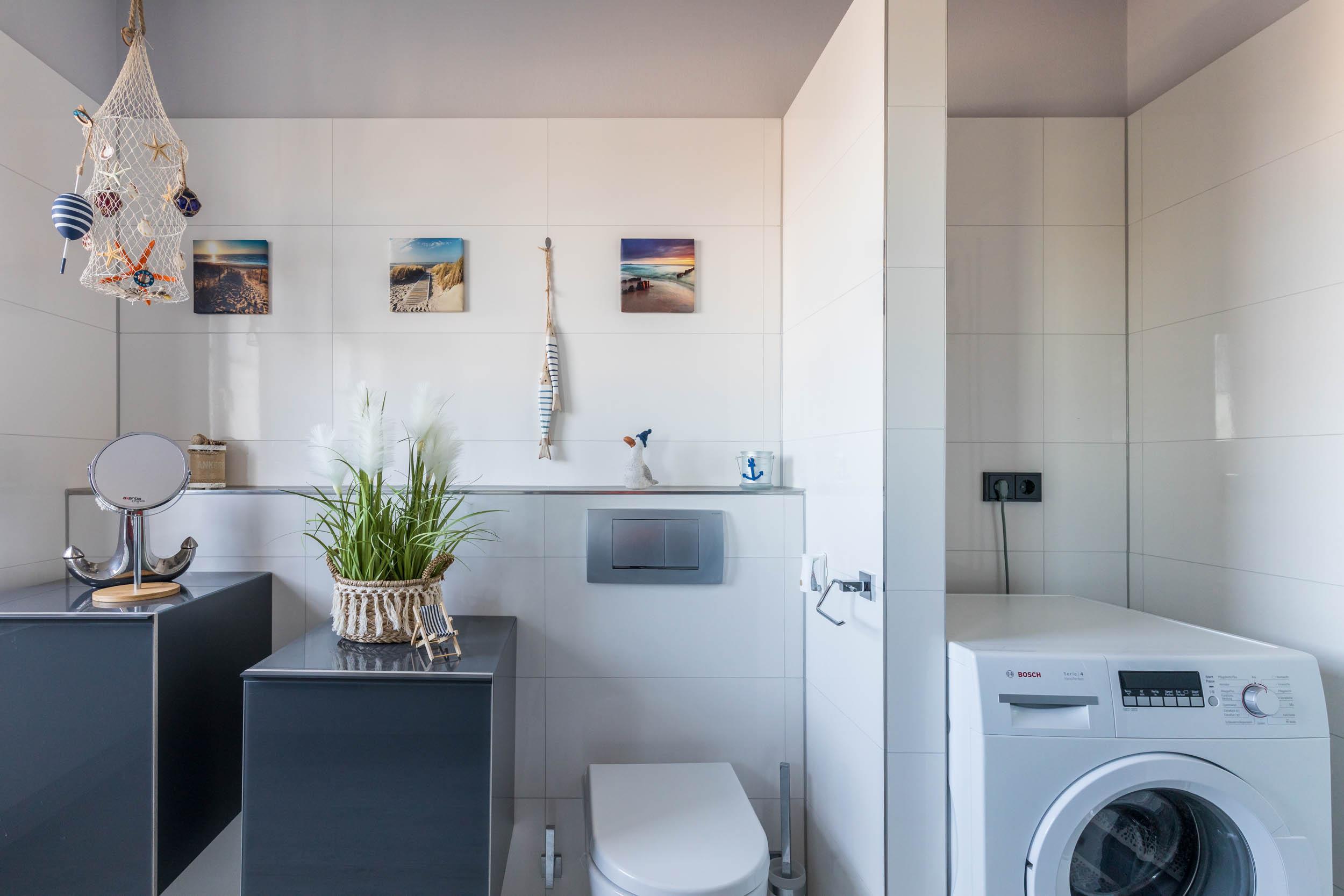 Das großzügige helle Badezimmer mit Fenster bietet eine Dusche, Handtuchheizung, WC und auch eine Waschmaschine.