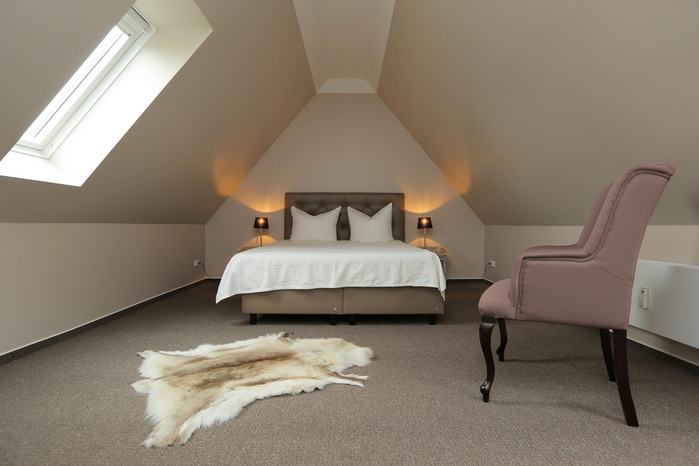 Das zweite Schlafzimmer befindet sich dann in 2. Ebene, im Dachgeschoss. Dieses Schlafzimmer ist ebenfalls, wie das Wohnzimmer, mit TV ausgestattet. Für Ihre Garderobe finden Sie hier eine Kommode. Auch hier sorgt ein bequemes Boxspringbett für wohligen Schlaf.