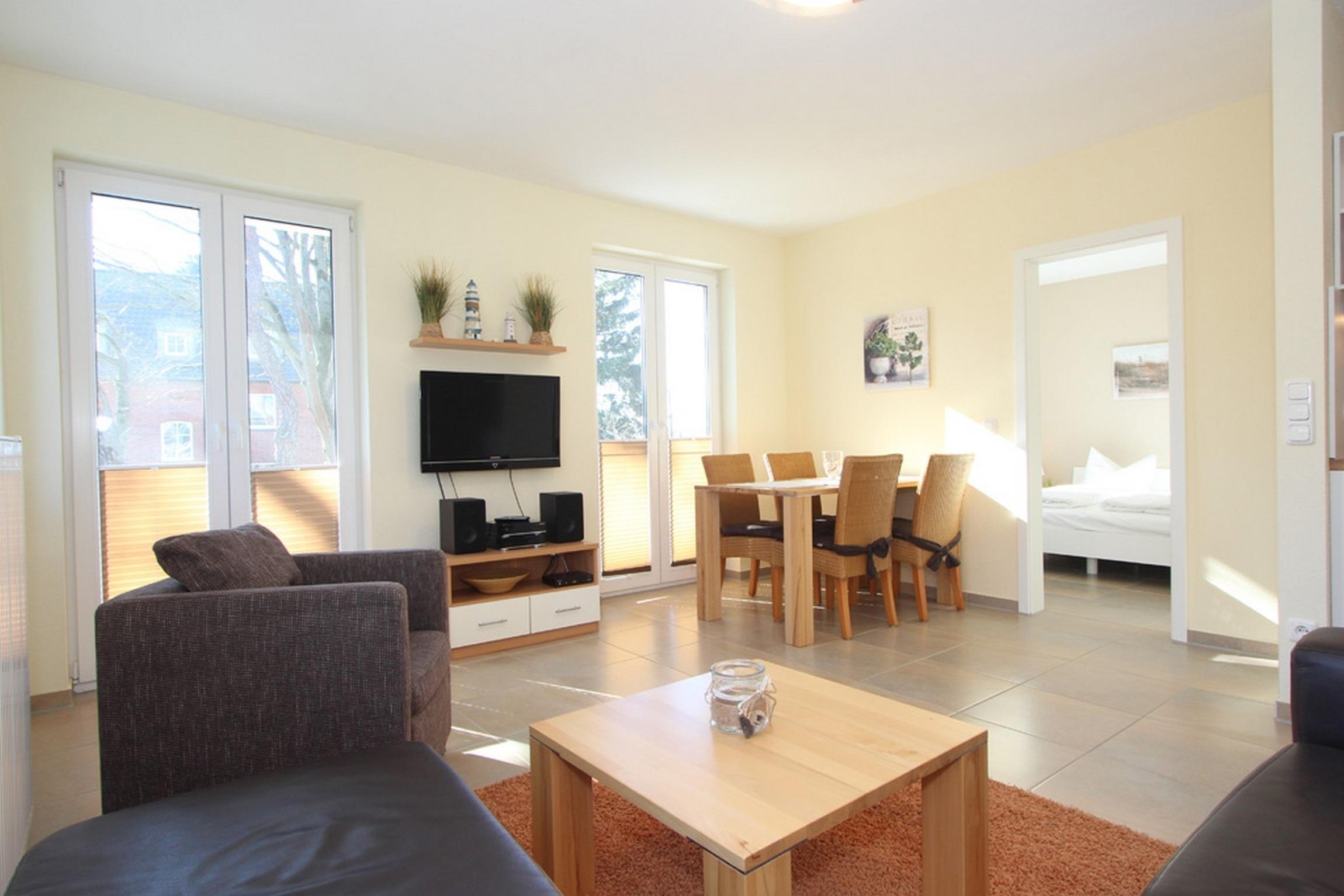 Diese modern und stimmig eingerichtete etwa 56qm große 3-Zimmer-Ferienwohnung im 1.OG bietet Platz für bis zu 4 Gäste + 1 Kleinkind und ist bequem mit einem Fahrstuhl zu erreichen. Die bodentiefen Fenster sorgen für viel Tageslicht.