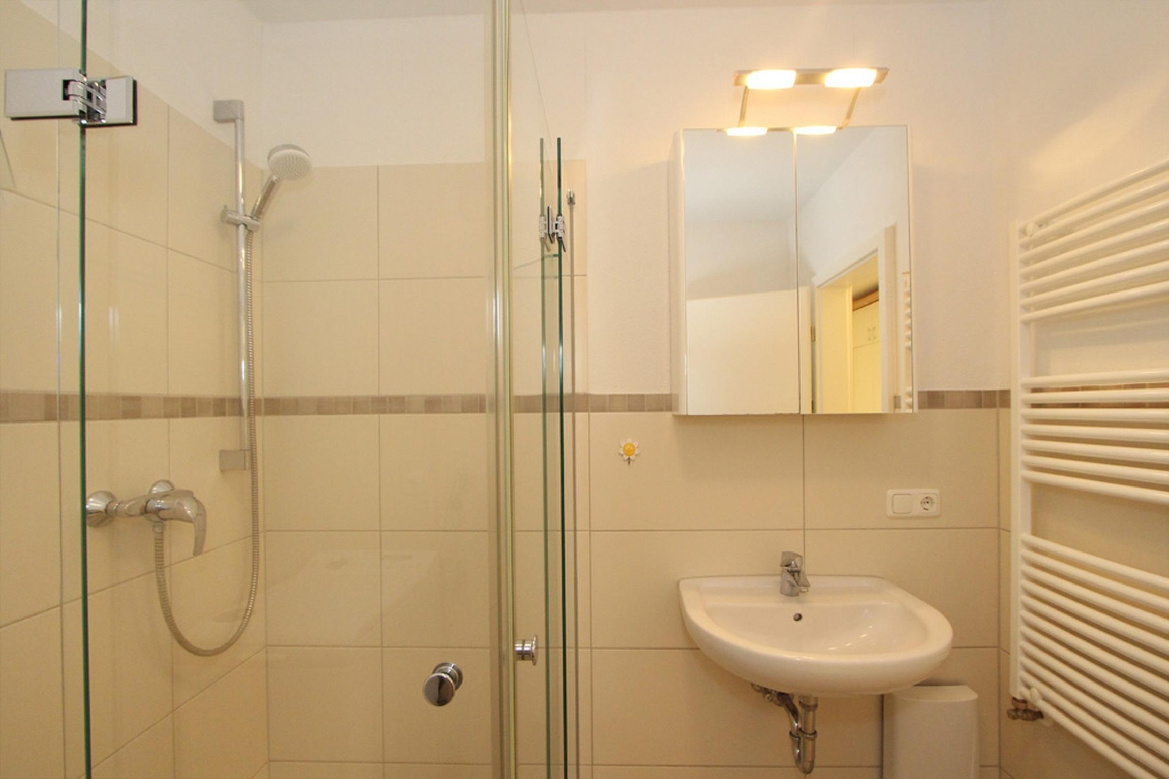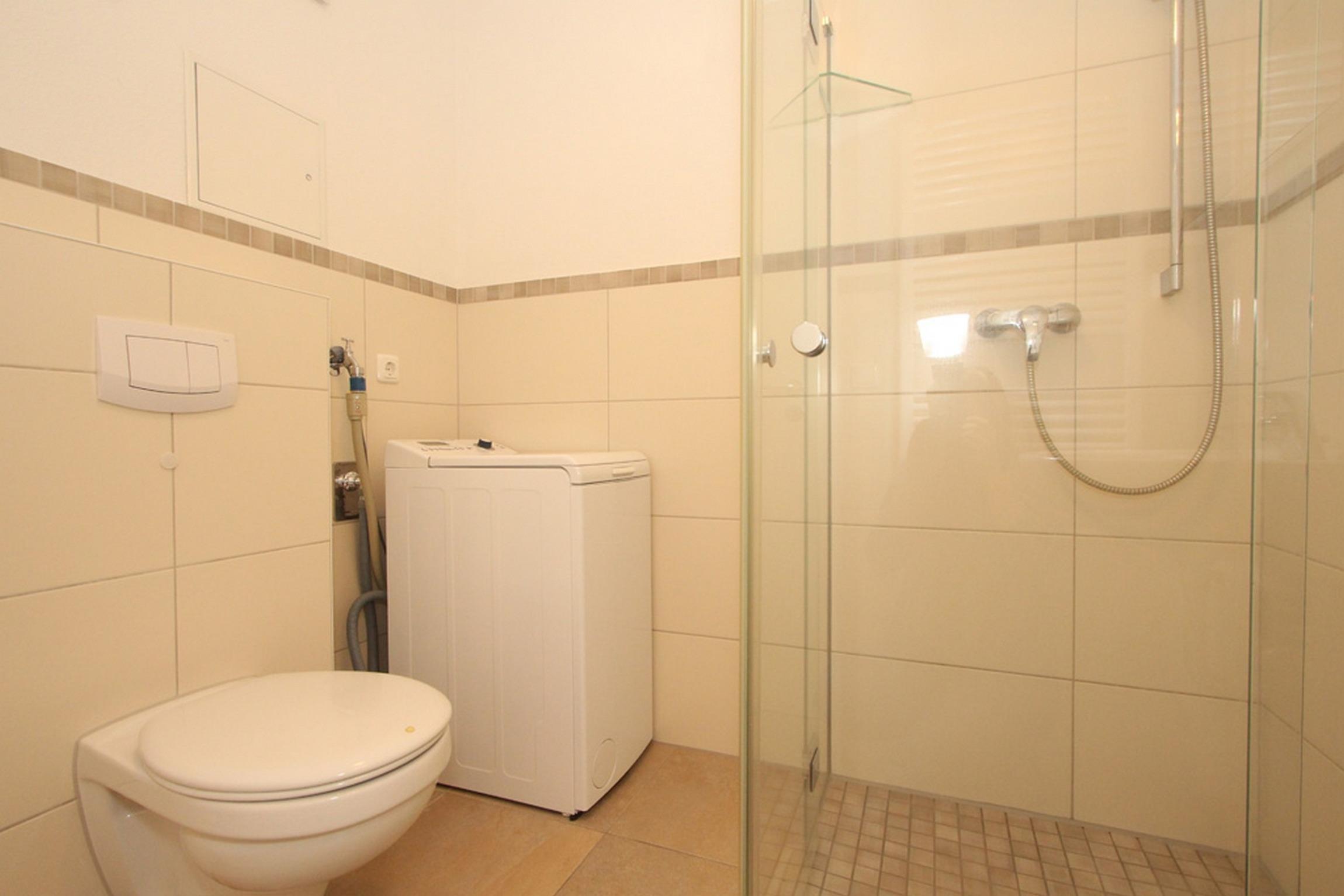 Im Bad finden Sie eine ebenerdige Dusche, ein WC, ein Handtuchtrockner, einen Duschhocker, einen Fön sowie eine Waschmaschine (Toplader) vor.