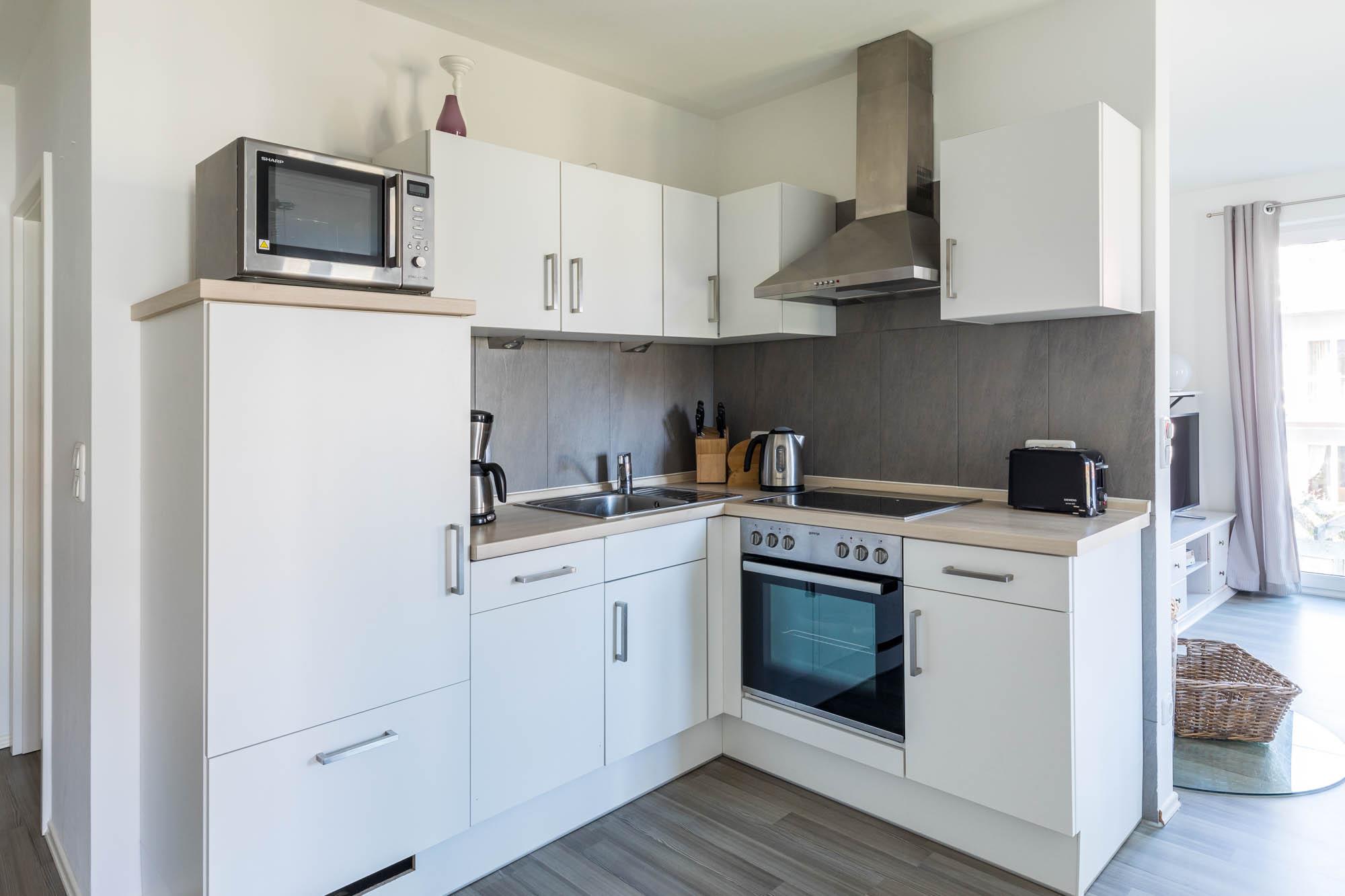 Die moderne Wohnung hat eine Einbauküche, die durch Herd, Backofen, Kühlschrank mit Gefrierfach und vielen weiteren Geräten komplett ausgestattet ist. Für ein behagliches Frühstück sorgen in der Küche unter anderem Wasserkocher, Toaster und Kaffeemaschine. Natürlich ist ausreichend Geschirr und Besteck für vier Gäste vorhanden.