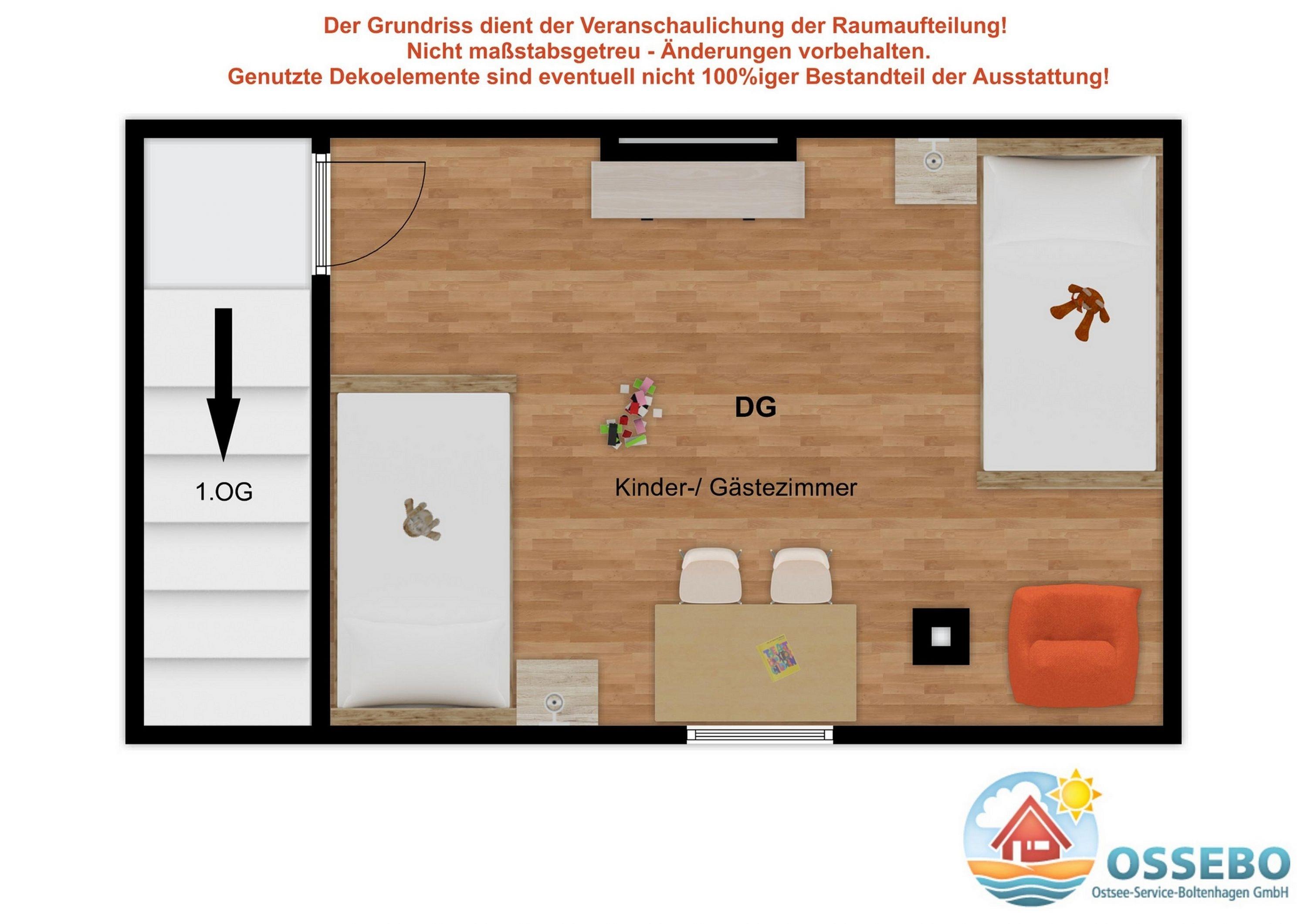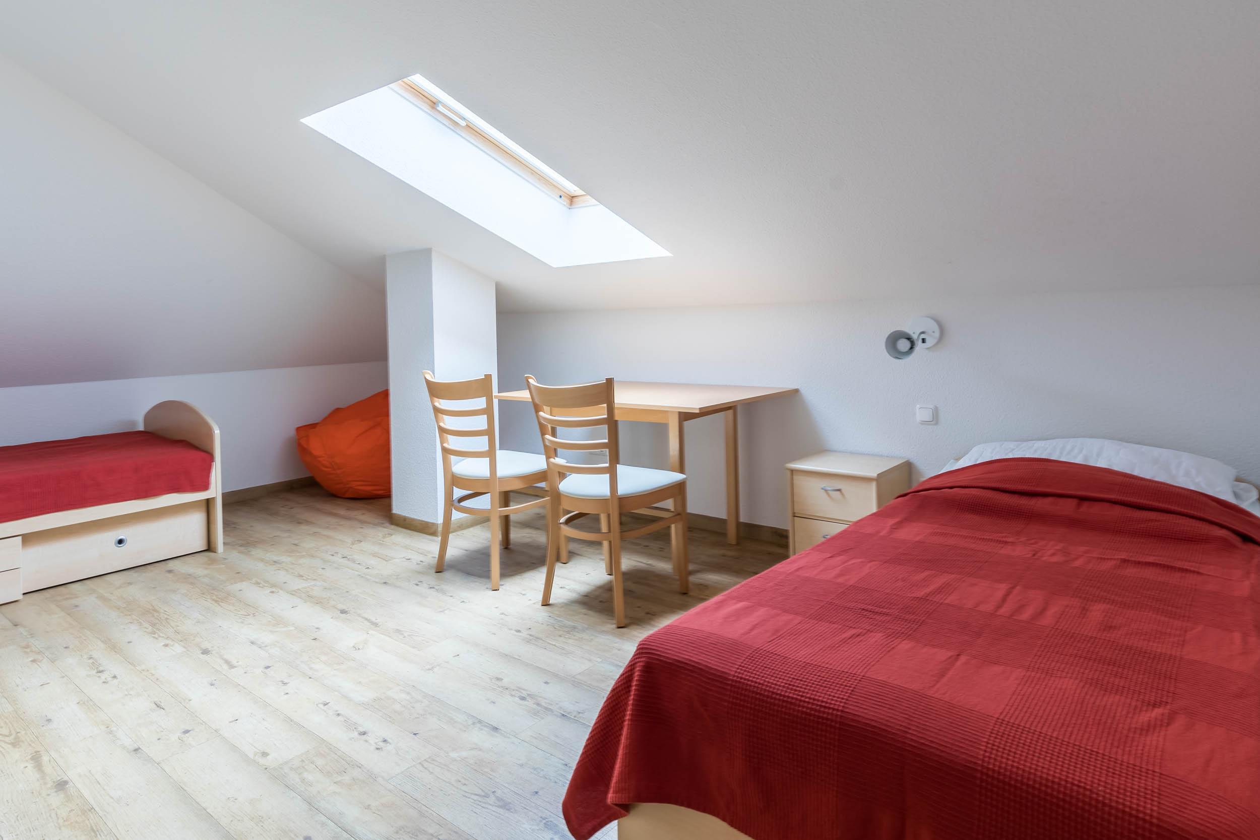 Das zweite Schlafzimmer/ Gästezimmer finden Sie in der 2. Wohnebene, im DG und bietet zwei Einzelbetten, wovon bei einem noch ein zusätzliches Bett ausgezogen werden kann und somit einen 5. Schlafplatz schafft. Weiterhin können hier an dem Schreibtisch z.B. Urlaubspost geschrieben oder tolle Urlaubsbilder gemalt werden.