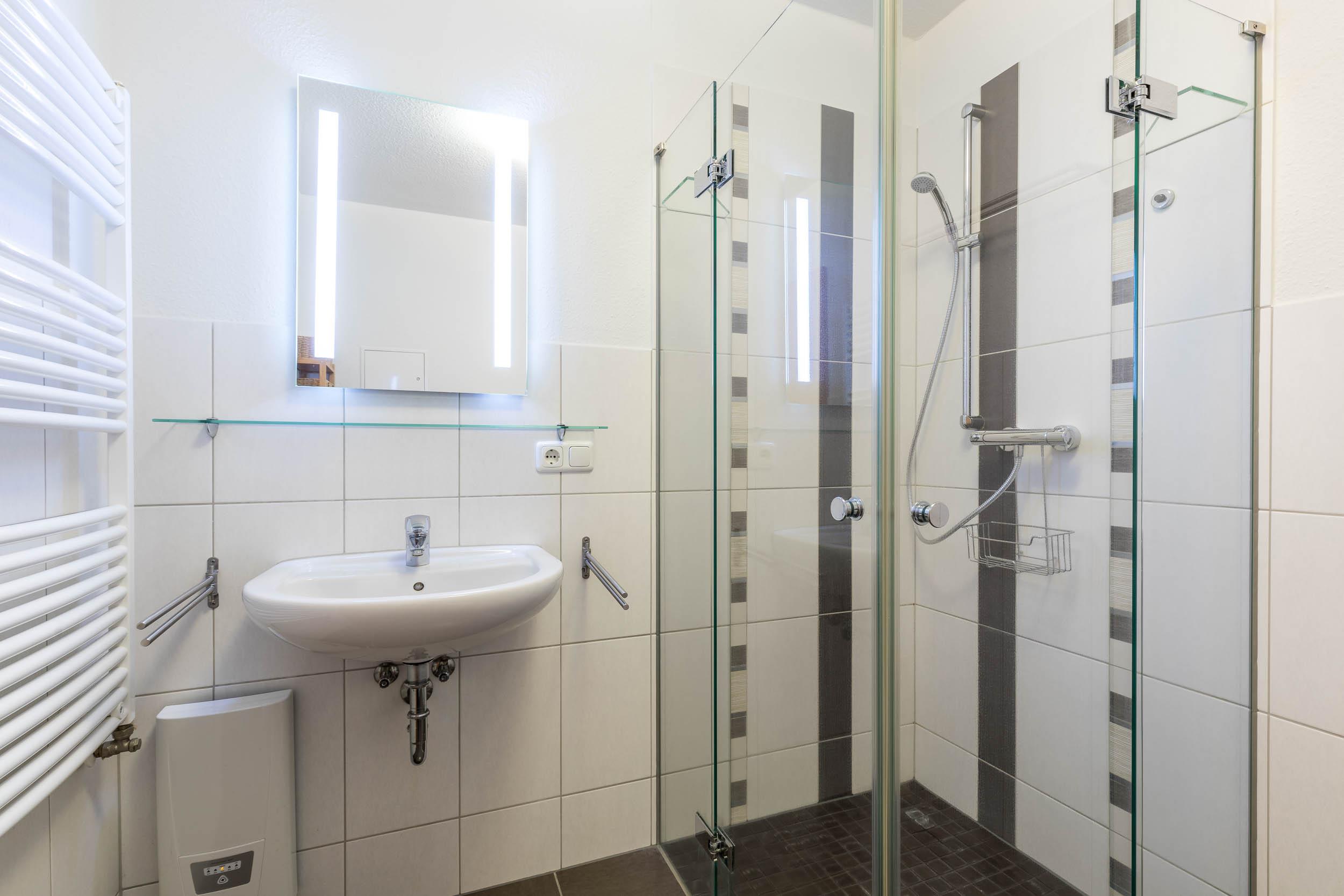 Ein modern eingerichtetes Duschbad auf selbiger Etage mit ebenerdiger Dusche komplettiert das geschmackvolle Quartier für den unvergesslichen Ostseeurlaub in Boltenhagen.