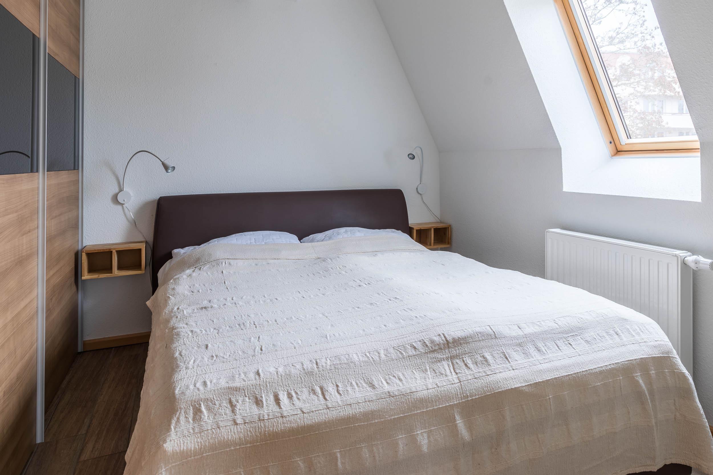 Auch eines der beiden Schlafzimmer ist im unteren Bereich der Wohnung mit einem Doppelbett und großem Kleiderschrank hergerichtet.